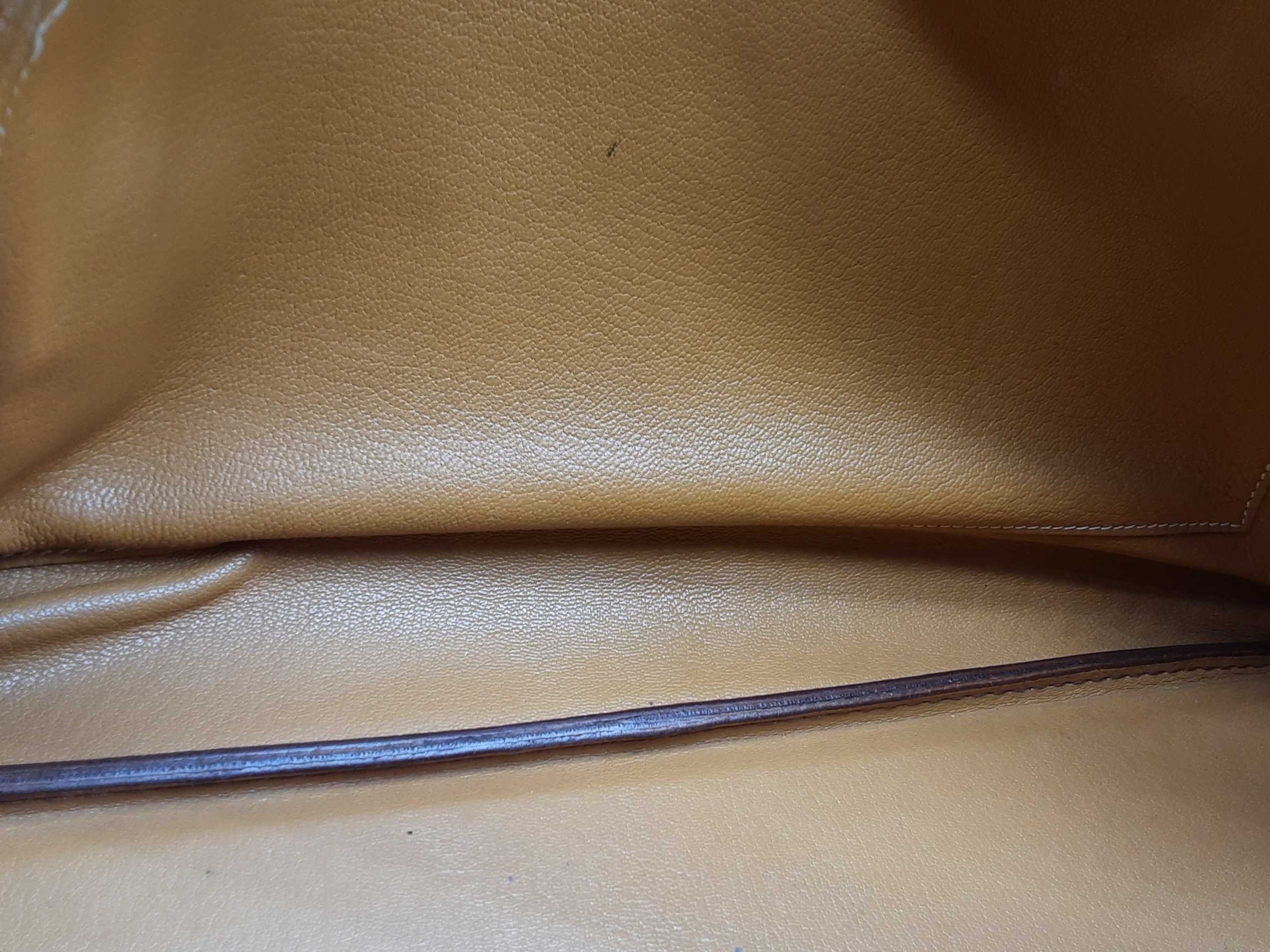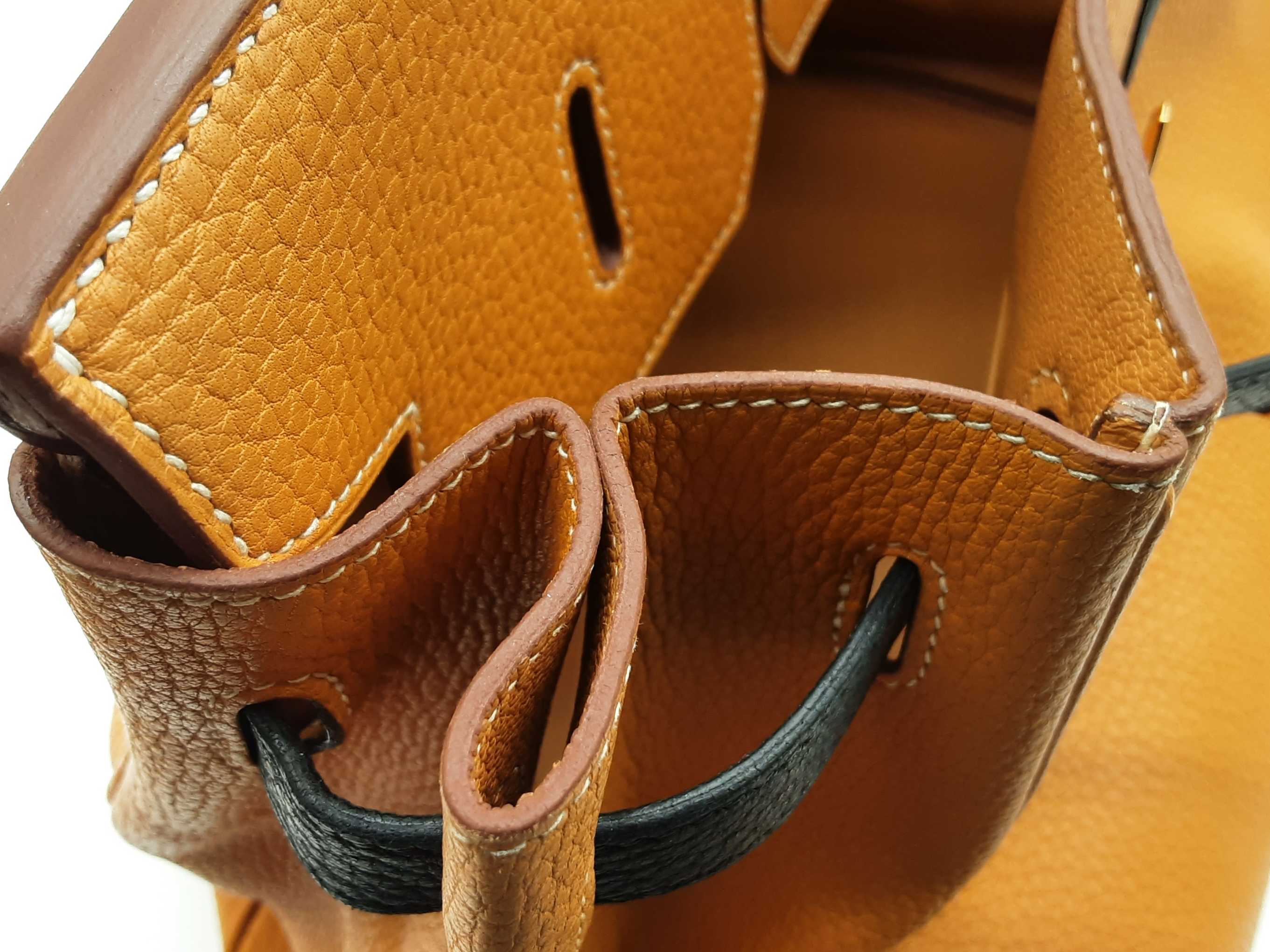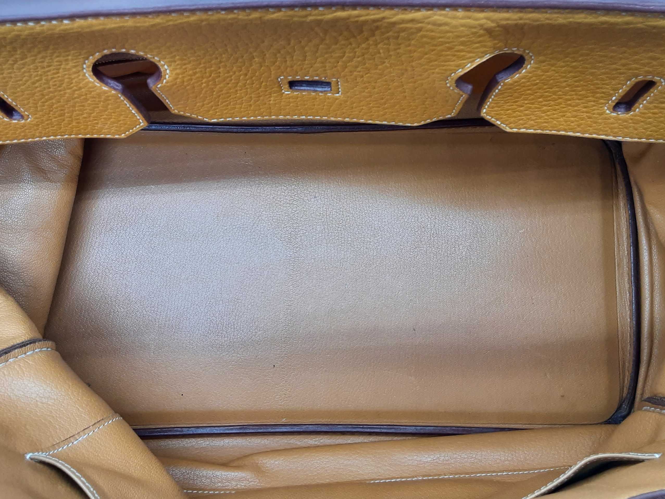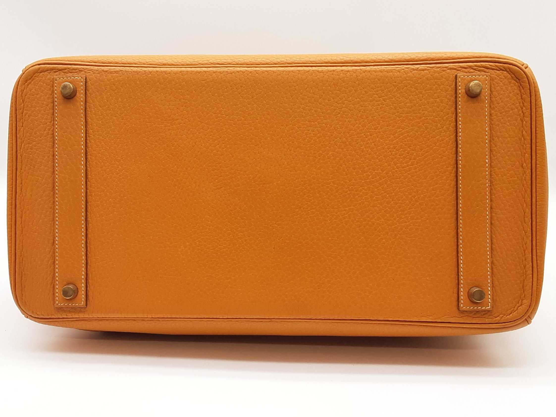 144020016141Hermes Birkin 40CM Gold Noir Black Clemence Gold Hardware Handbag. Length 16 IN X Height 11 IN X Width 8 IN X Drop 4.25 IN. Date Code Square E (2001). Entrupy Certificate #TJH6G2C. Good Pre-owned Condition with creases, flap curved, scratches and wear on metal hardware, discoloration on metal feet, wear on edges, marks and scratches on interior, and stains and wear inside interior pockets. Note: There's a possibility bag has been repainted.