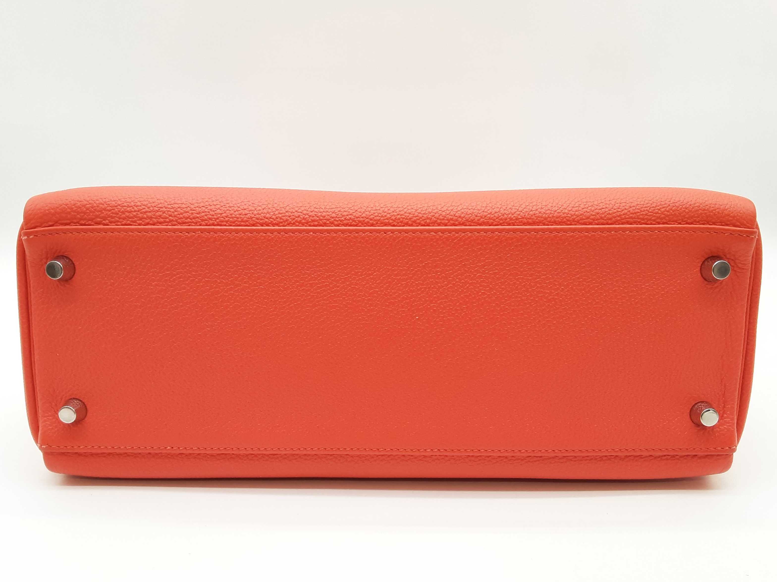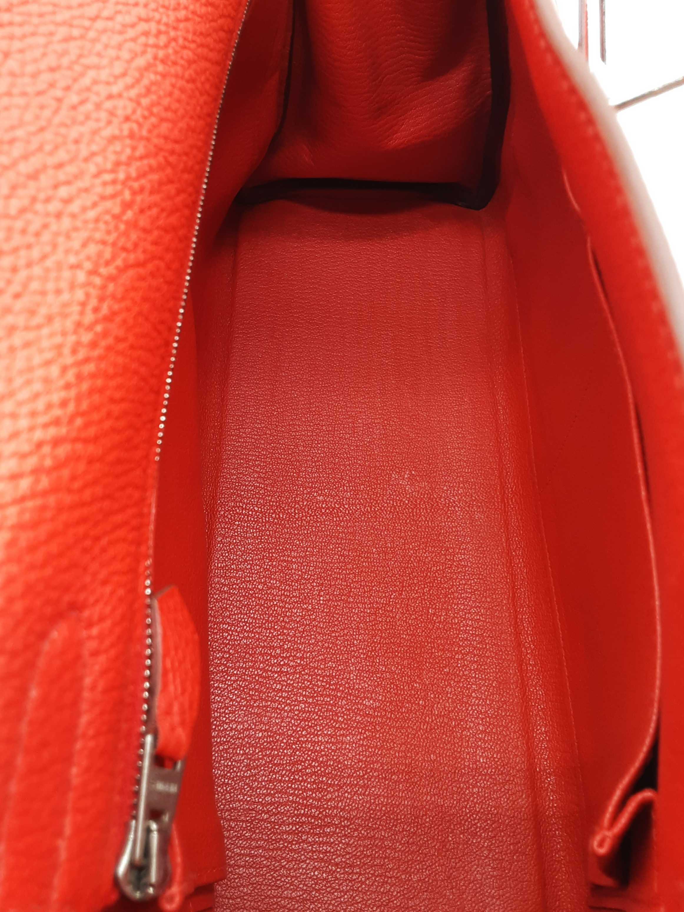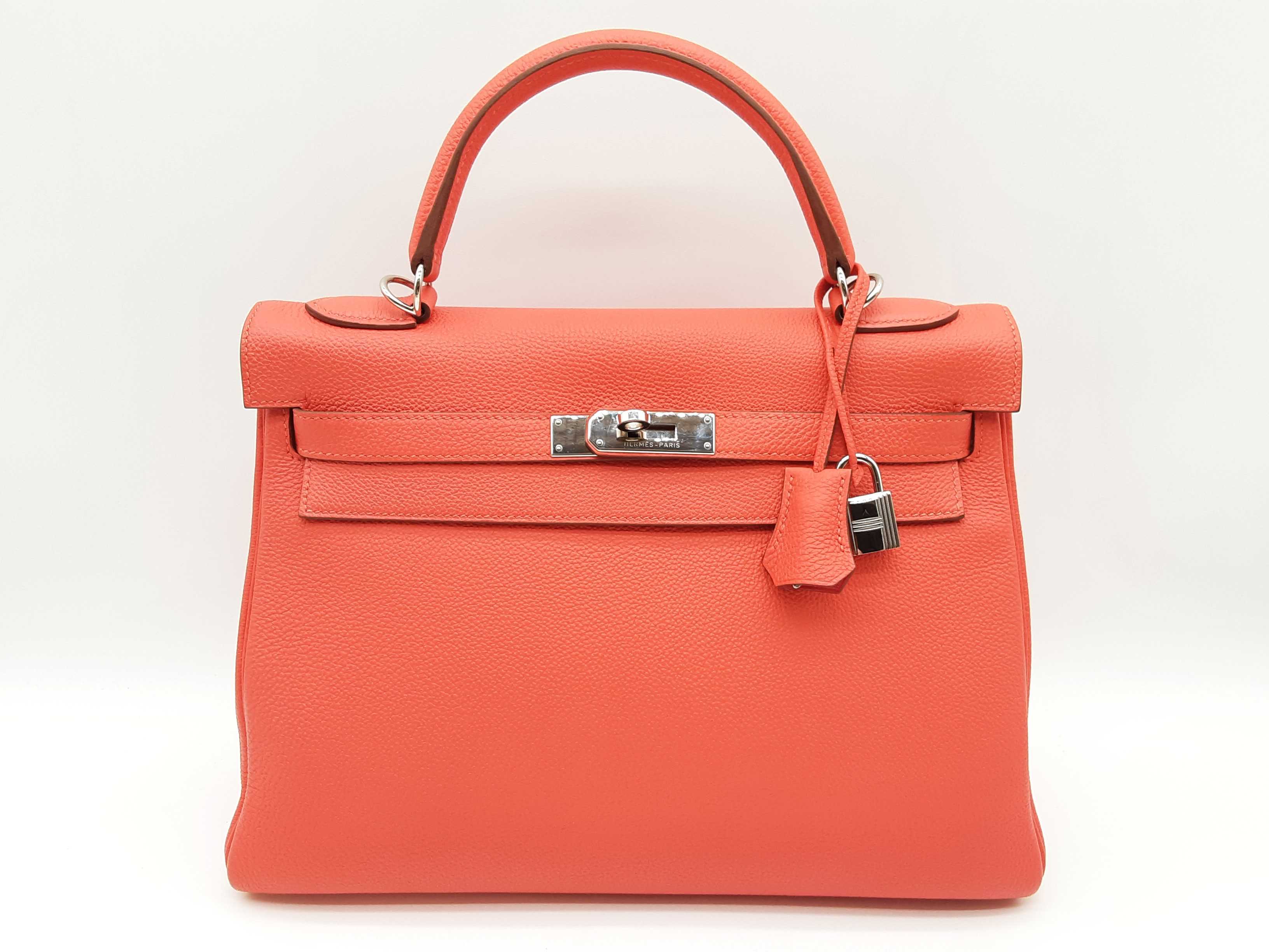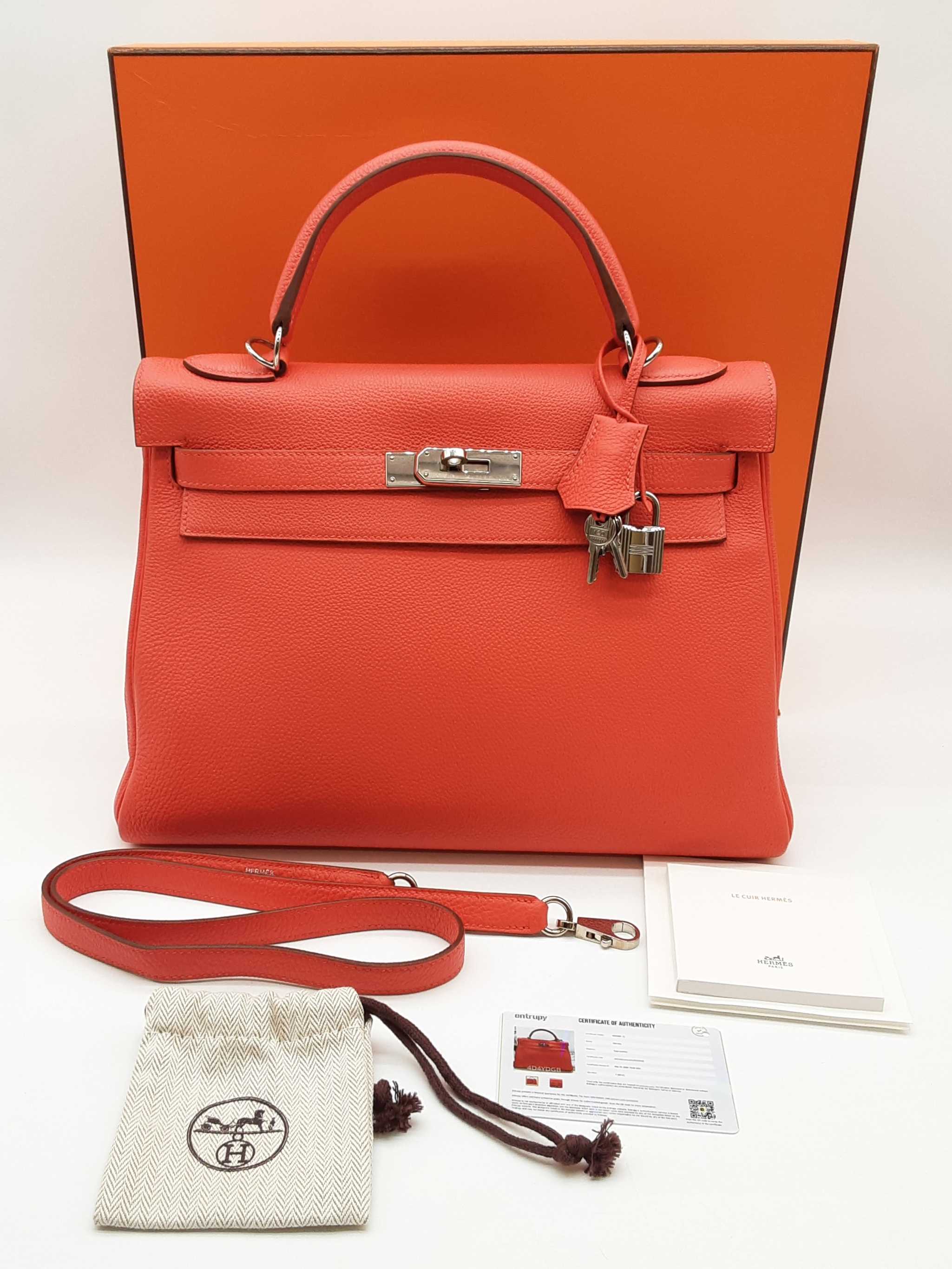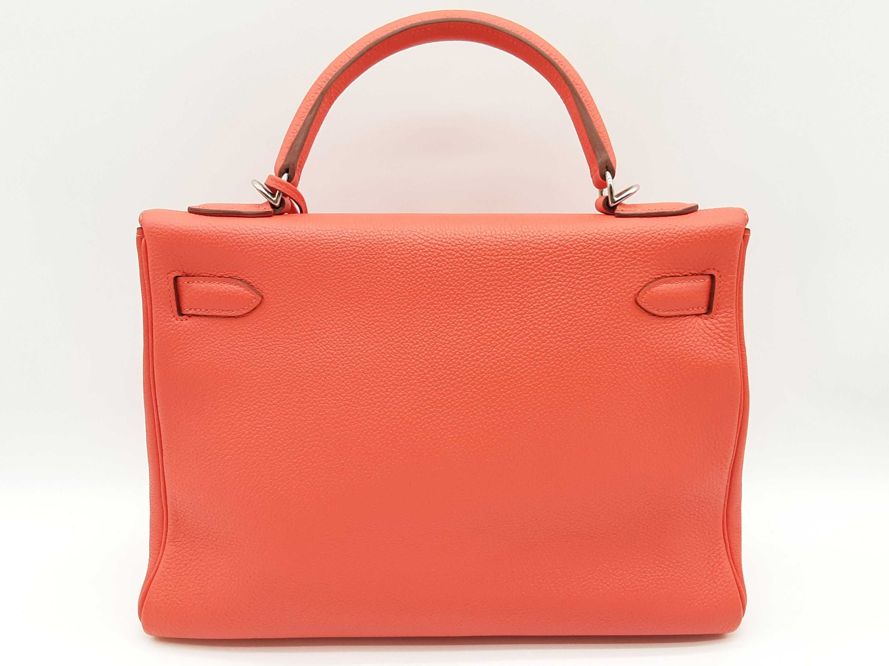 144020029912Hermes Kelly 32CM Rouge Pivoine Red Orange Togo Palladium Hardware Handbag. Length 13 IN X Height 9 IN X Width 5 IN X Handle Drop 3.5 IN. Strap Drop 17.5 IN. Date Code T (2015). Entrupy Certificate #4D4YDGB. Great Pre-owned Condition with creases, scratches on metal hardware, and marks in zipper pocket.
