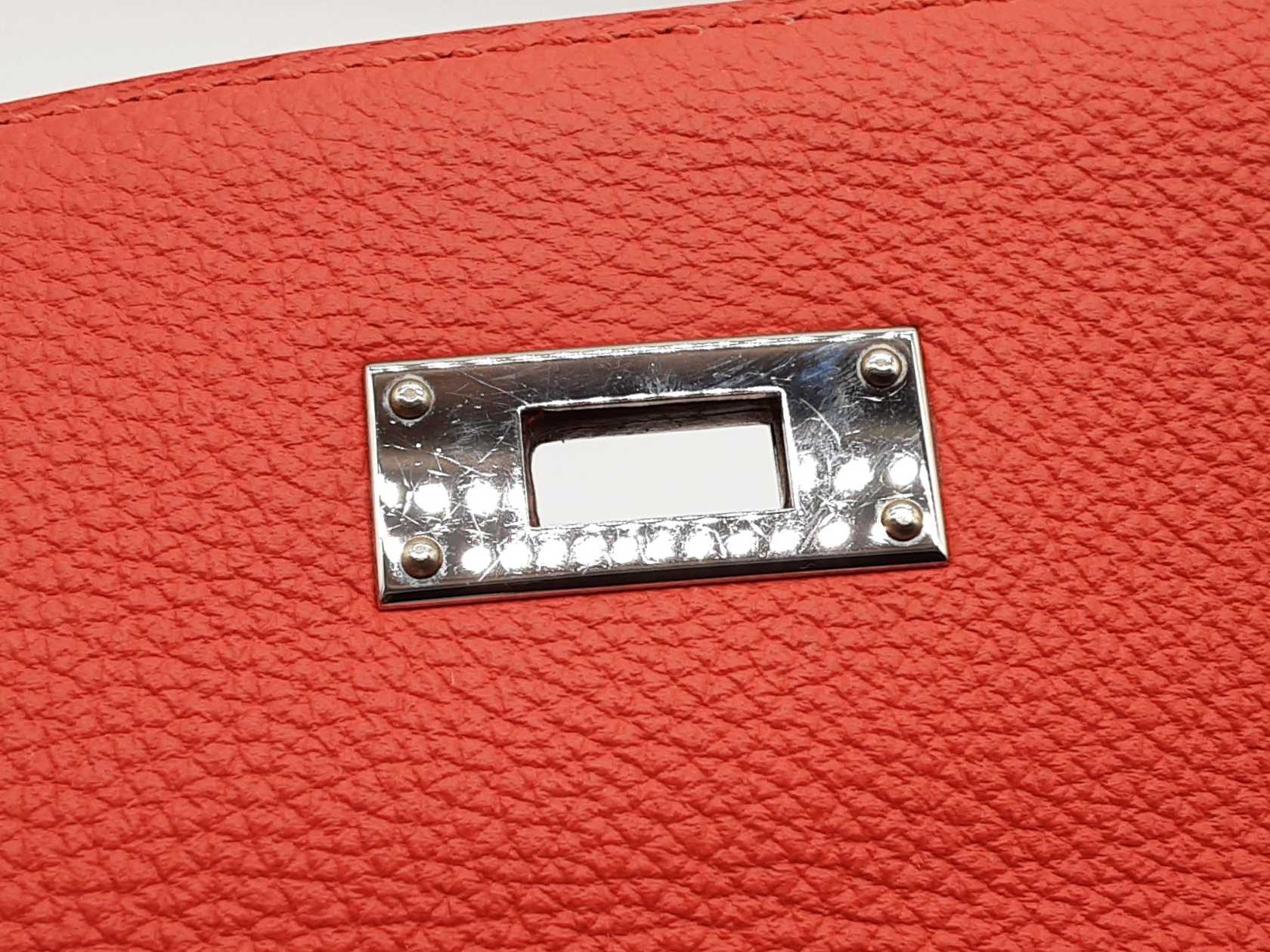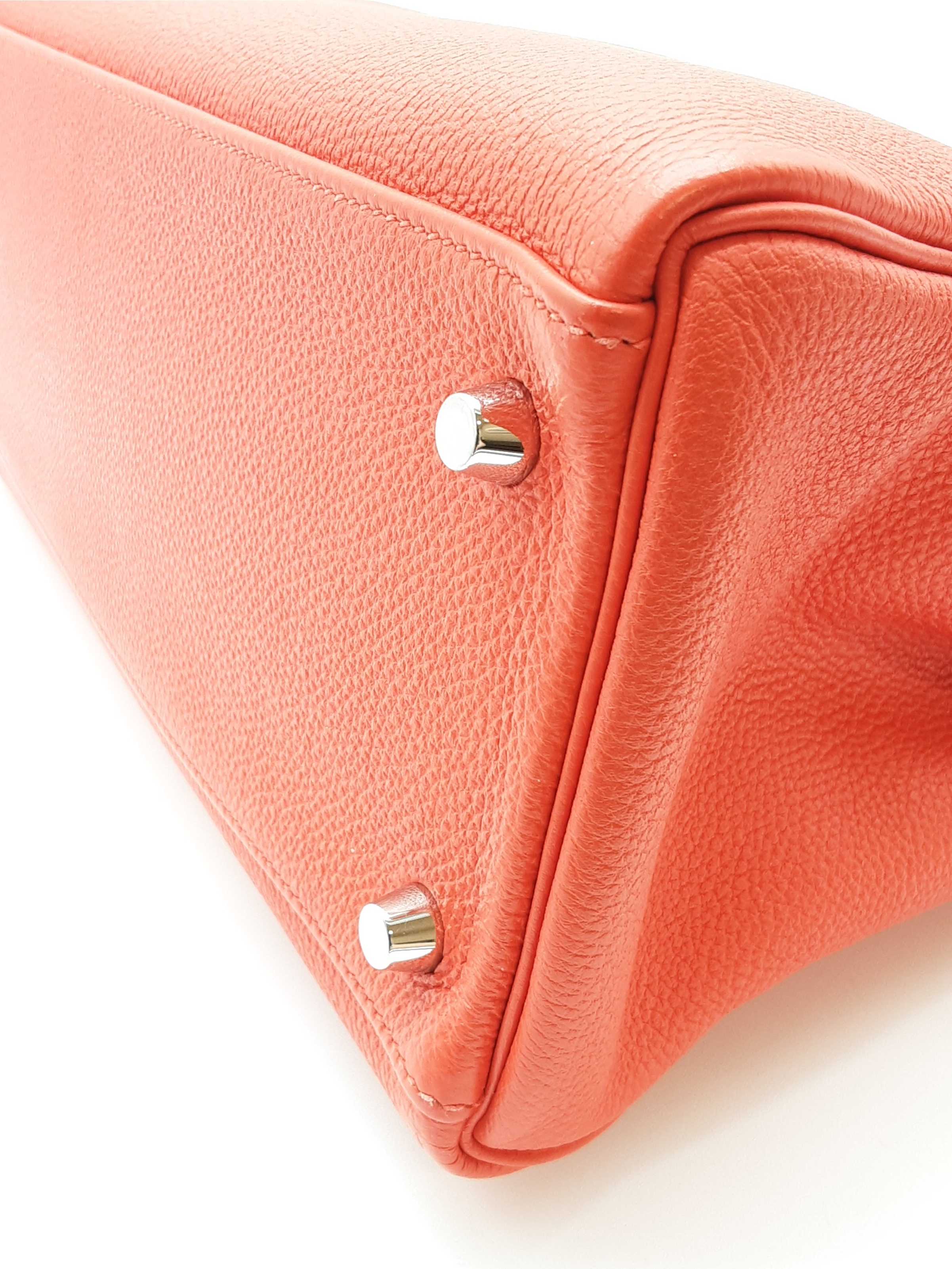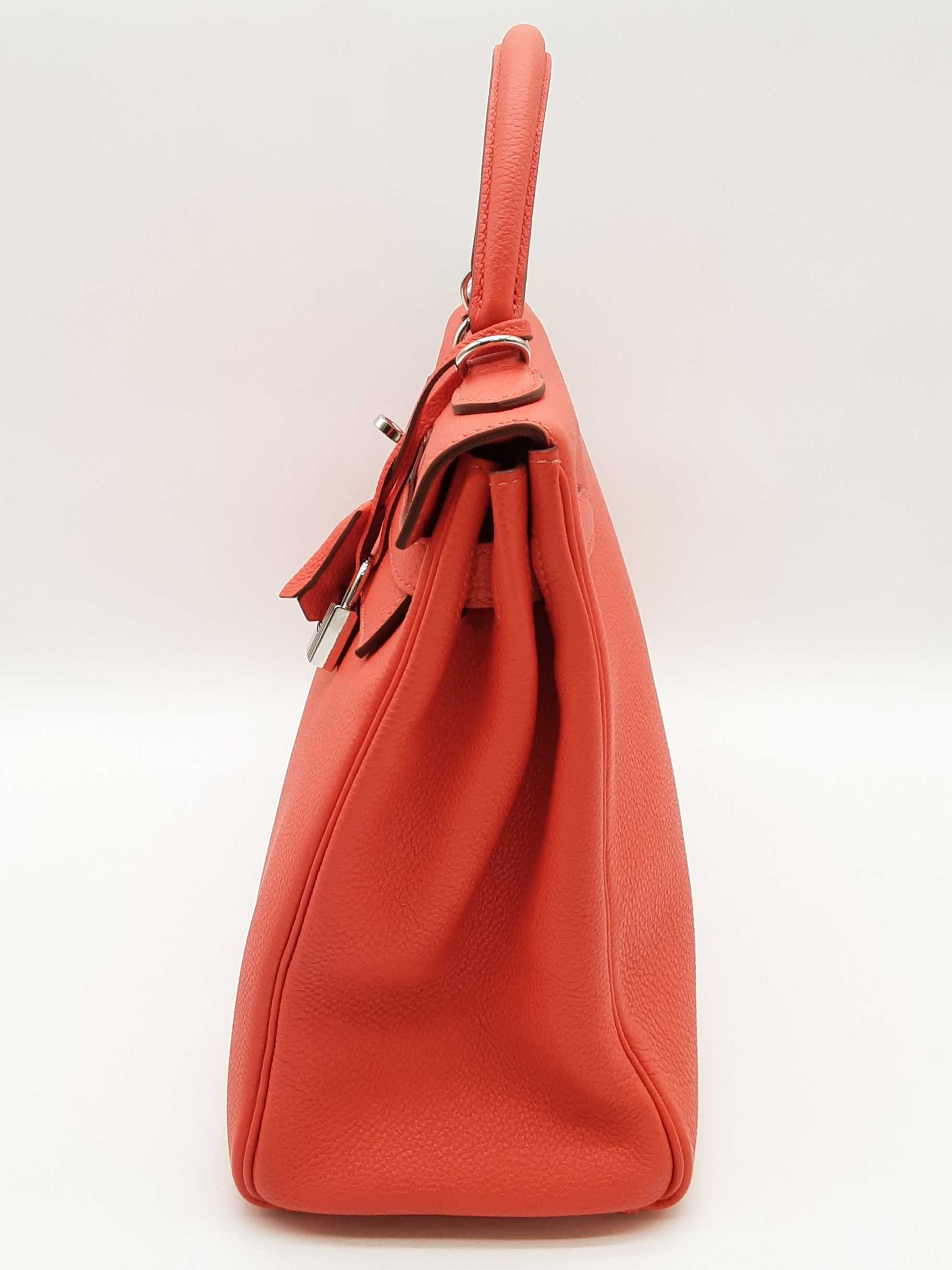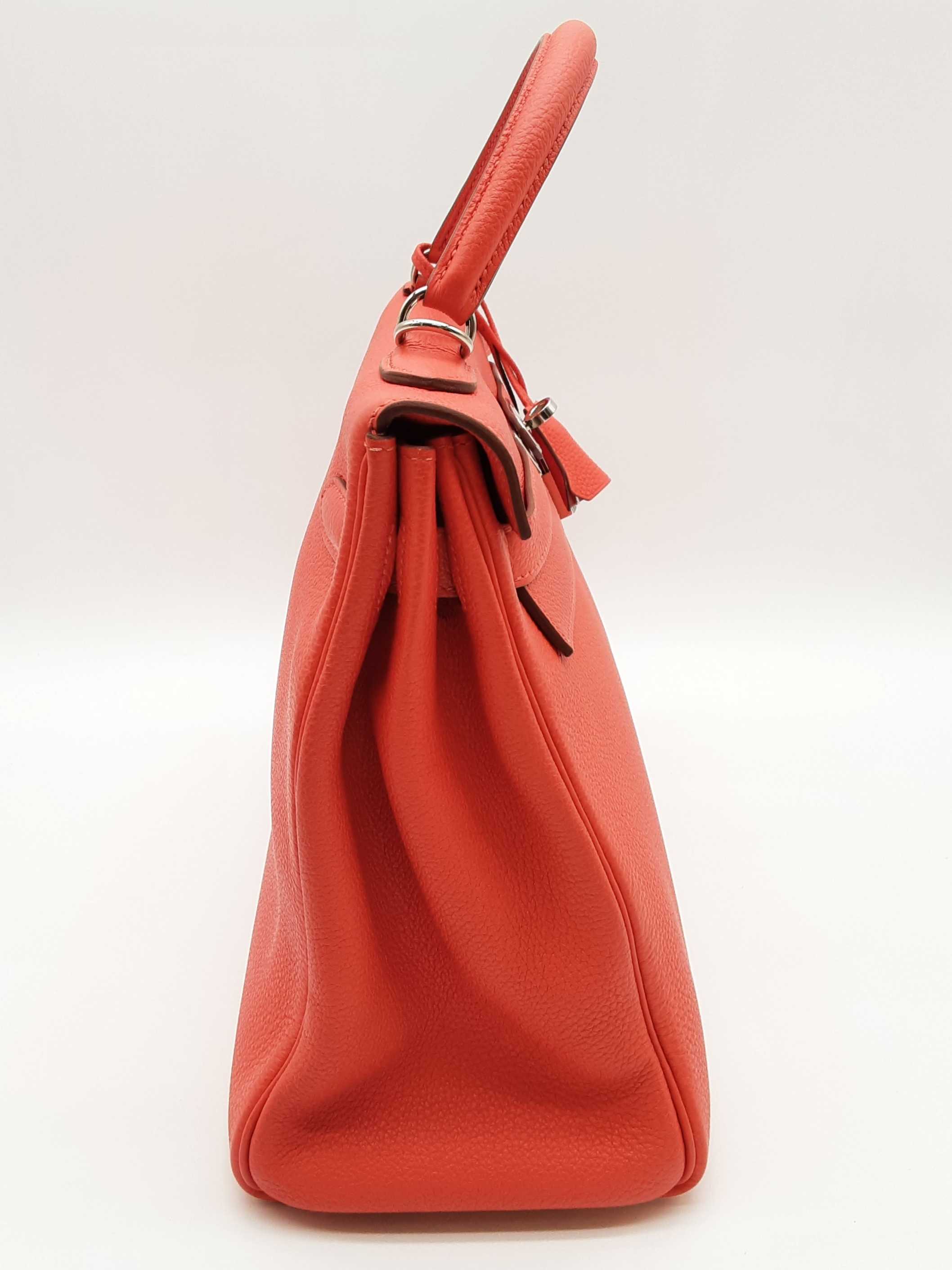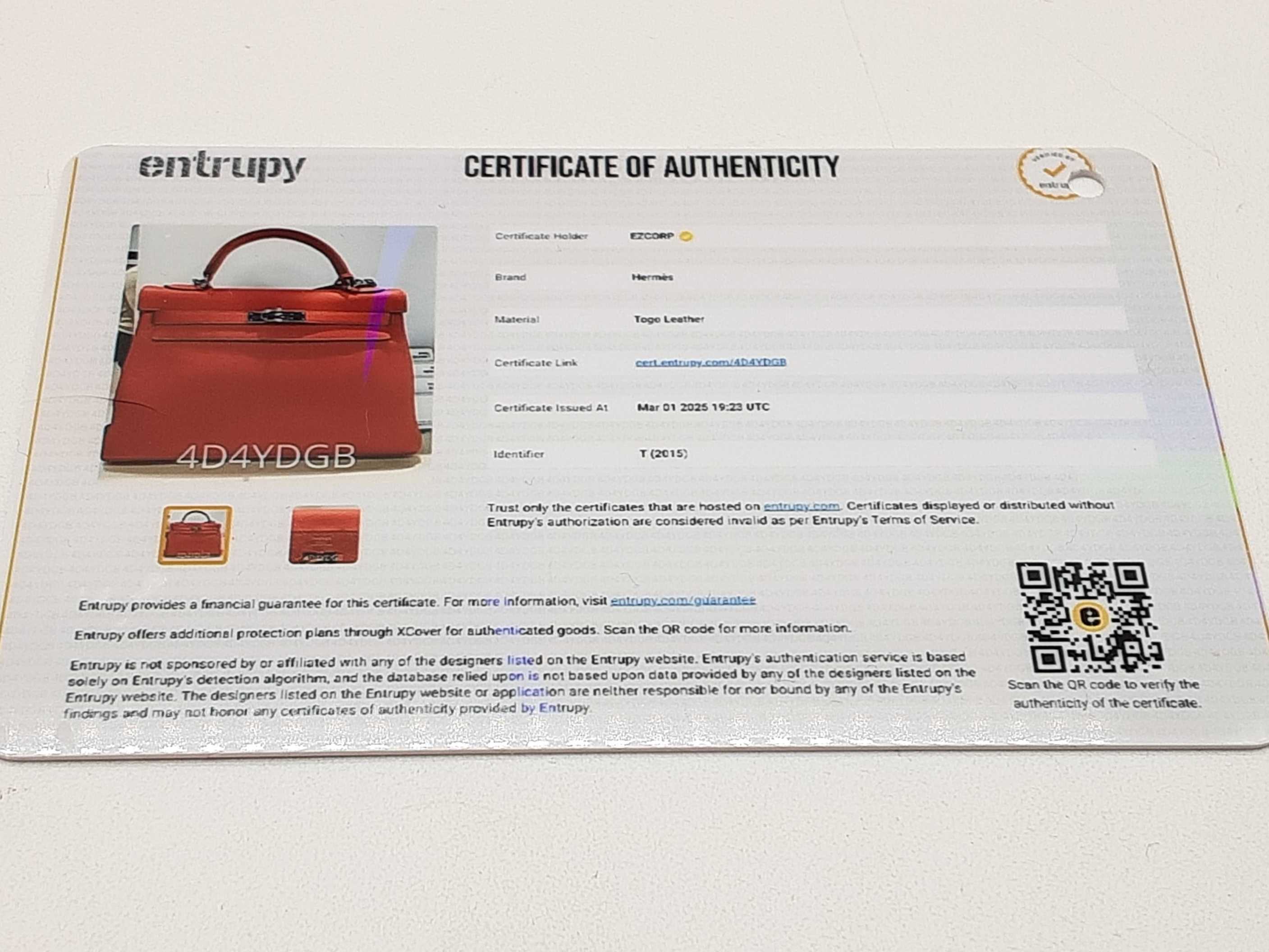 144020029912Hermes Kelly 32CM Rouge Pivoine Red Orange Togo Palladium Hardware Handbag. Length 13 IN X Height 9 IN X Width 5 IN X Handle Drop 3.5 IN. Strap Drop 17.5 IN. Date Code T (2015). Entrupy Certificate #4D4YDGB. Great Pre-owned Condition with creases, scratches on metal hardware, and marks in zipper pocket.