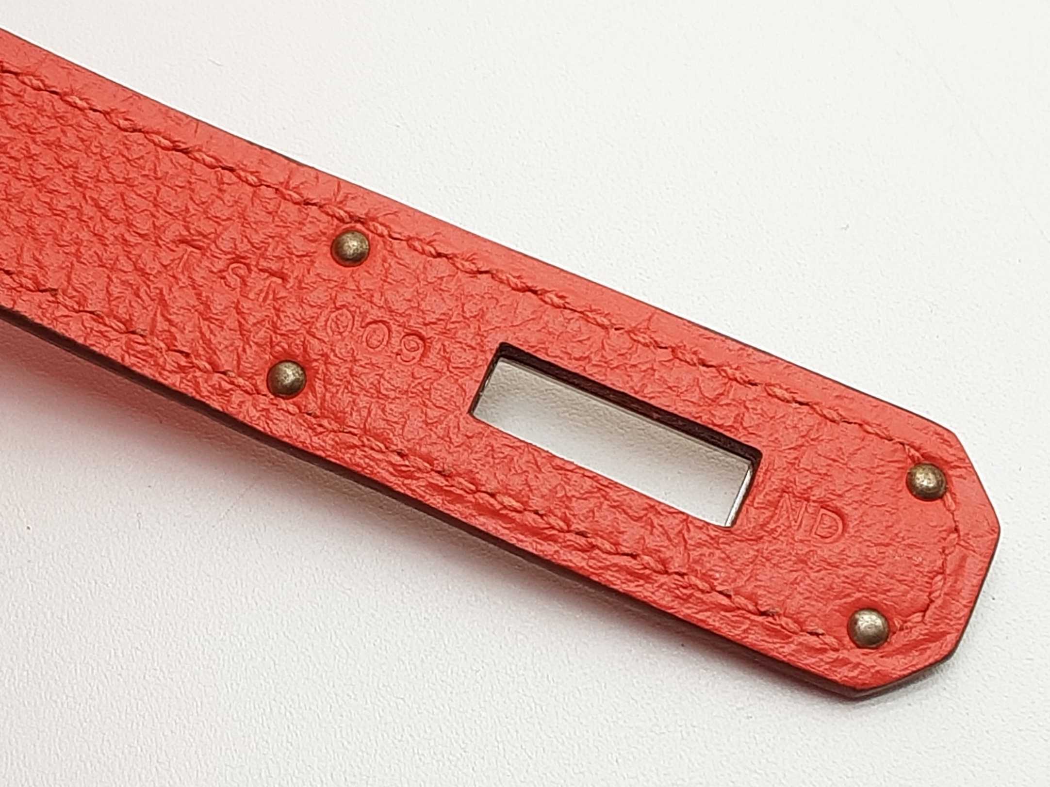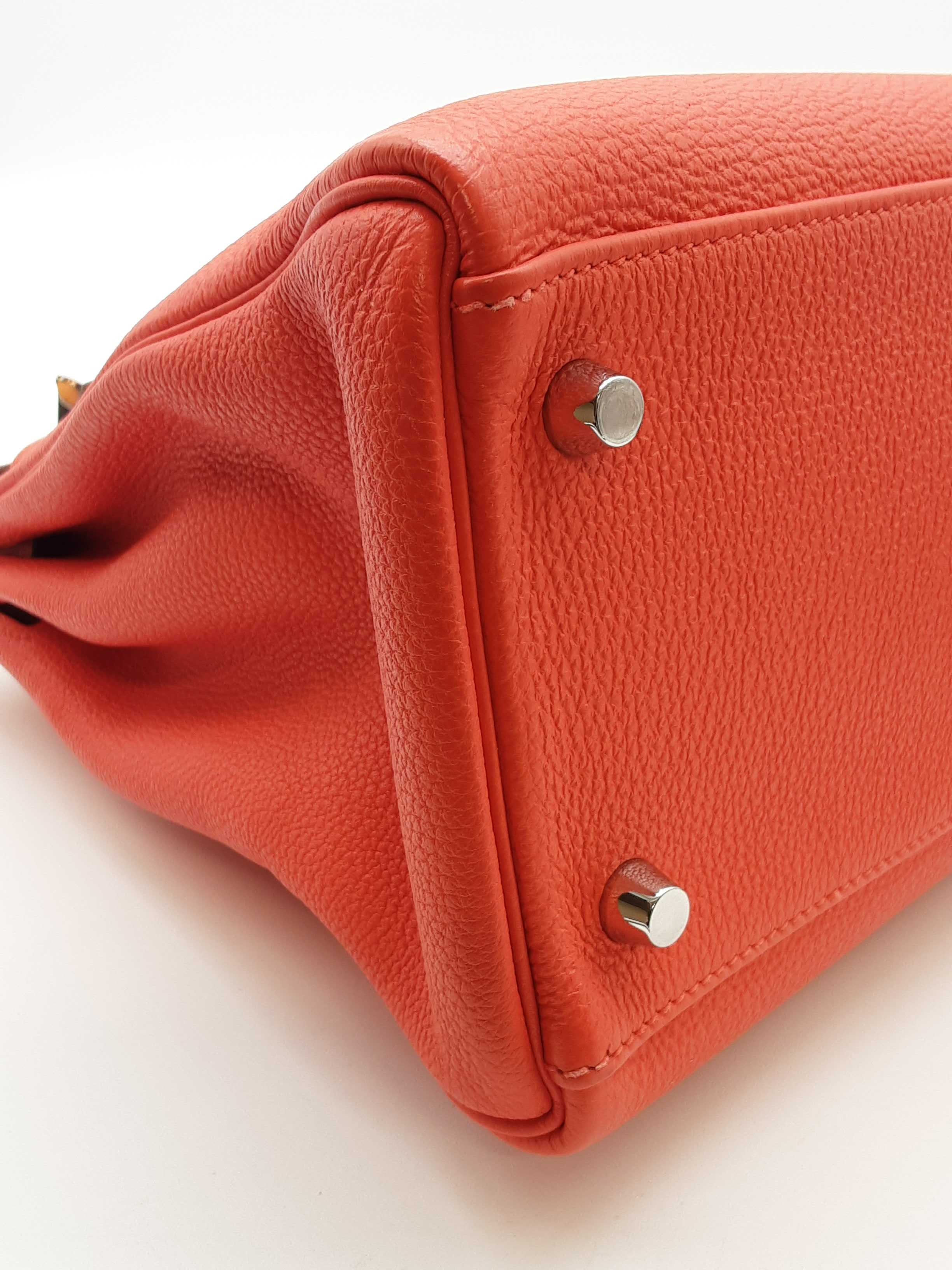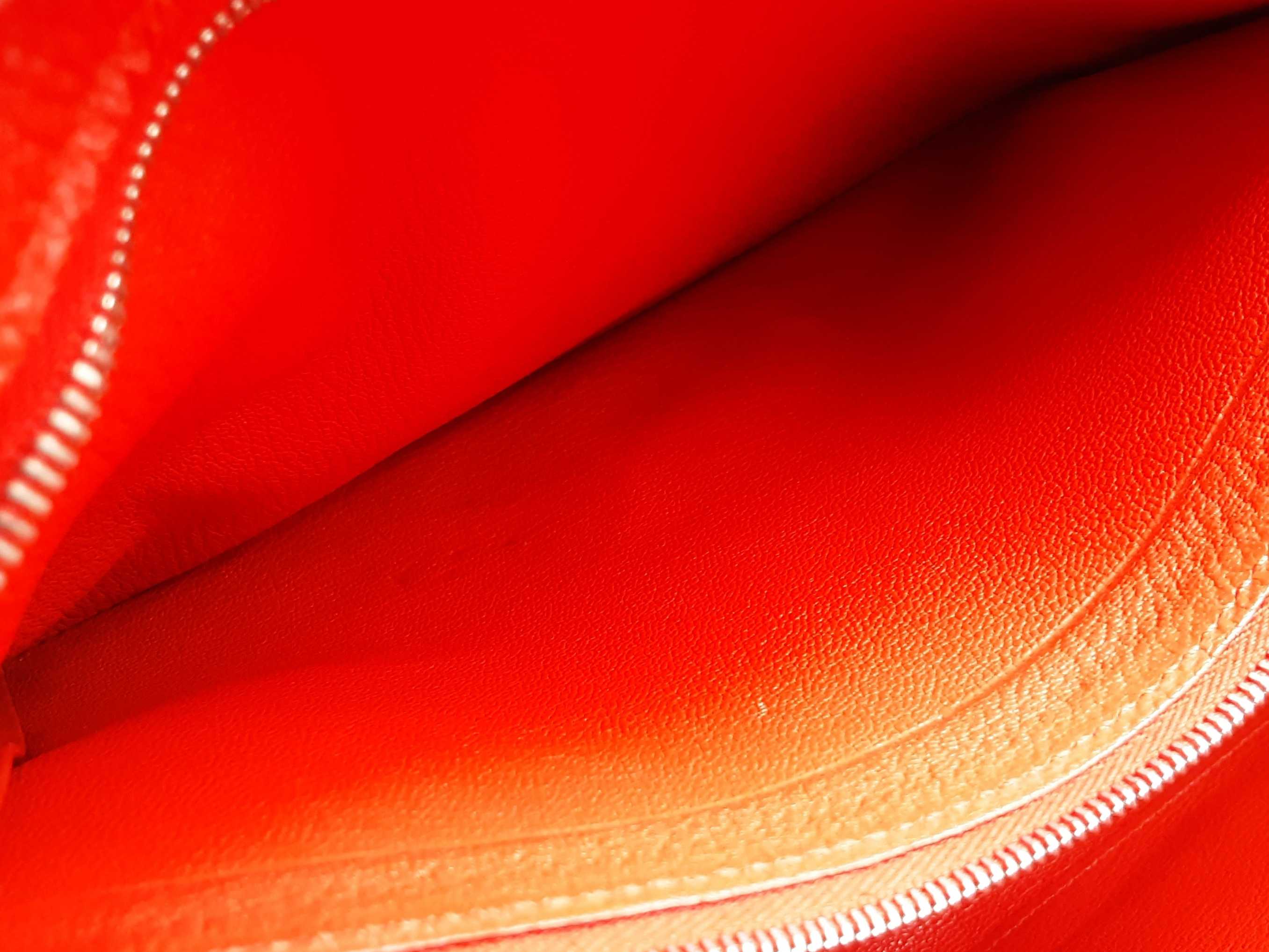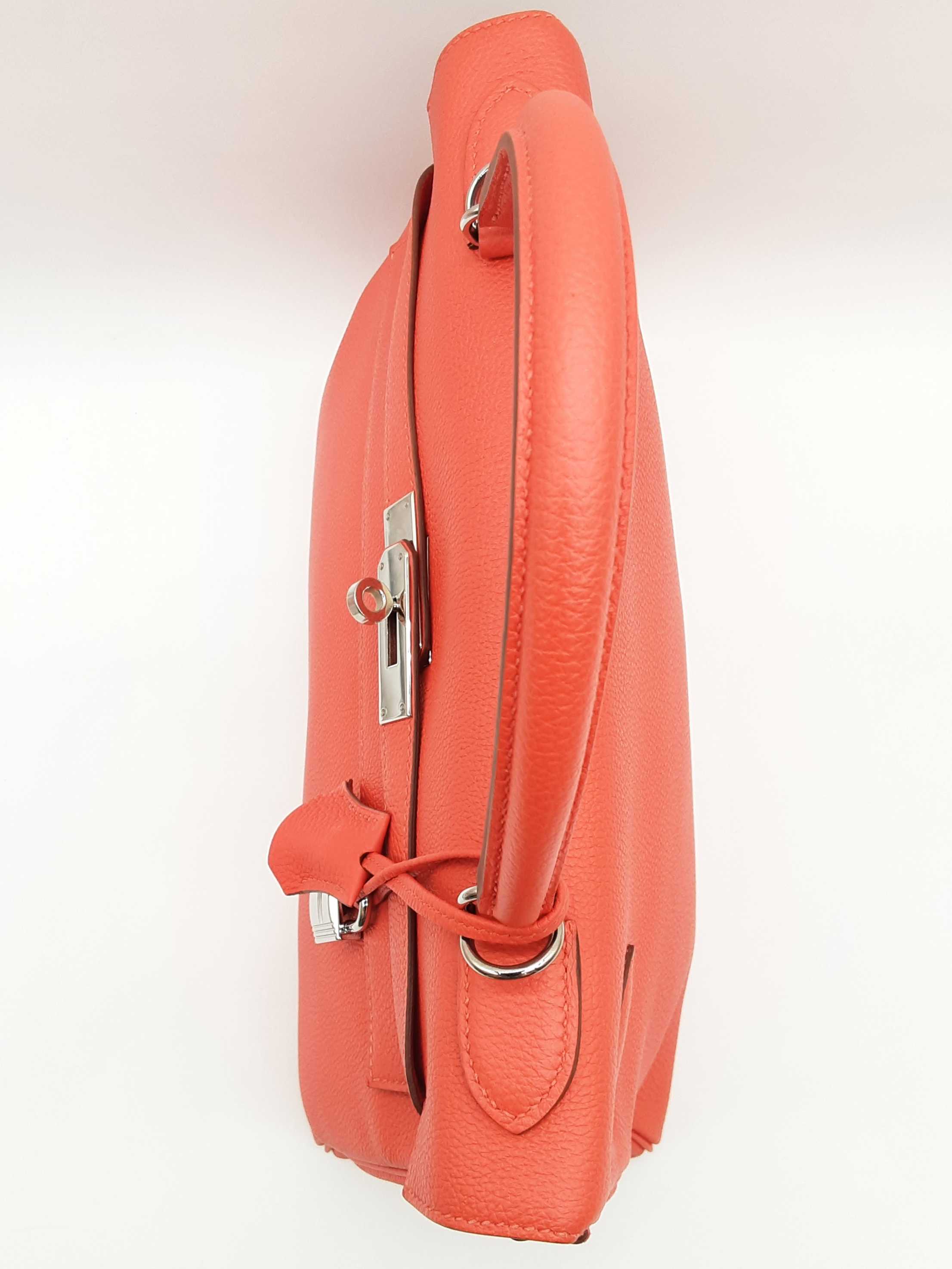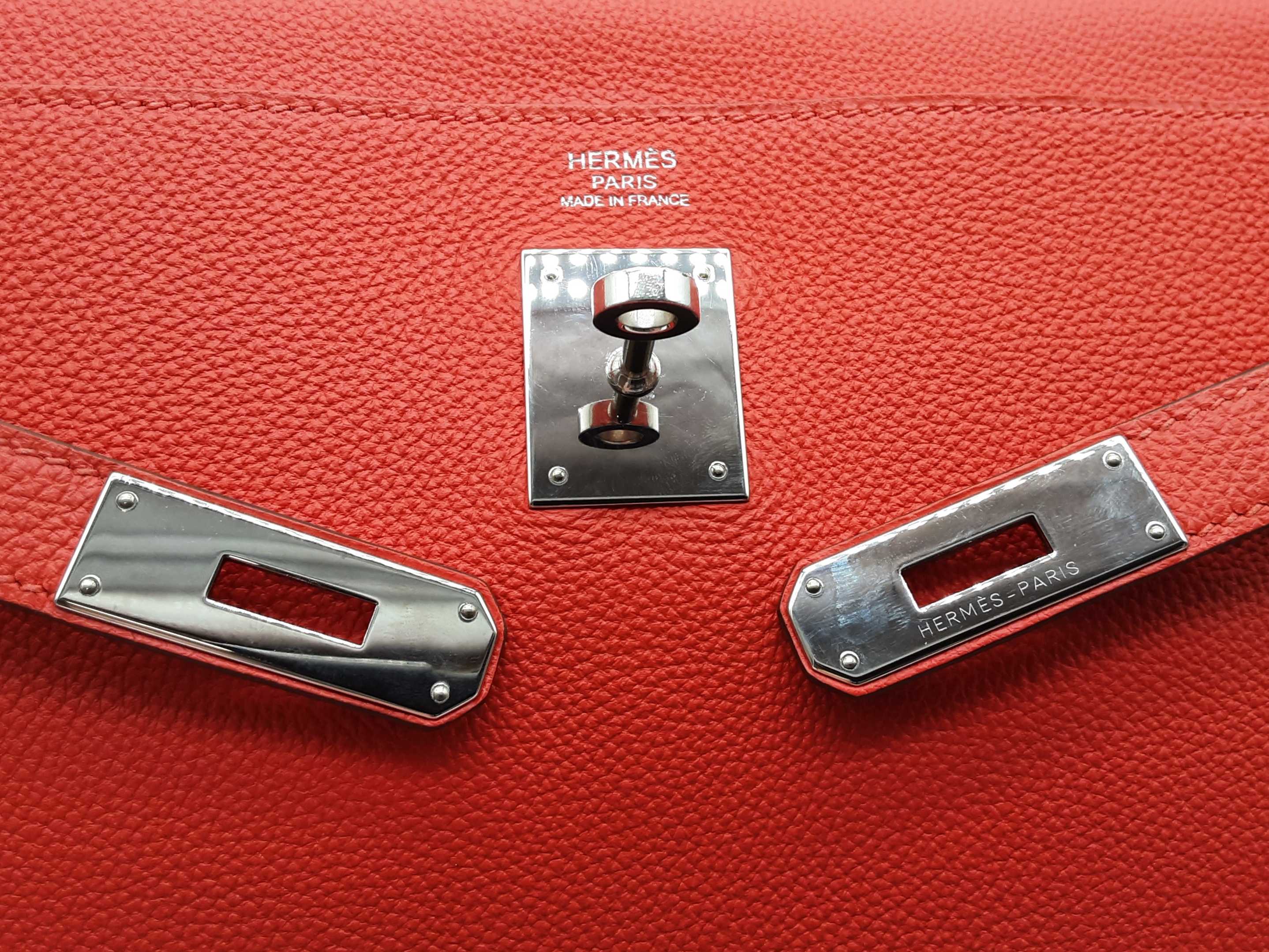 144020029912Hermes Kelly 32CM Rouge Pivoine Red Orange Togo Palladium Hardware Handbag. Length 13 IN X Height 9 IN X Width 5 IN X Handle Drop 3.5 IN. Strap Drop 17.5 IN. Date Code T (2015). Entrupy Certificate #4D4YDGB. Great Pre-owned Condition with creases, scratches on metal hardware, and marks in zipper pocket.