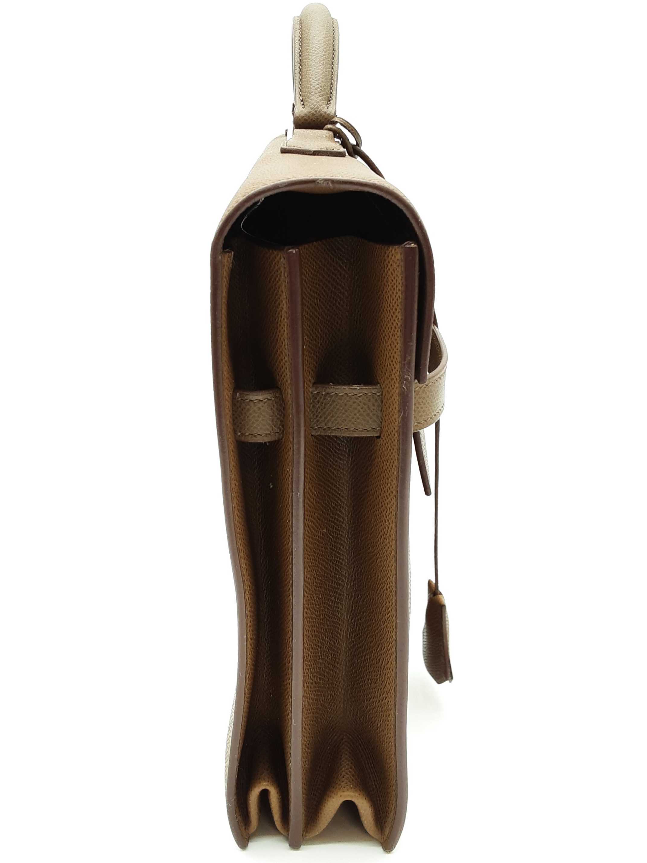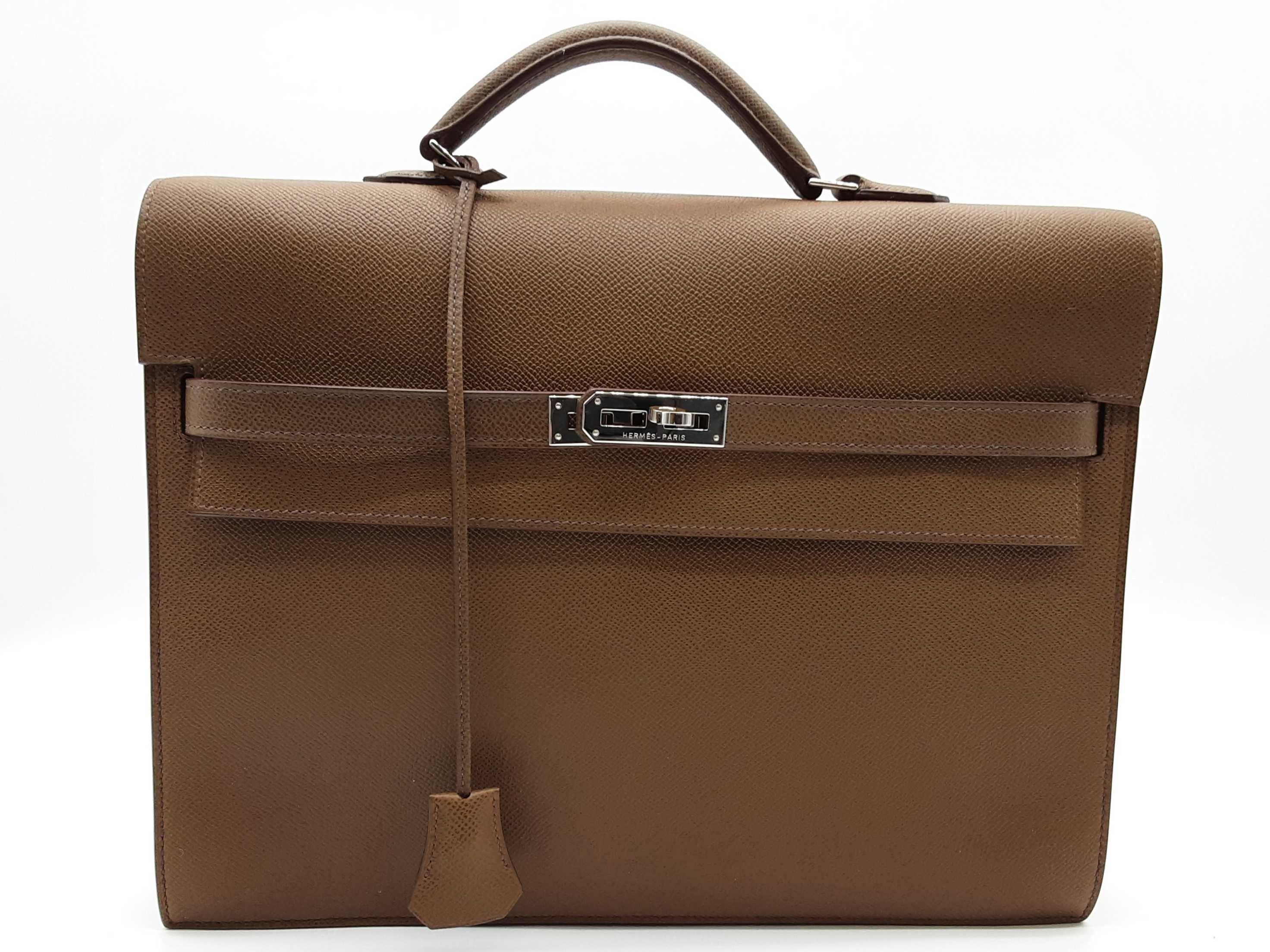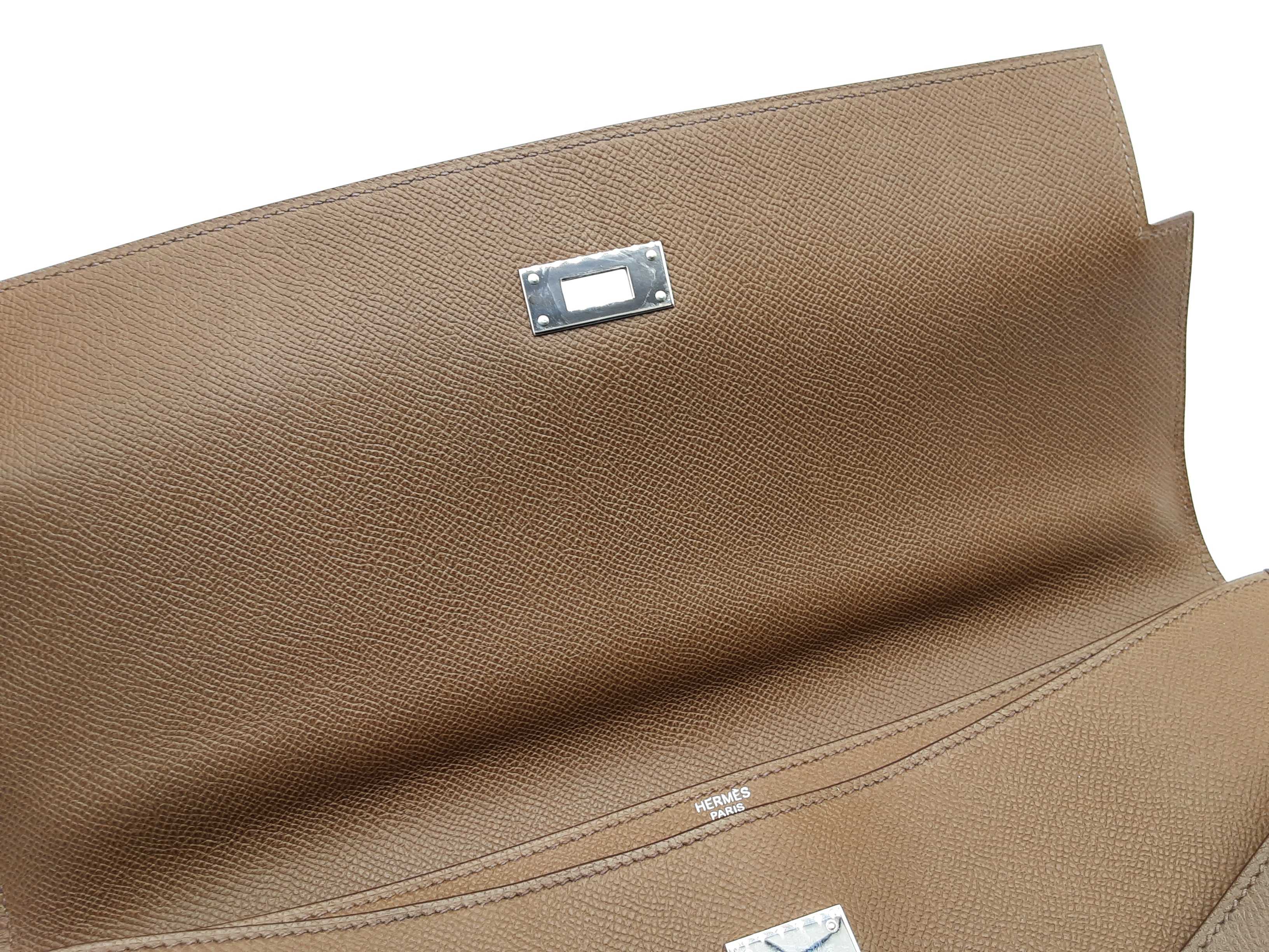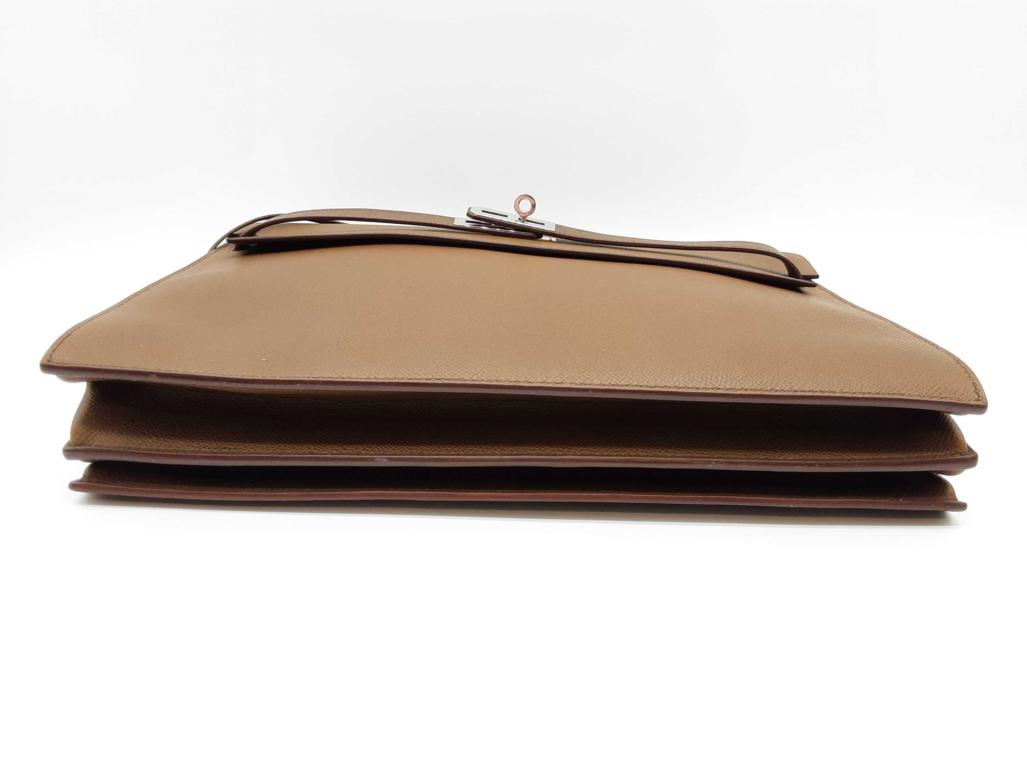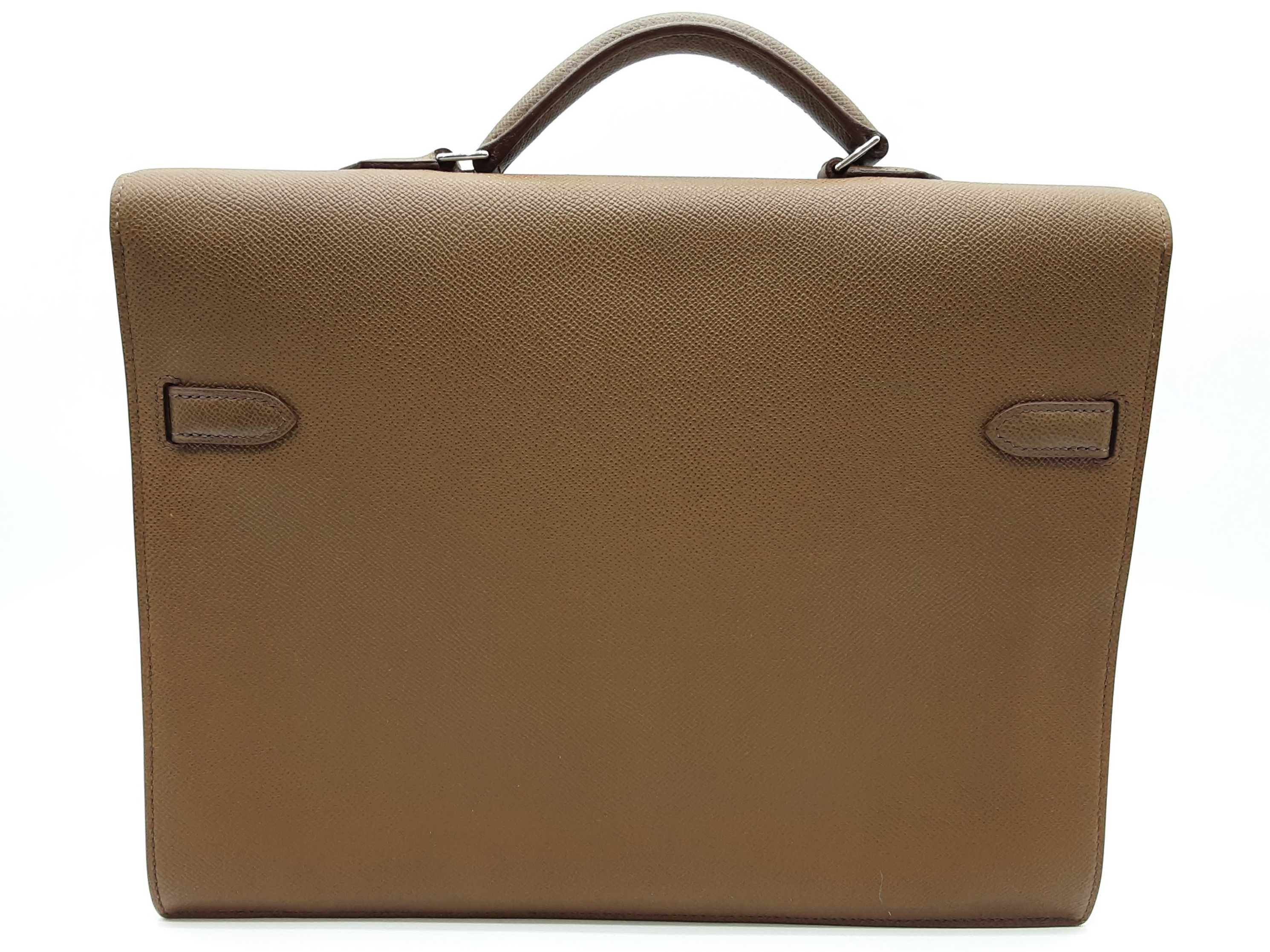 144020029563Hermes Kelly Depeches 34CM Brulee Brown Epsom Palladium Hardware Briefcase. Length 13.25 IN X Height 10 IN X Width 2.5 IN X Drop 2.25 IN. Date Code Square K (2007). Entrupy Certificate #QRCCG3M. Good Pre-owned Condition with corners curving, creases, flap curved, marks on exterior, scratches on metal hardware, and wear and indentations on interior suede.