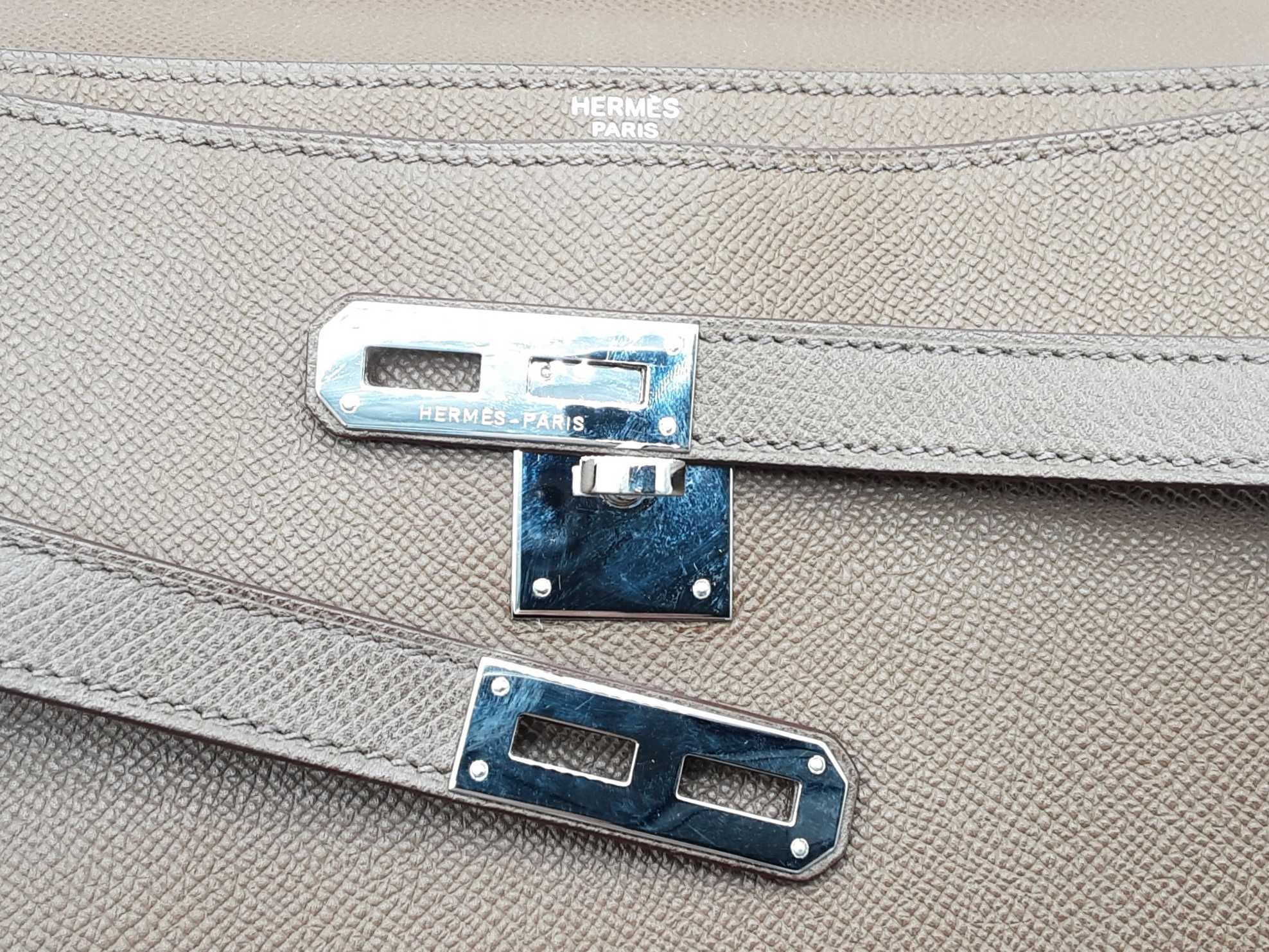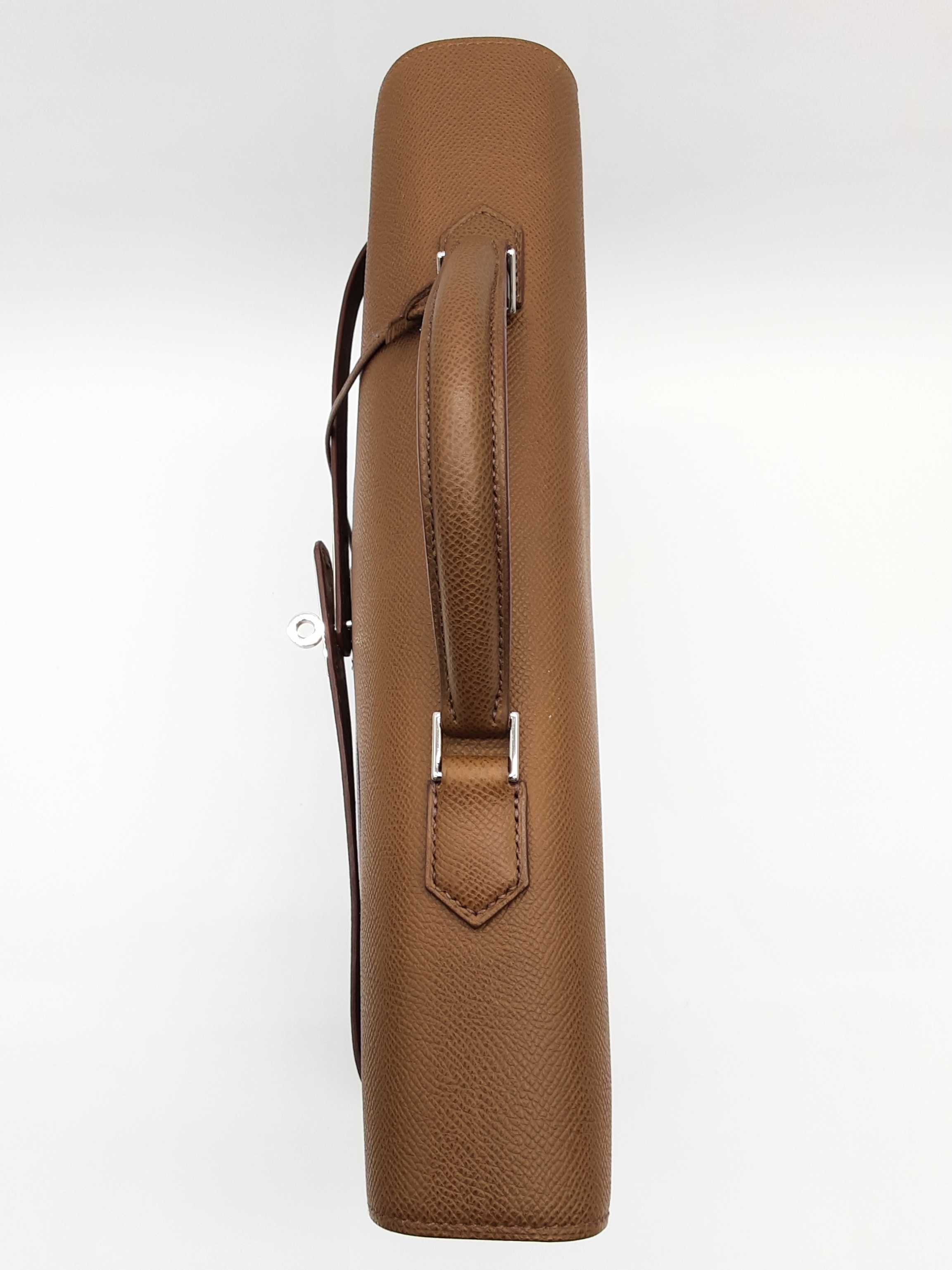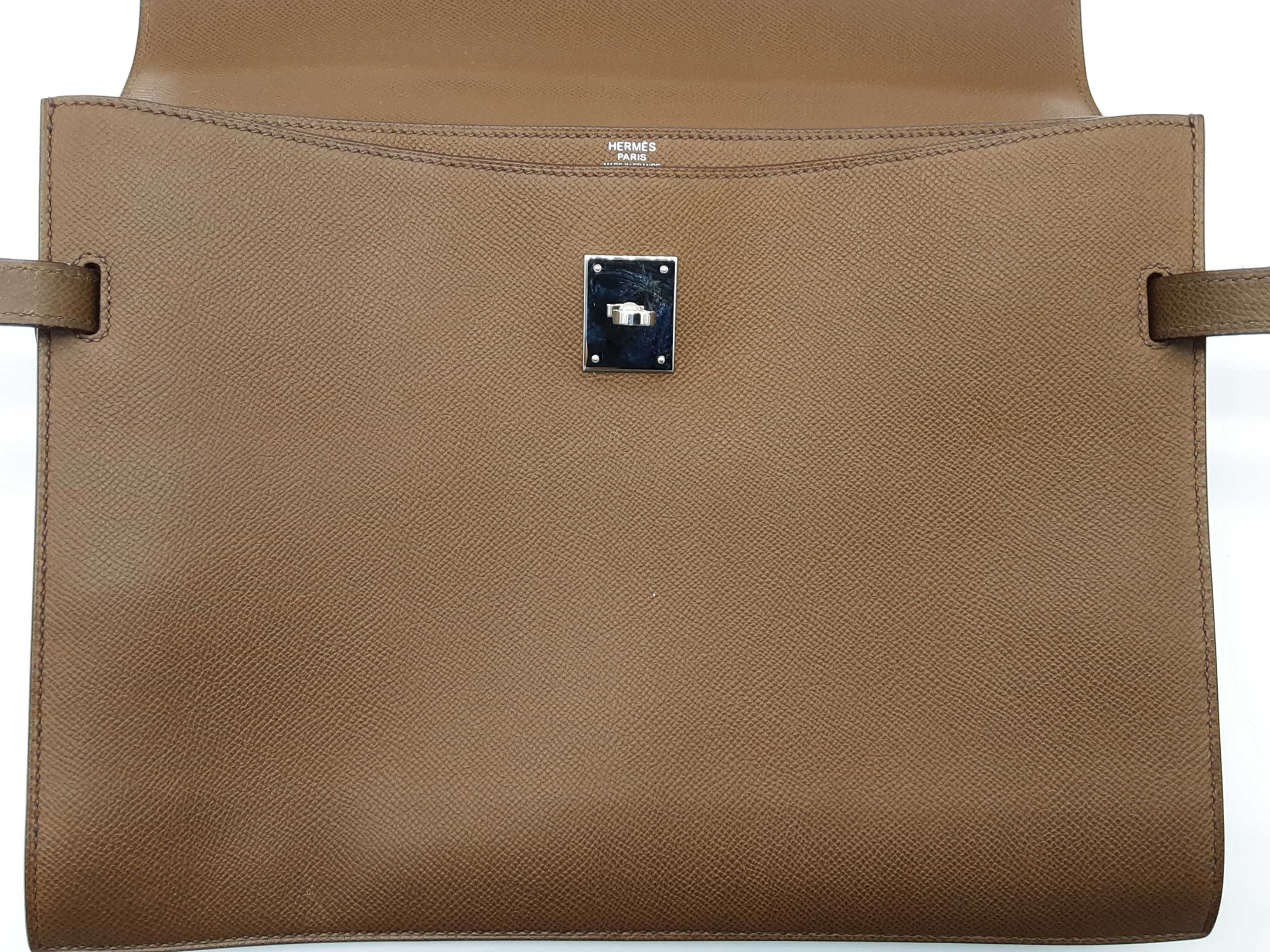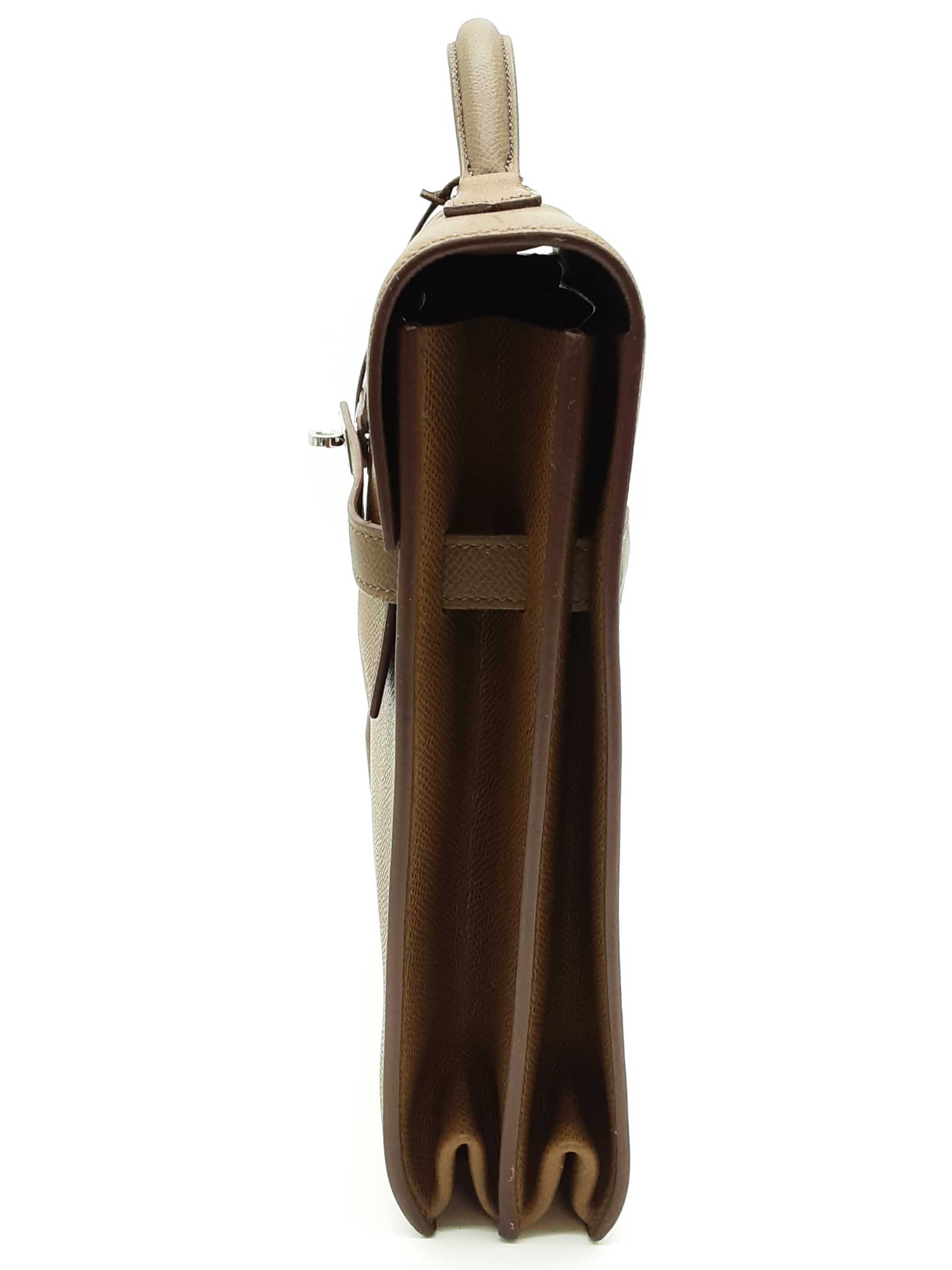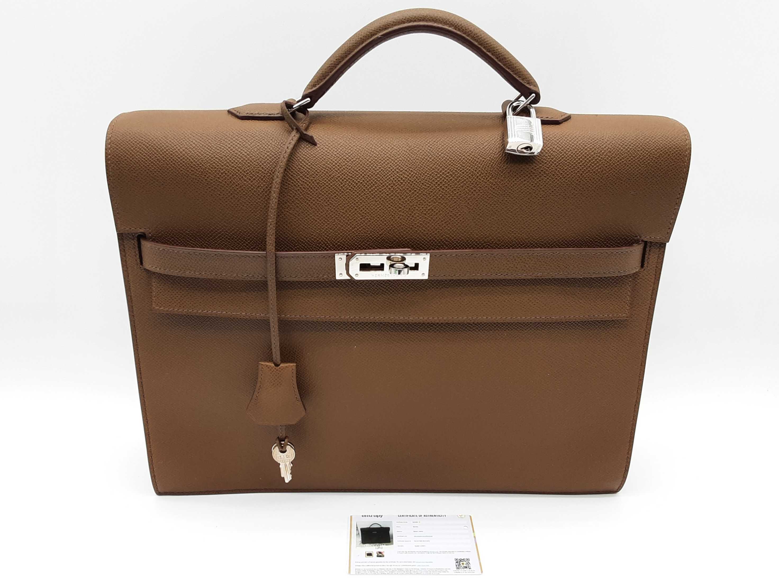 144020029563Hermes Kelly Depeches 34CM Brulee Brown Epsom Palladium Hardware Briefcase. Length 13.25 IN X Height 10 IN X Width 2.5 IN X Drop 2.25 IN. Date Code Square K (2007). Entrupy Certificate #QRCCG3M. Good Pre-owned Condition with corners curving, creases, flap curved, marks on exterior, scratches on metal hardware, and wear and indentations on interior suede.