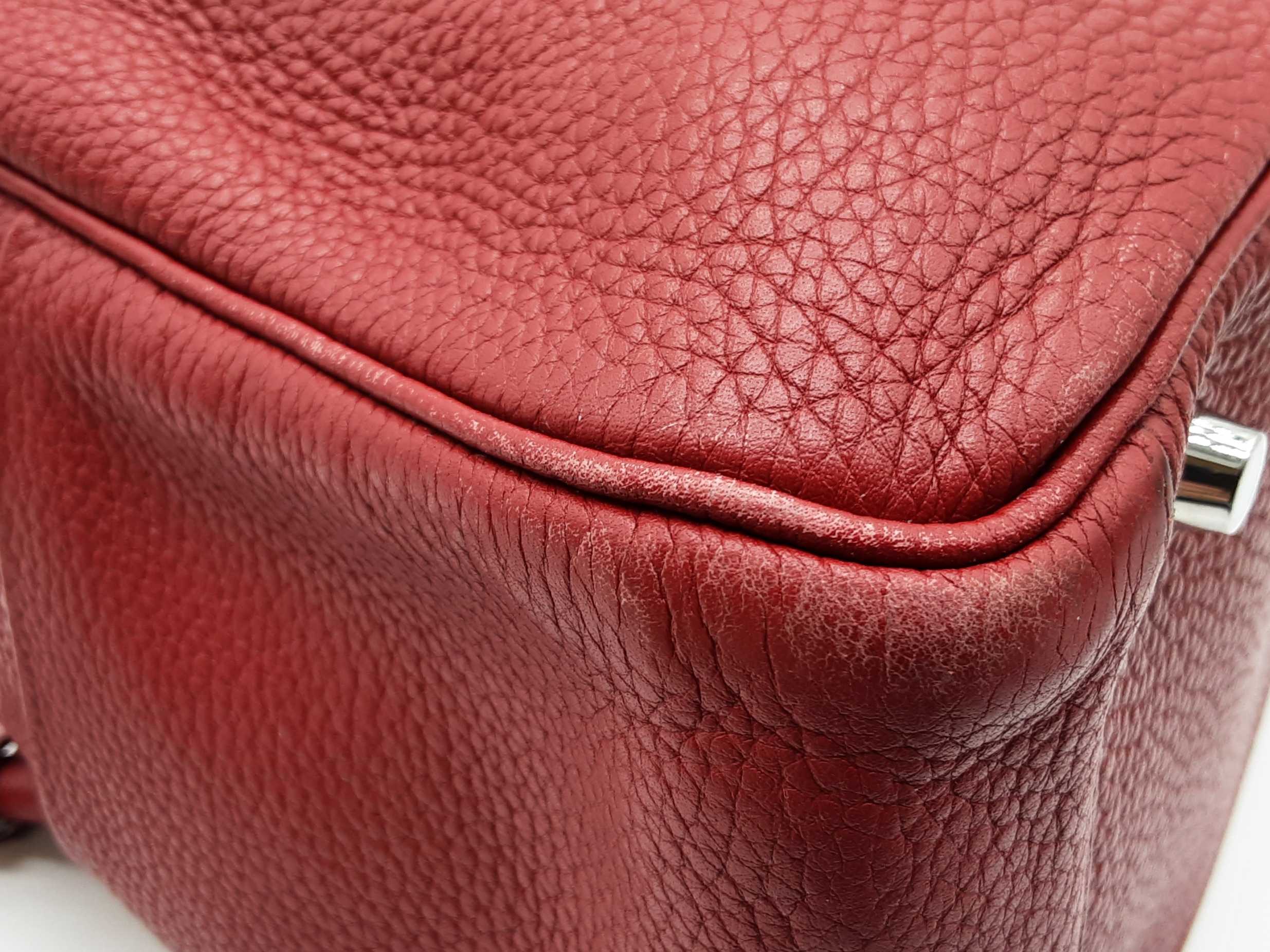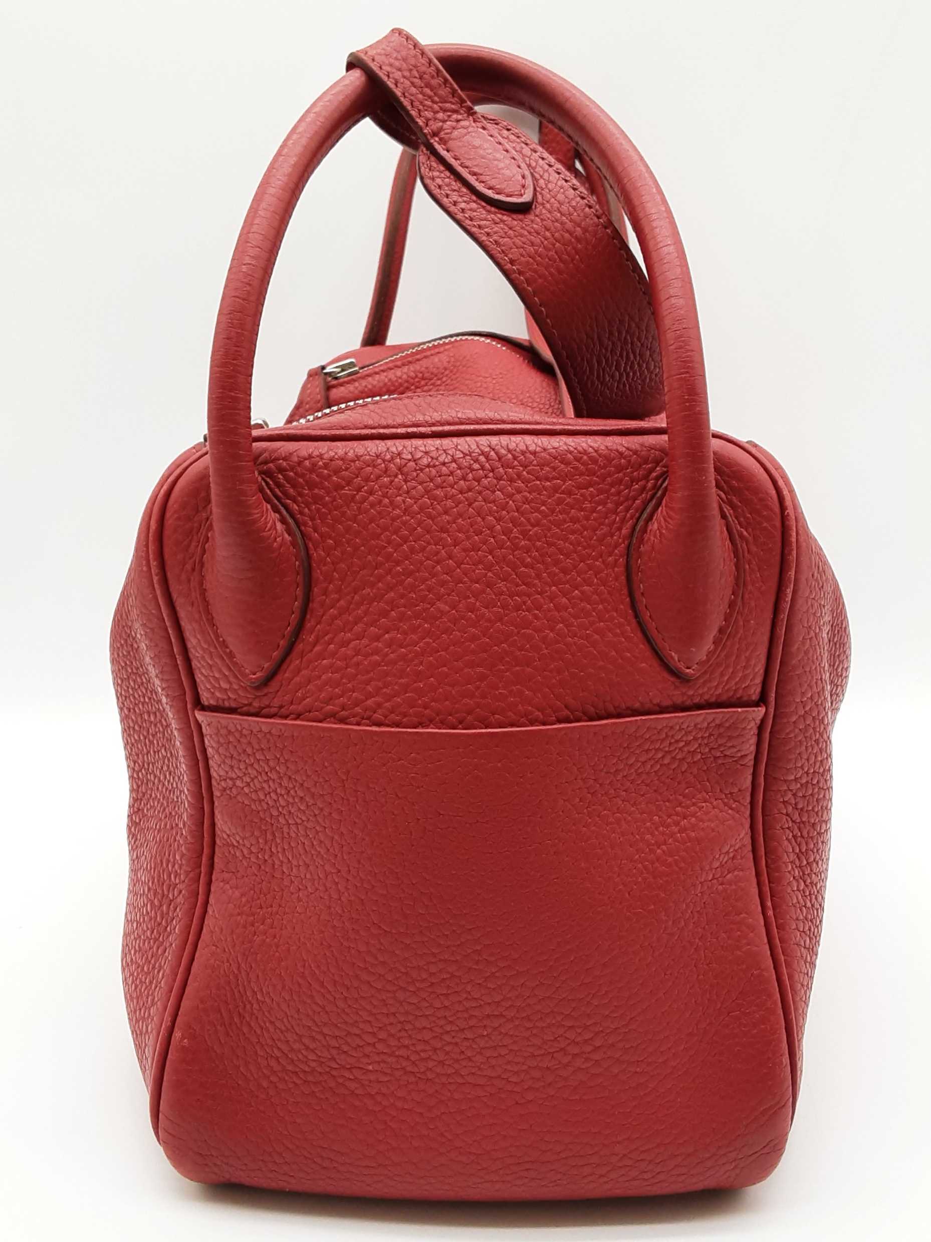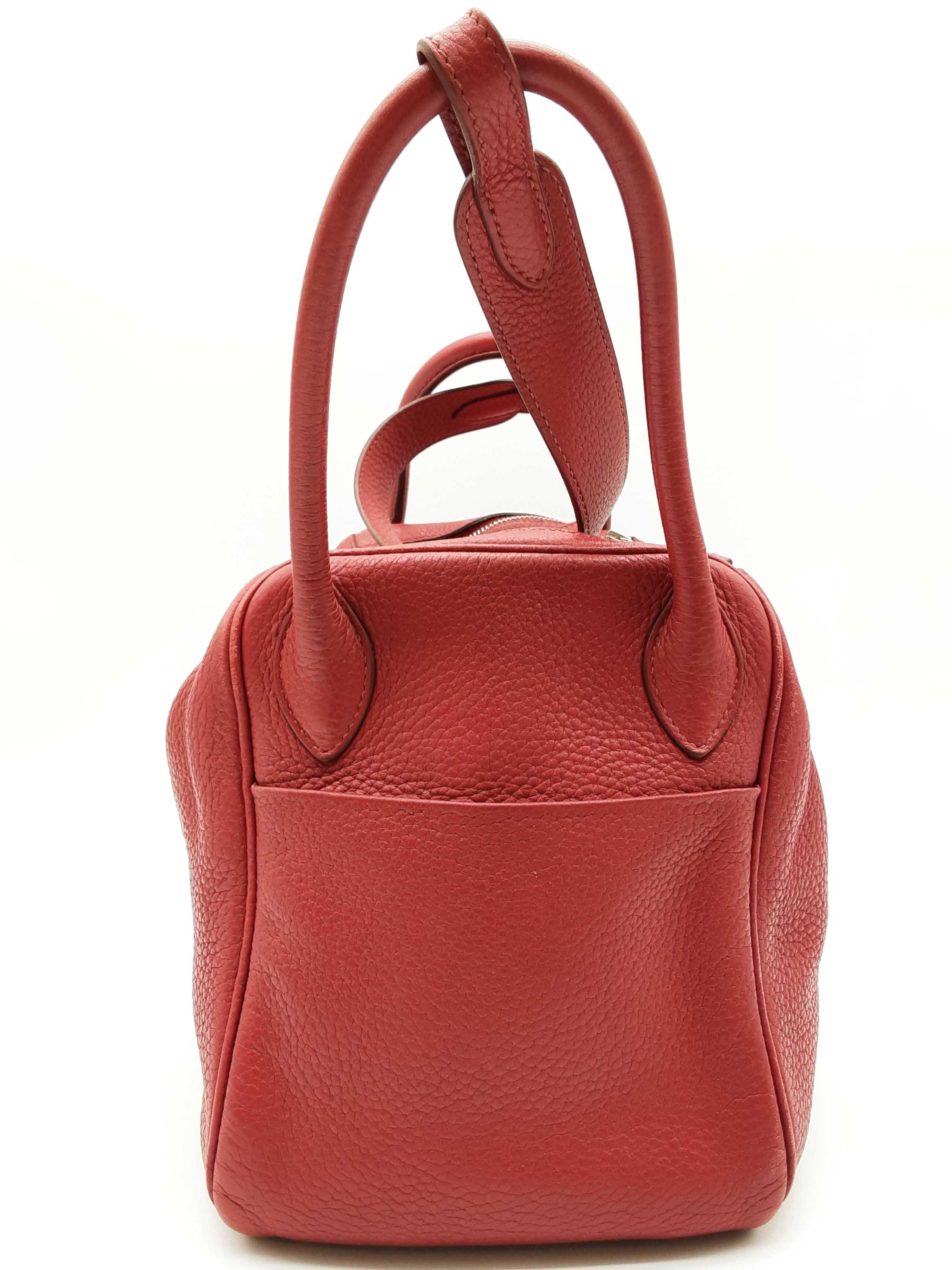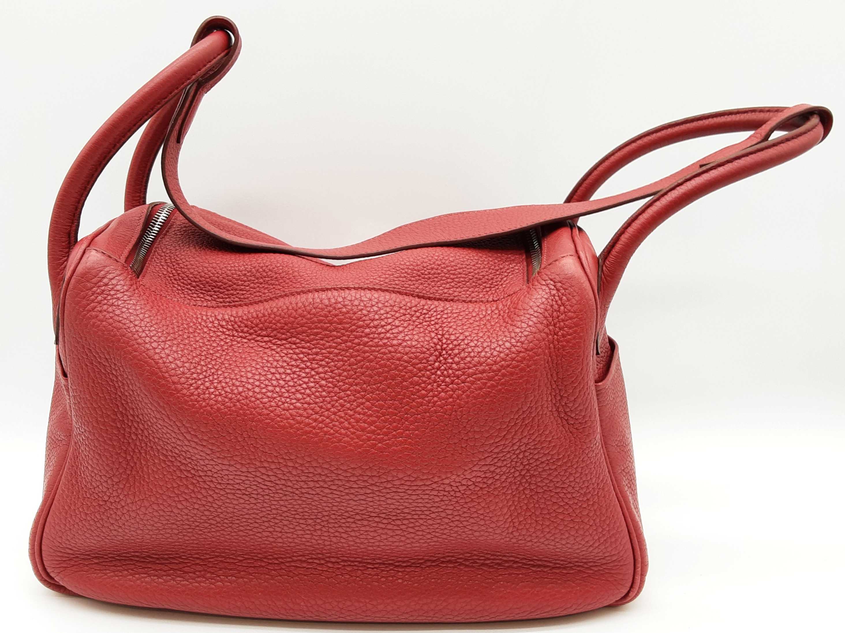 144020030182Hermes Lindy 28CM Rubis Red Clemence Palladium Hardware Shoulder Bag. Length 12.5 IN X Height 7.5 IN X Width 6.5 IN X Drop 13 IN. Date Code Square O (2011). Entrupy Certificate #6QD3WVY. Good Pre-owned Condition with creases, scratches on metal hardware, cracking on handles, scratches and marks on interior and interior pockets, marks under flap, and wear on corners, edges, handles and strap.