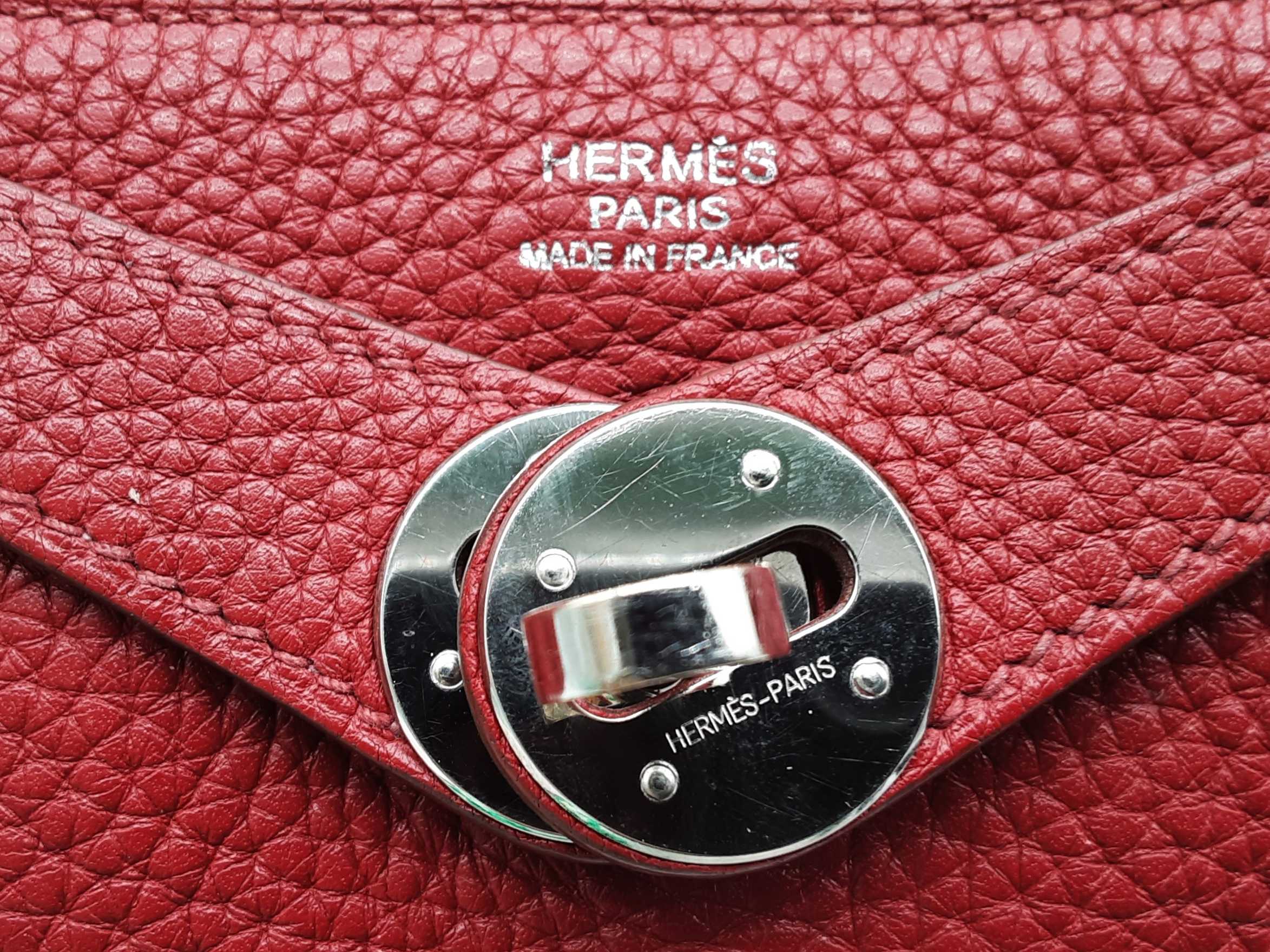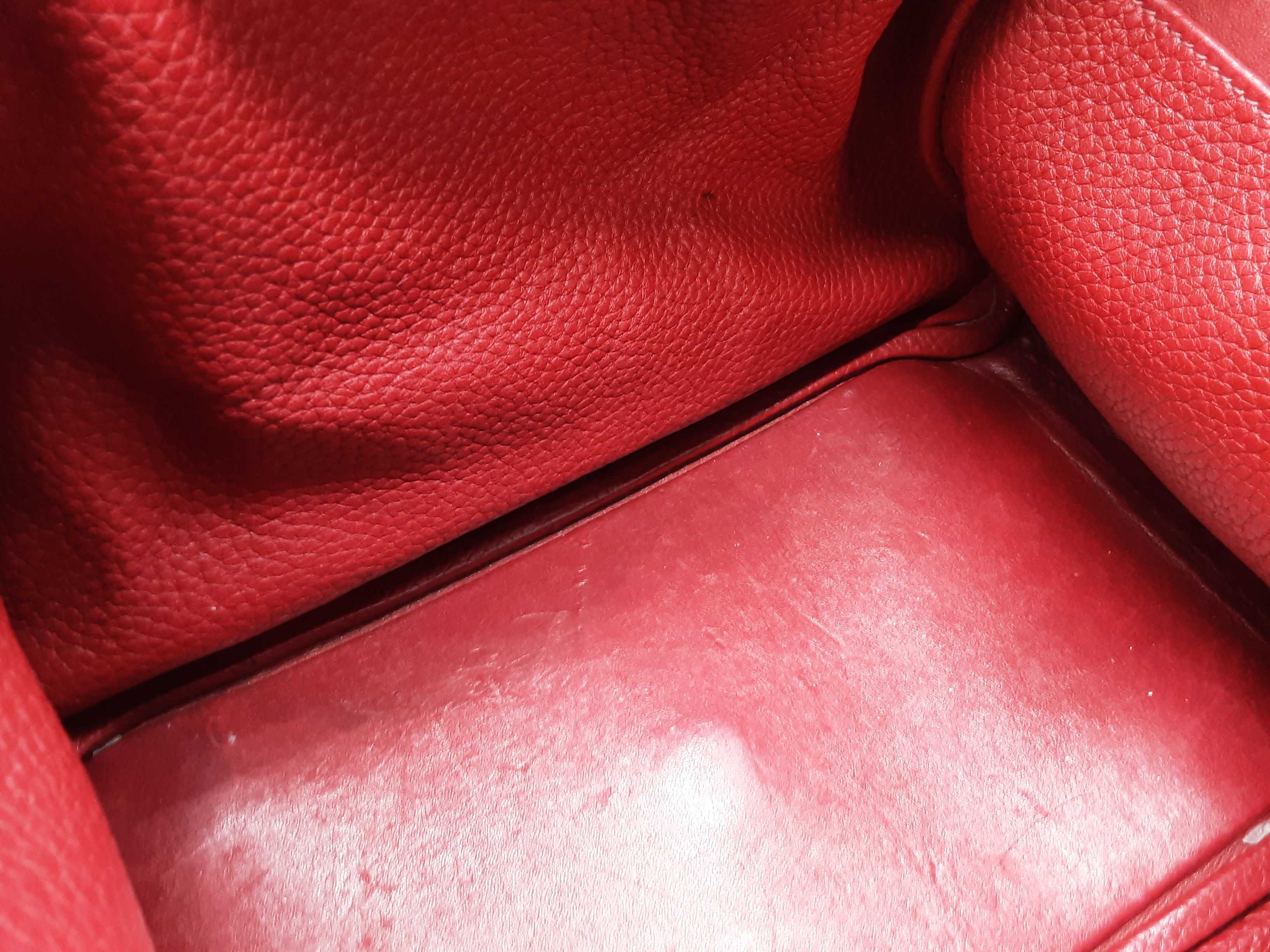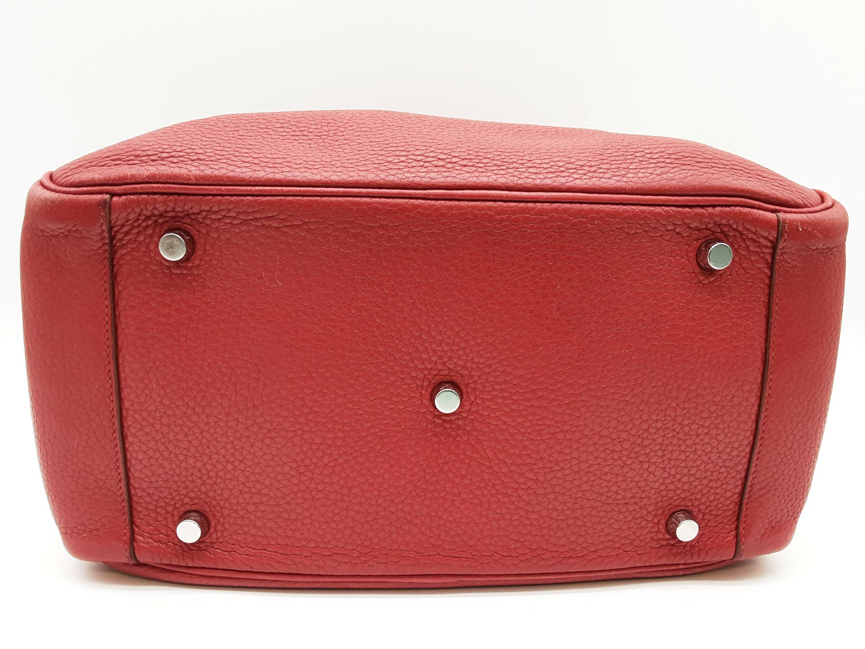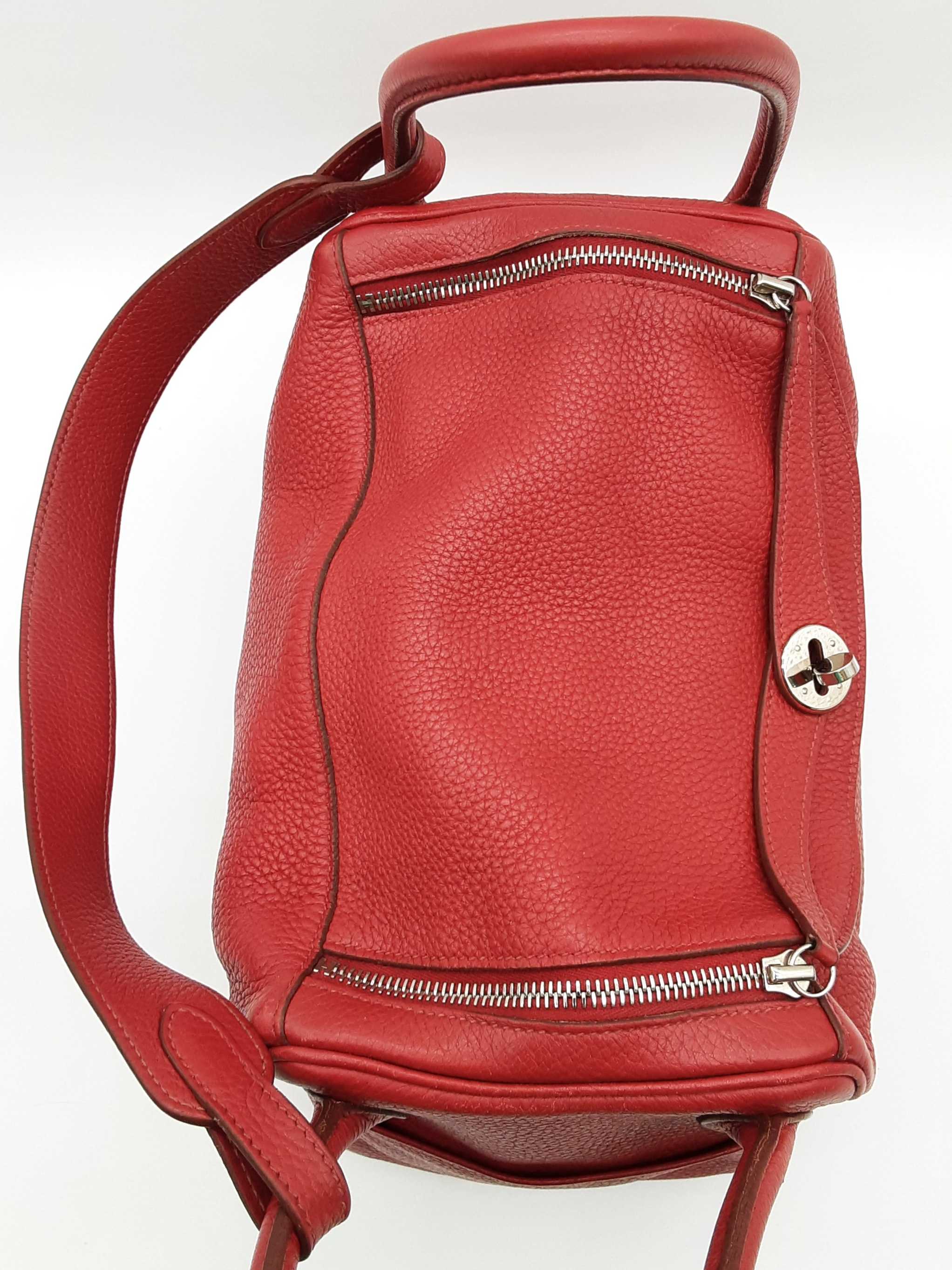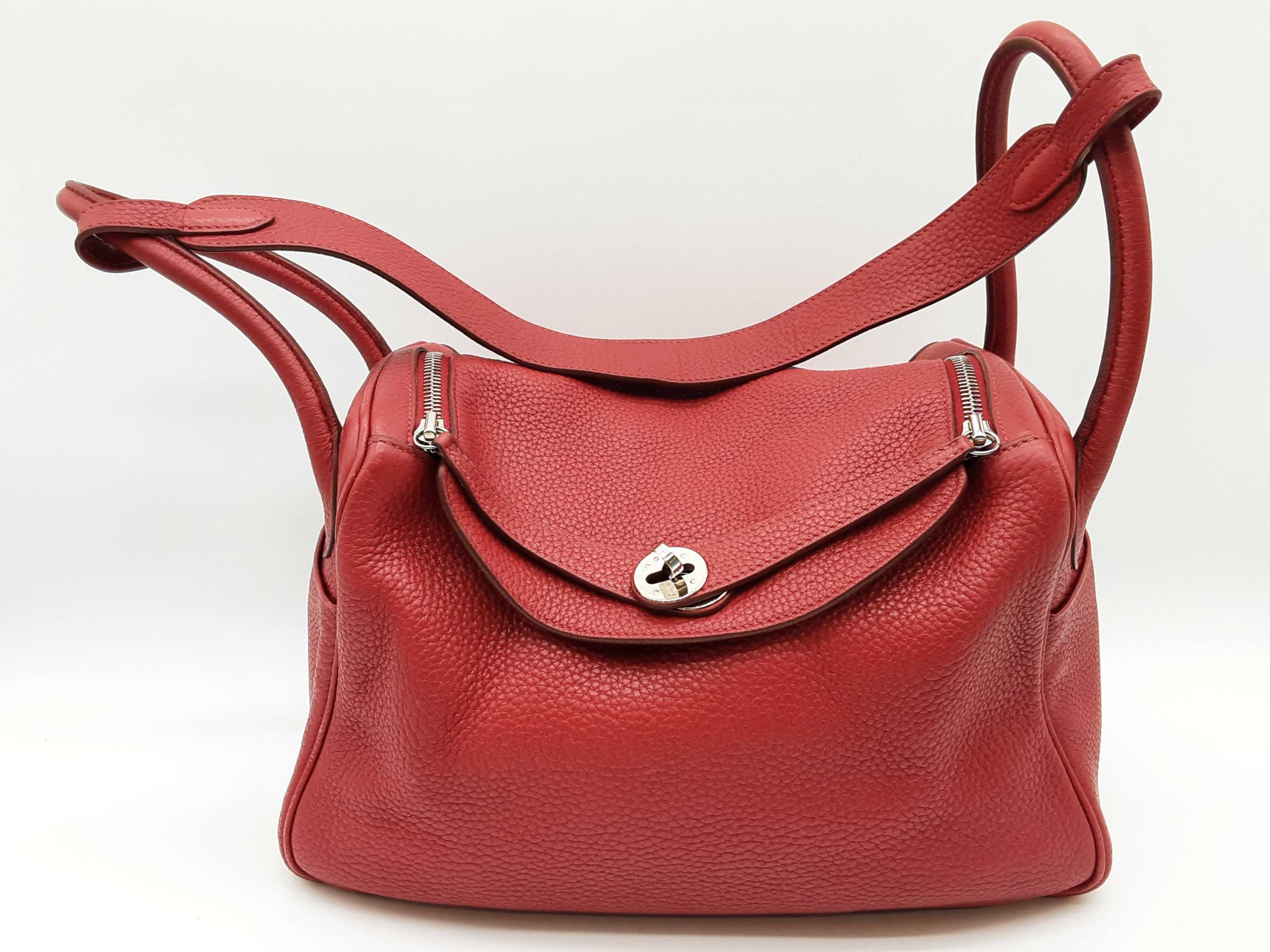 144020030182Hermes Lindy 28CM Rubis Red Clemence Palladium Hardware Shoulder Bag. Length 12.5 IN X Height 7.5 IN X Width 6.5 IN X Drop 13 IN. Date Code Square O (2011). Entrupy Certificate #6QD3WVY. Good Pre-owned Condition with creases, scratches on metal hardware, cracking on handles, scratches and marks on interior and interior pockets, marks under flap, and wear on corners, edges, handles and strap.