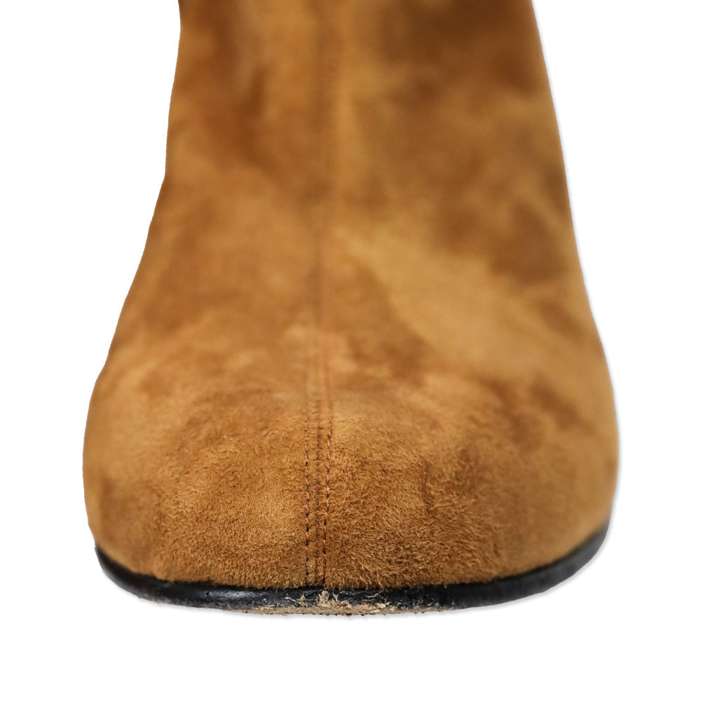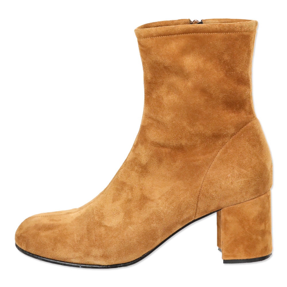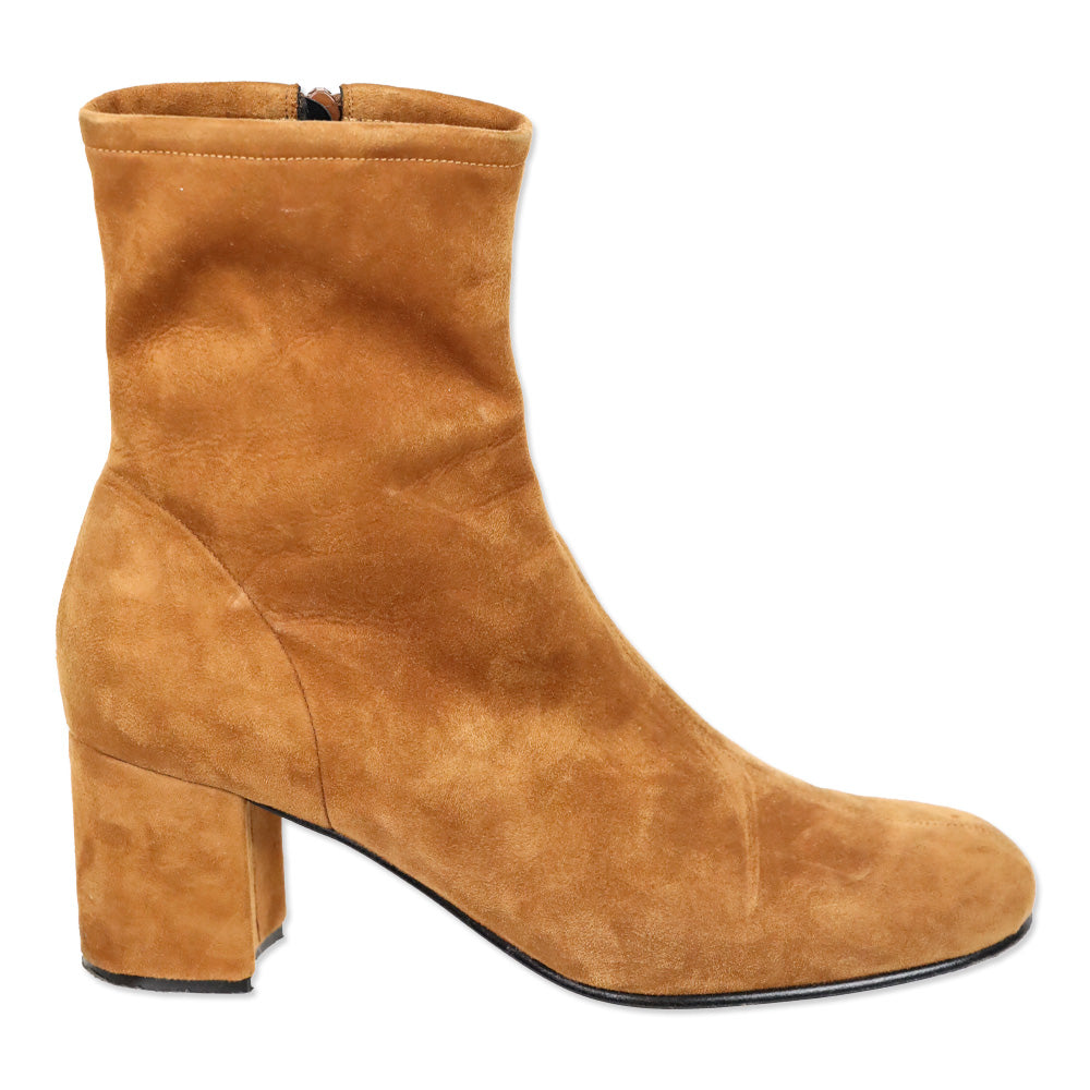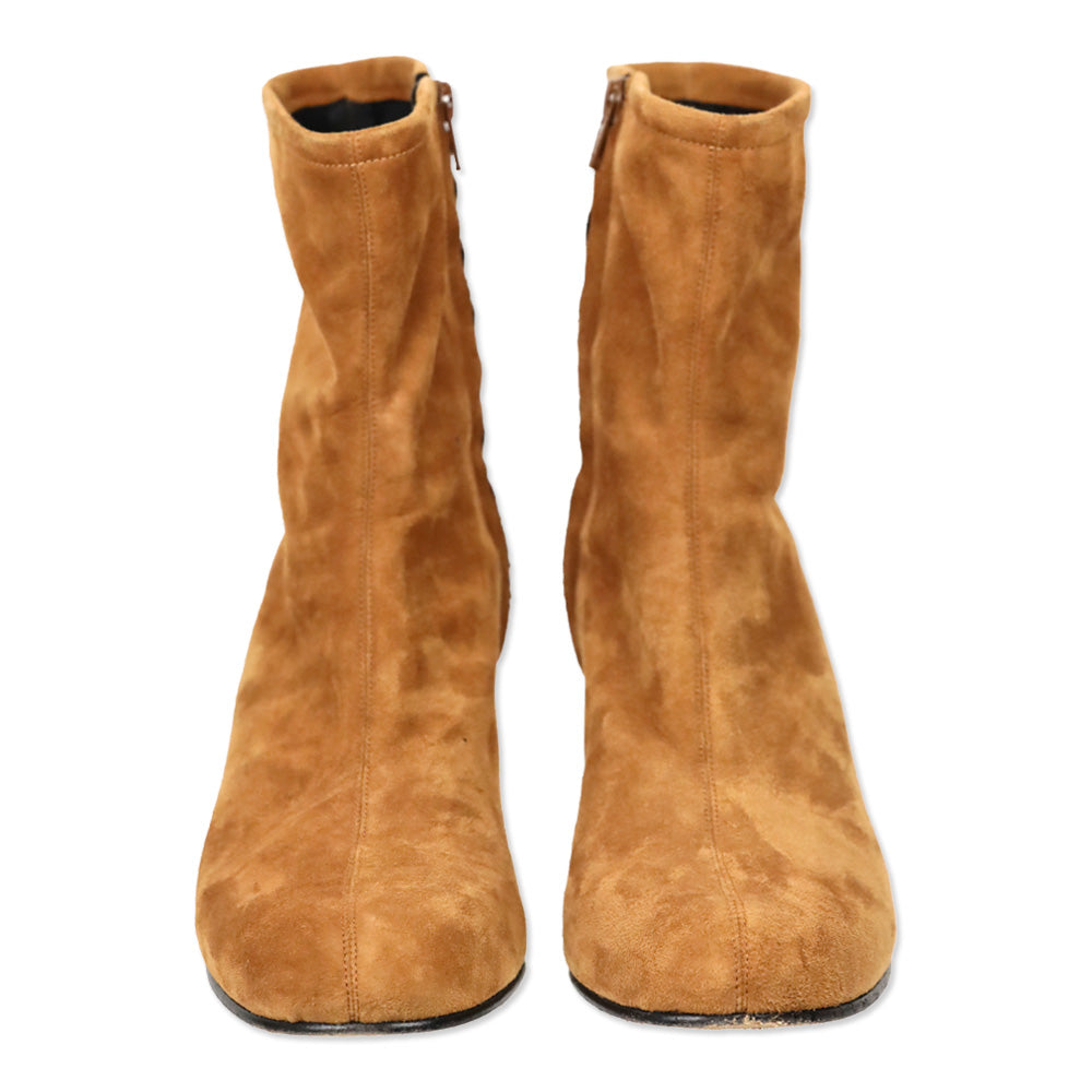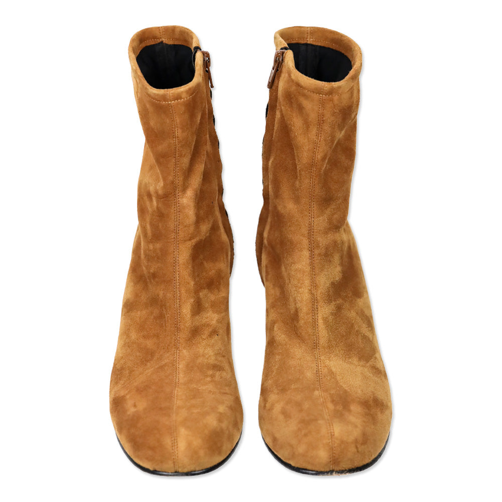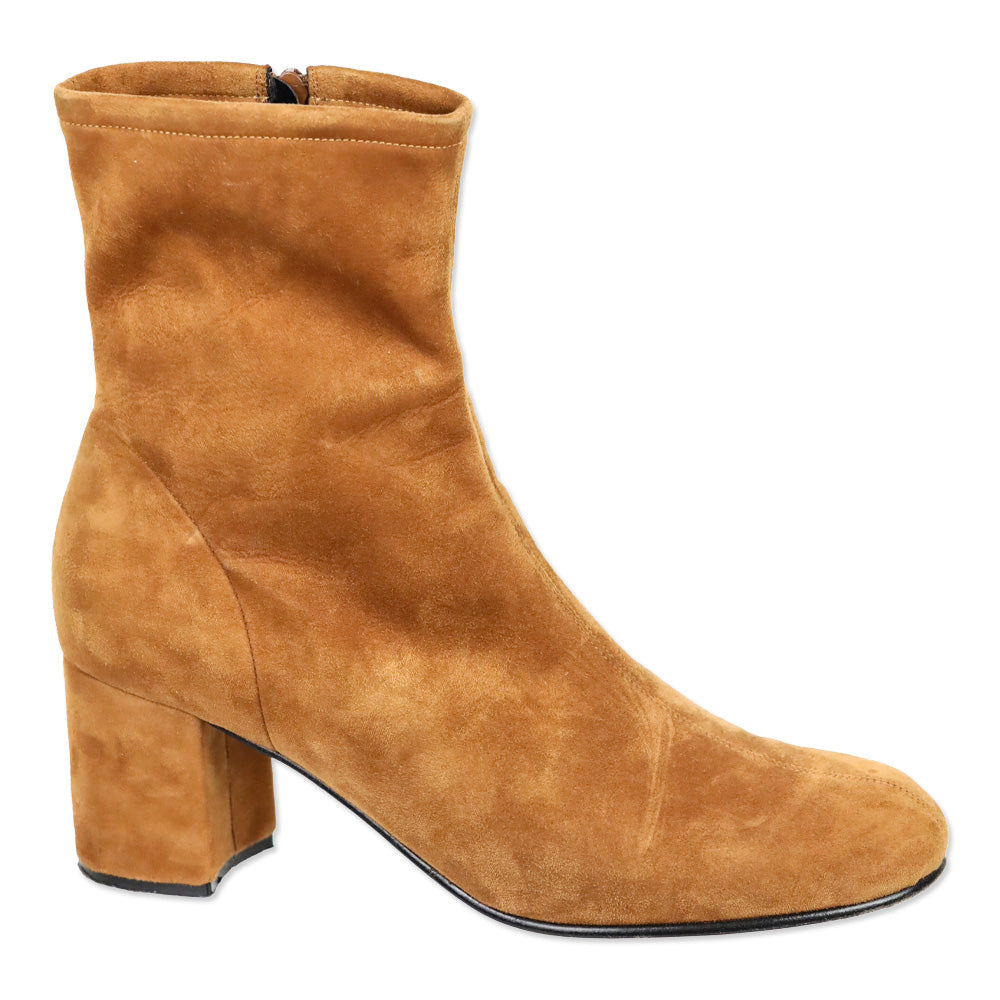 ME + EM suede ankle boots, cognac 60s boots, fitted high ankle boot, size 41 designer footwear, tactile suede, block heel boots, good condition ME + EM Vintage-inspired silhouette, autumnal color palette, versatile day-to-night style, sophisticated casual footwear, comfortable design, high-end material texture