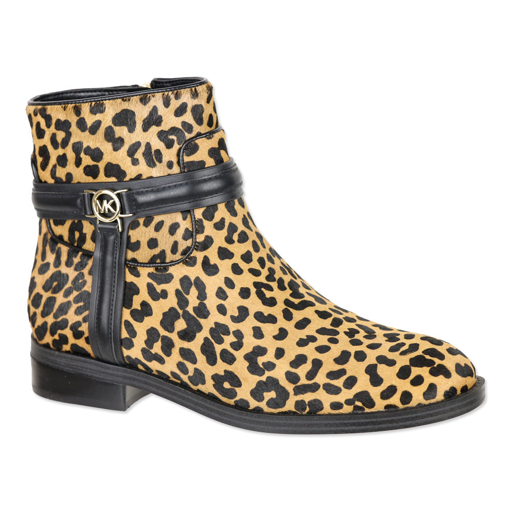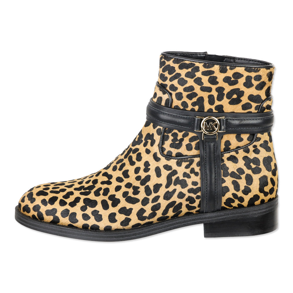 Michael Kors Mindy boots, cheetah print calf hair, leopard print ankle boots, size 7.5 designer boots, low stacked heel, gold-tone logo charm, new with box Michael Kors, women's exotic boots Sophisticated animal print, versatile everyday footwear, comfortable low heel, durable material construction, chic urban styling, classic almond toe silhouette, luxury casual boot