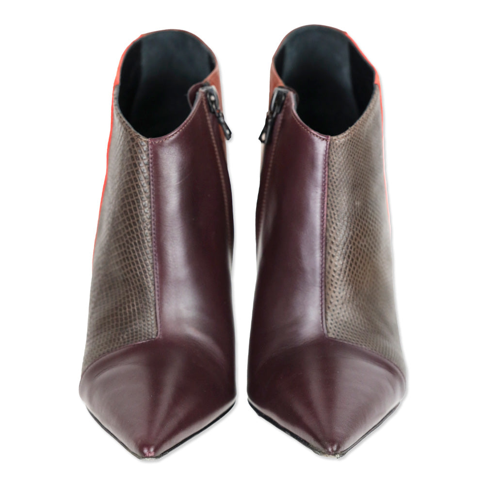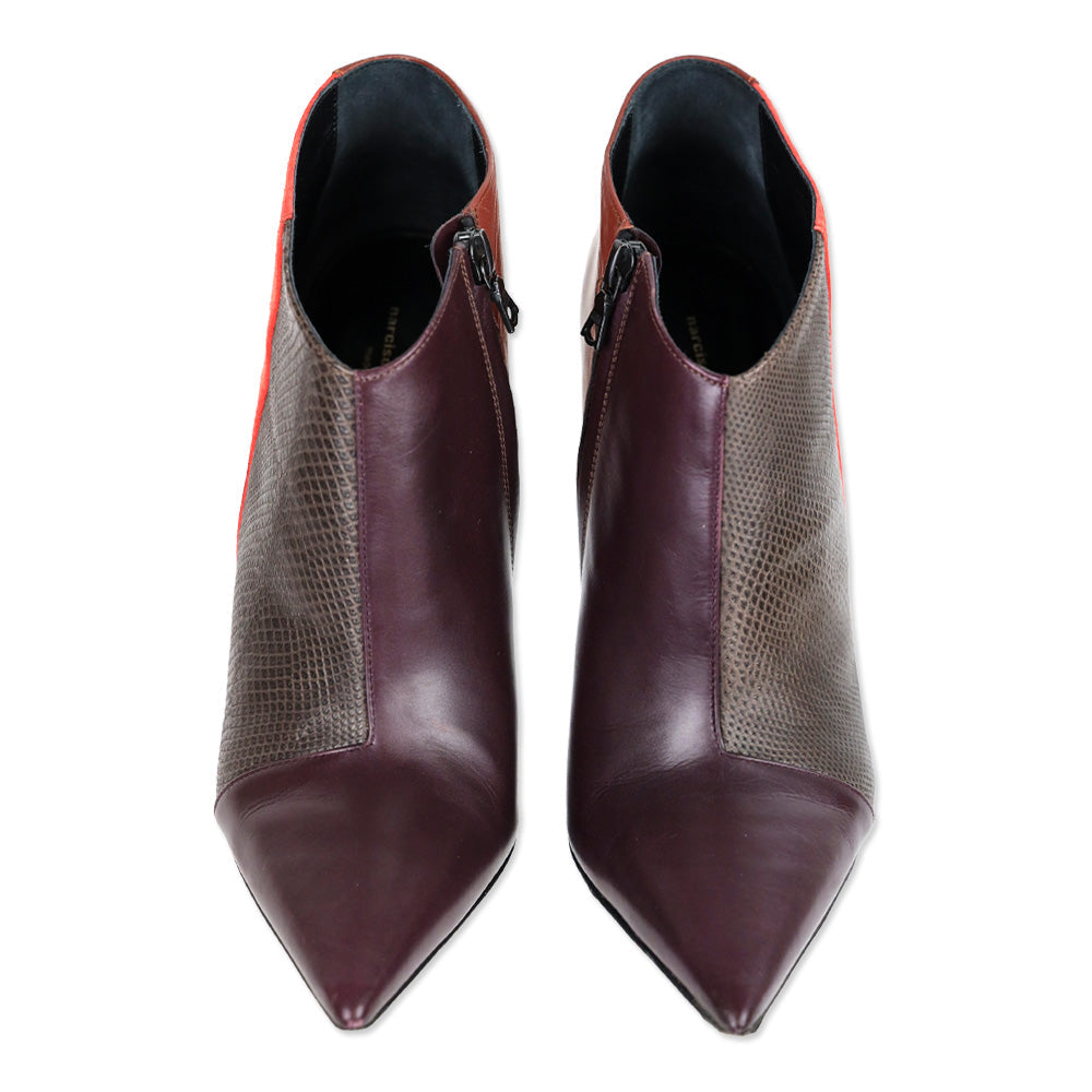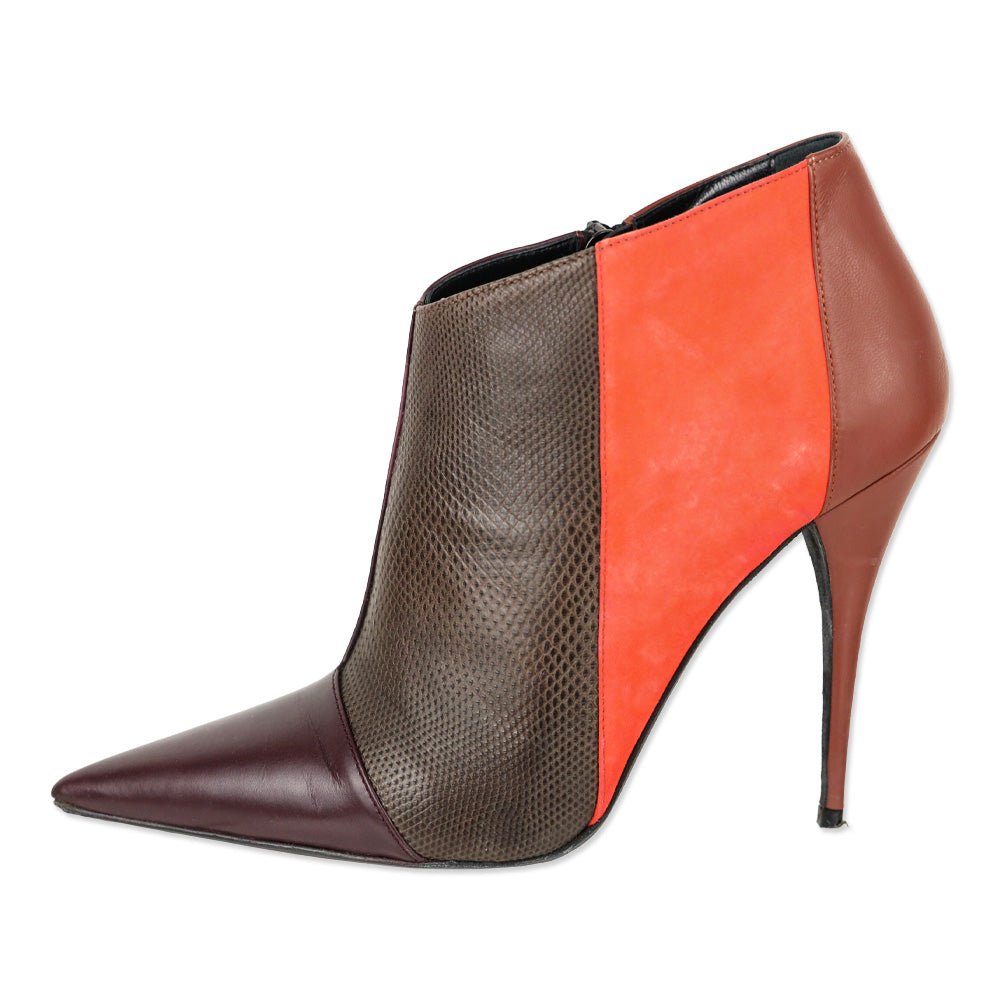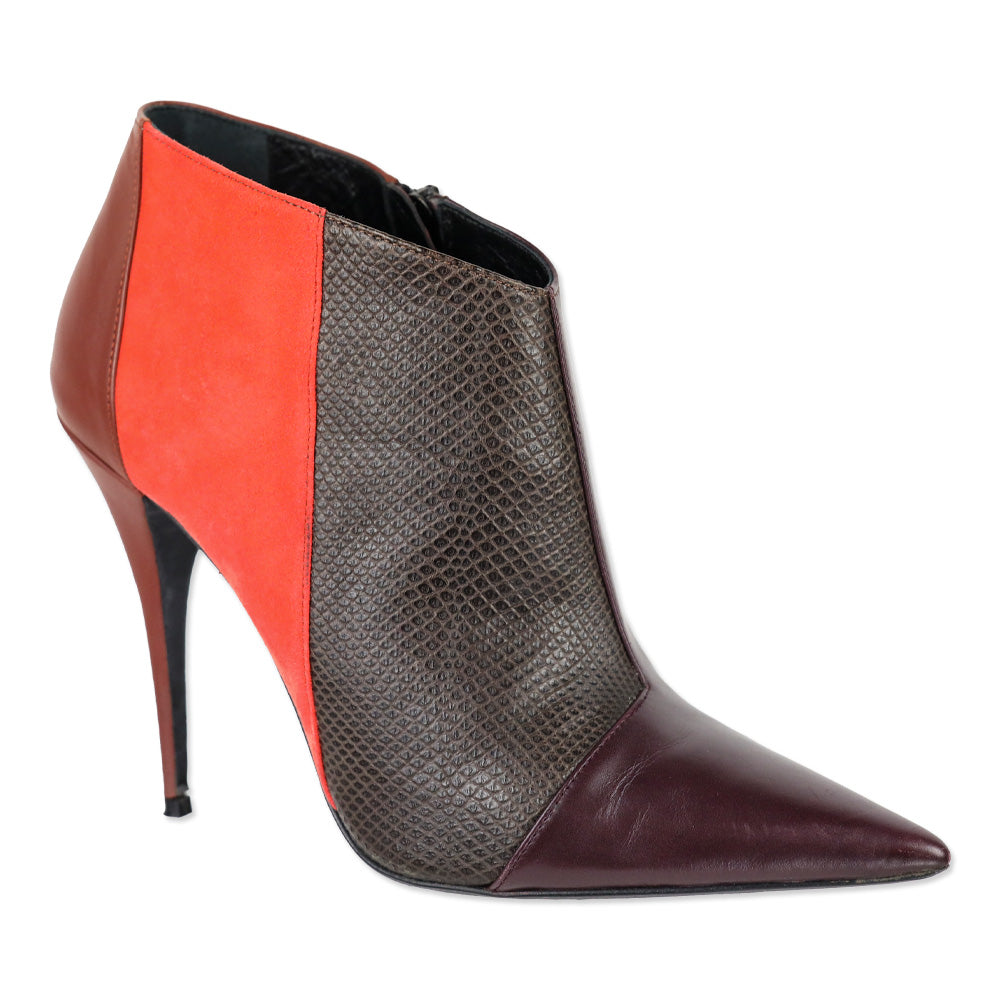 Narciso Rodriguez booties, colorblock ankle boots, size 38.5 boots, multi-material boots, 4.25 inch stiletto boots Artistic colorblocking, architectural heel, mixed materials, wearable art, fashion-forward design, statement craftsmanship