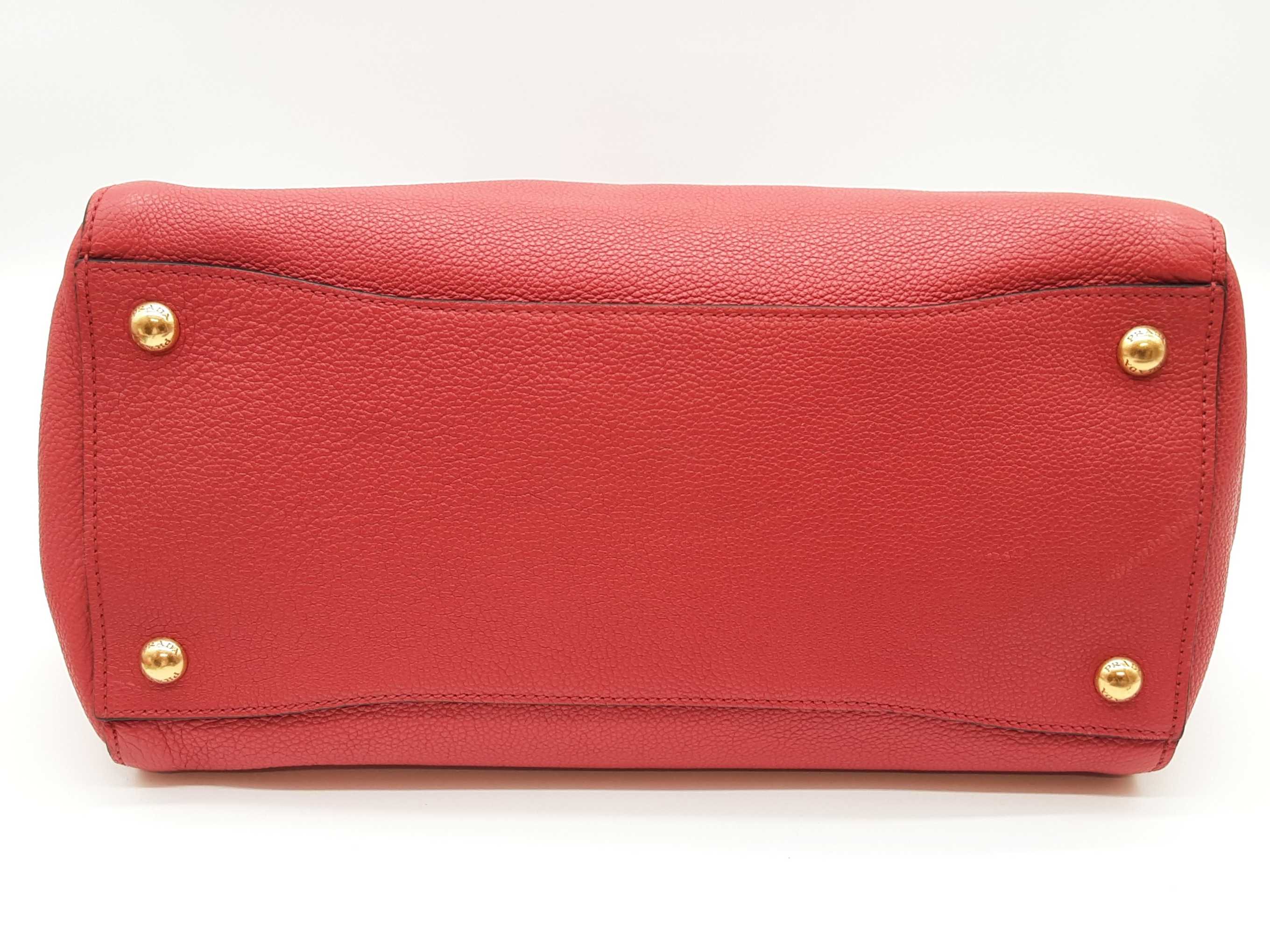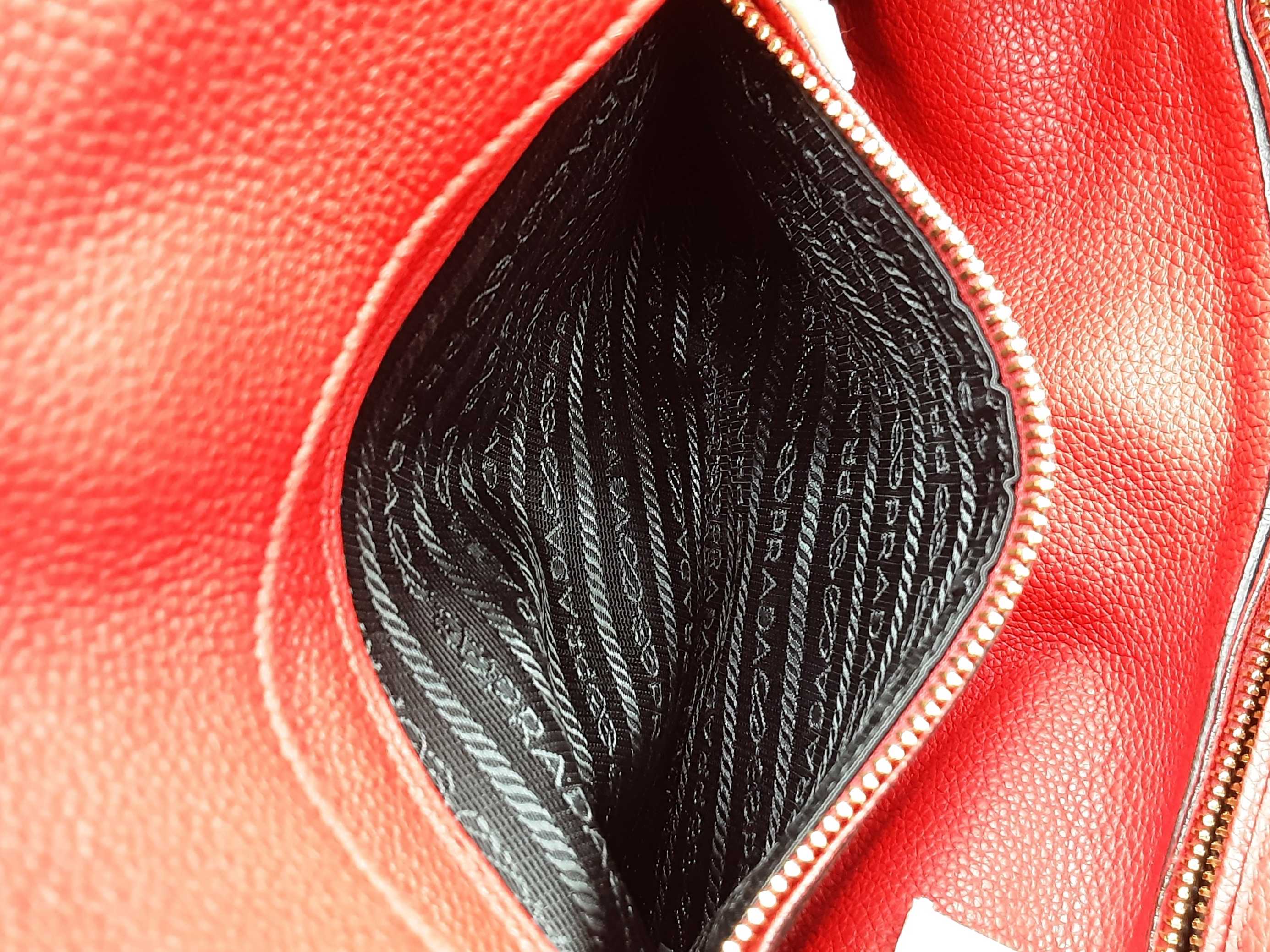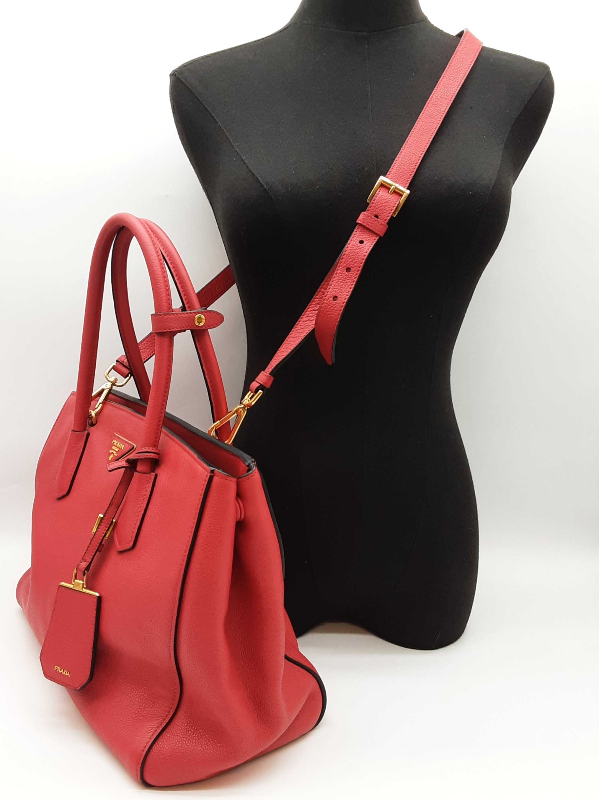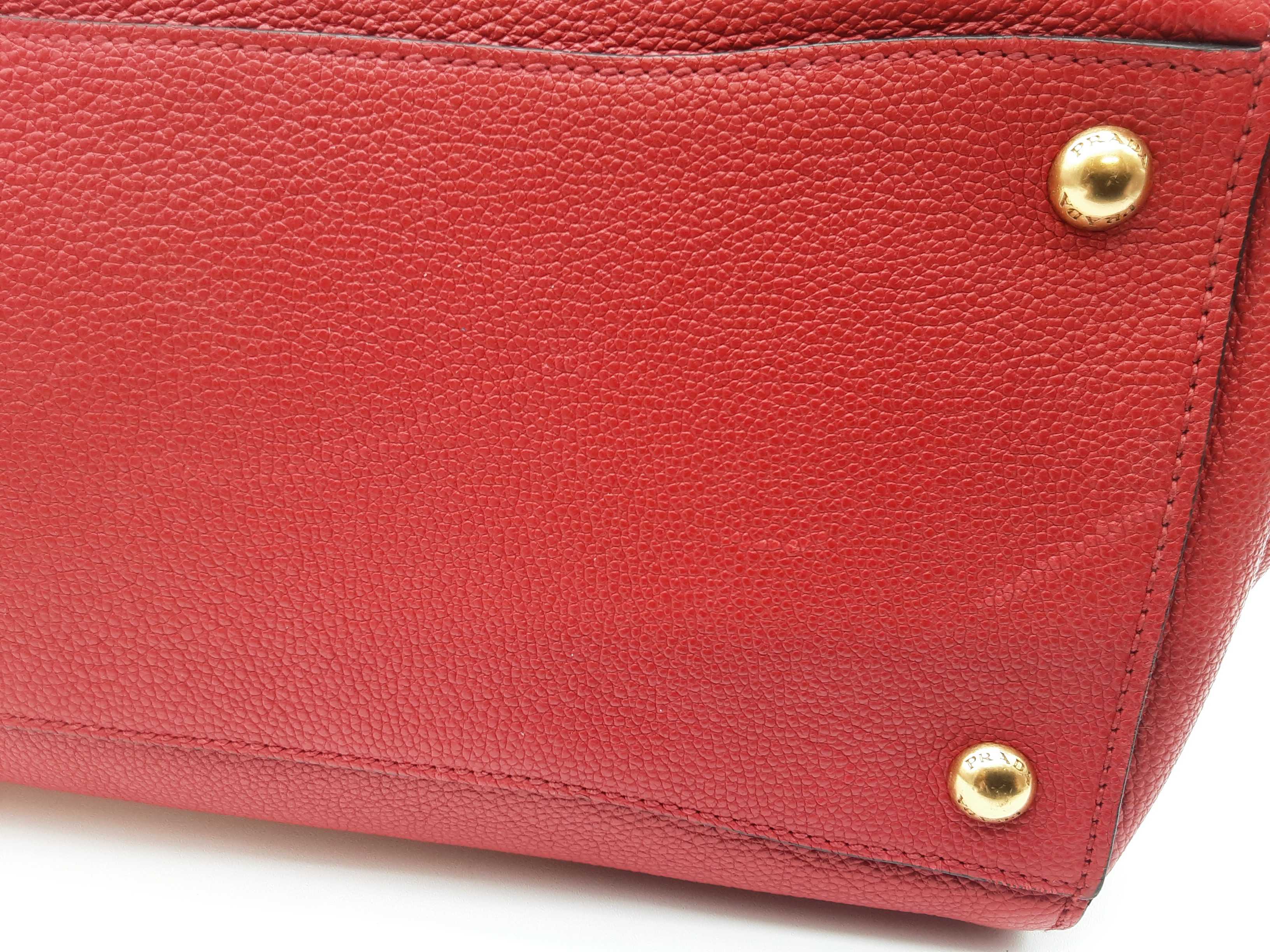 144020034281Prada 2 Way Red Vitello Daino Leather Tote Bag. Length 13 IN X Height 10 IN X Width 6 IN X Handle Drop 6.5 IN. Strap Drop 20 to 22 IN. Style #BN2829. Entrupy Certificate #H4D278Y. Pre-Owned - Good Condition with creases, bag misshappen, scratches and wear on metal hardware, and scratches on exterior.