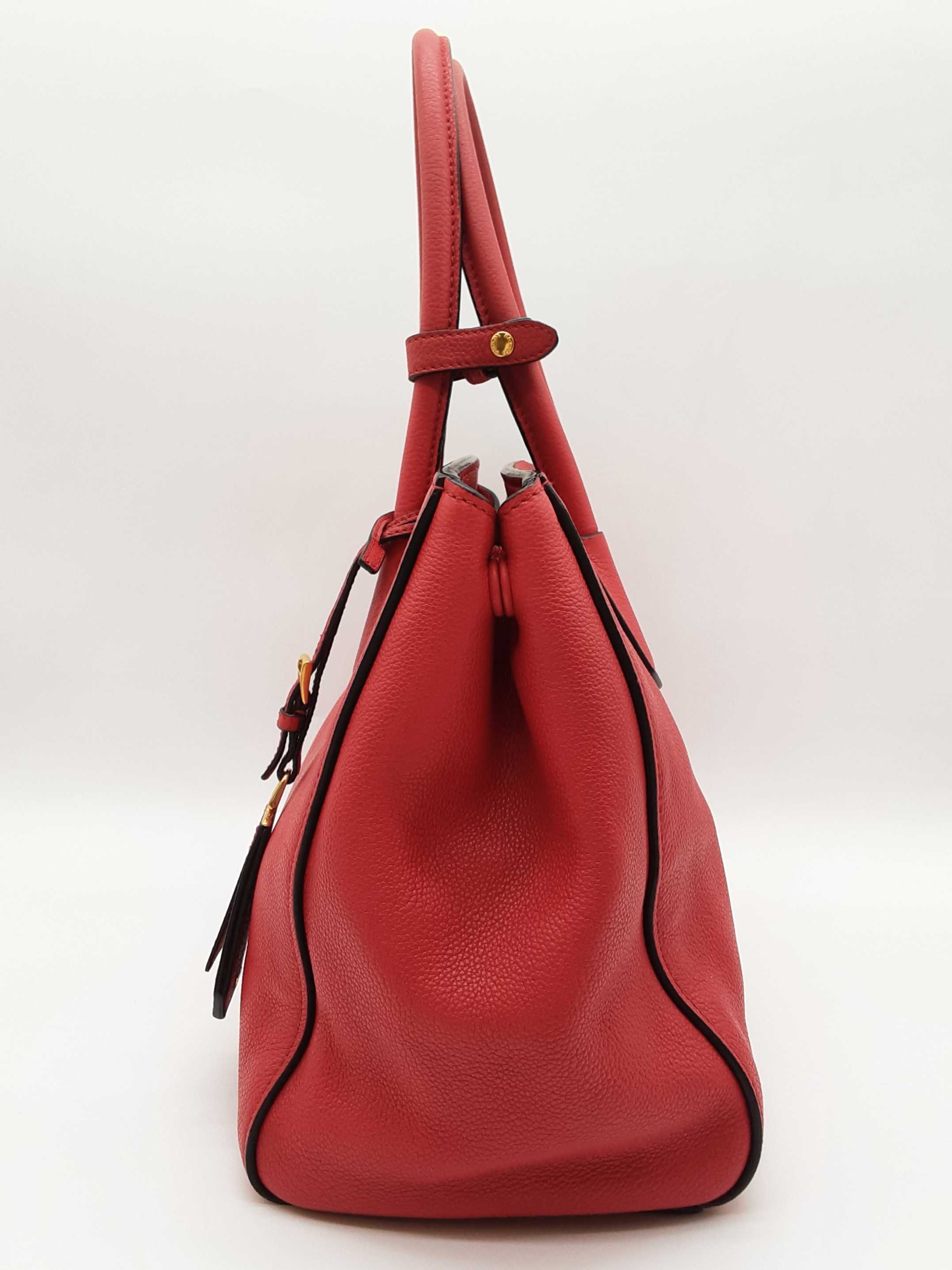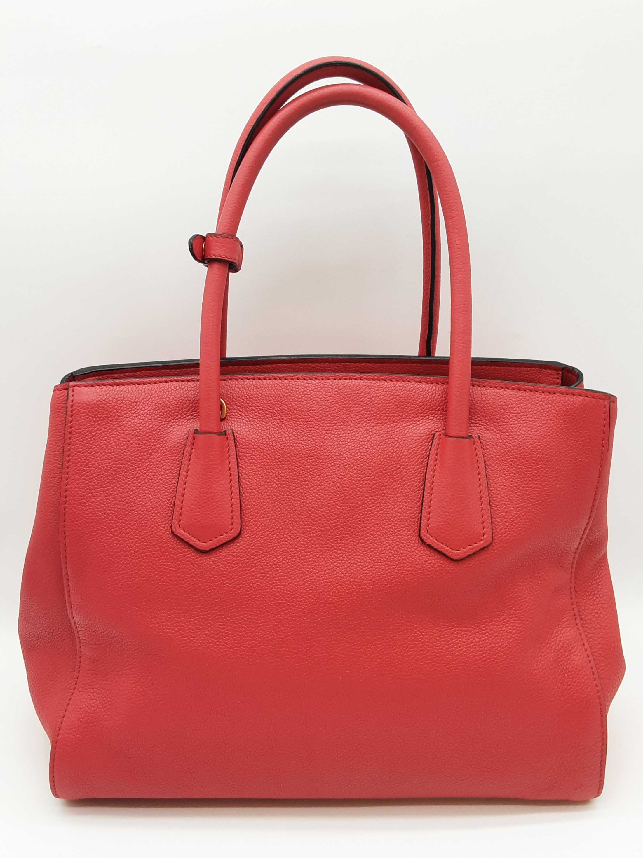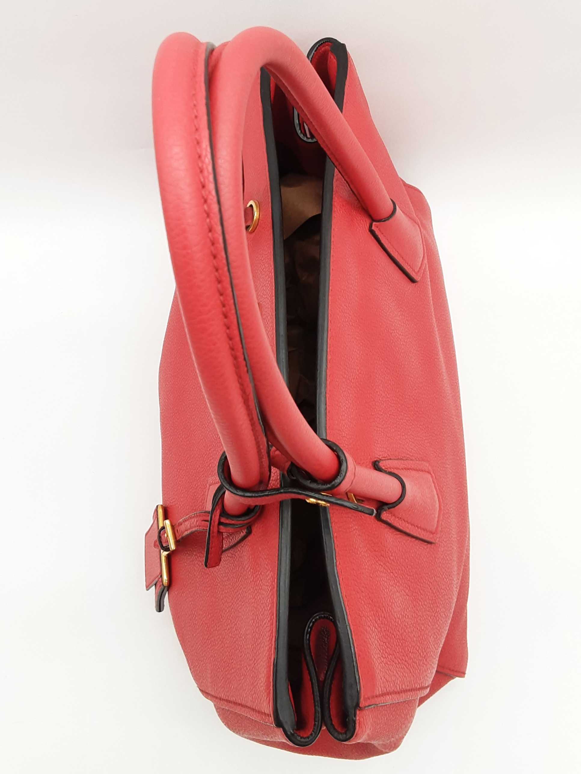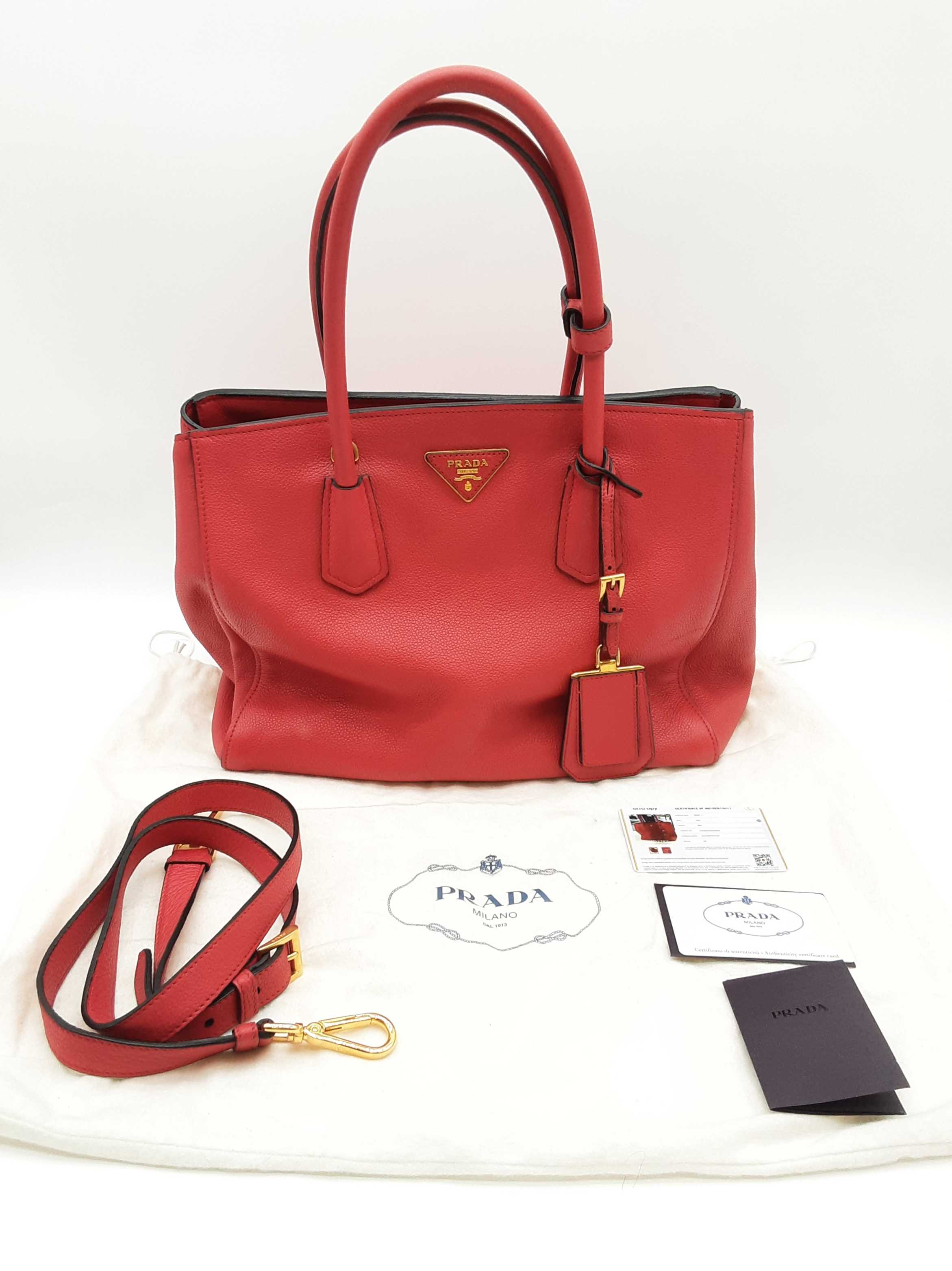 144020034281Prada 2 Way Red Vitello Daino Leather Tote Bag. Length 13 IN X Height 10 IN X Width 6 IN X Handle Drop 6.5 IN. Strap Drop 20 to 22 IN. Style #BN2829. Entrupy Certificate #H4D278Y. Pre-Owned - Good Condition with creases, bag misshappen, scratches and wear on metal hardware, and scratches on exterior.
