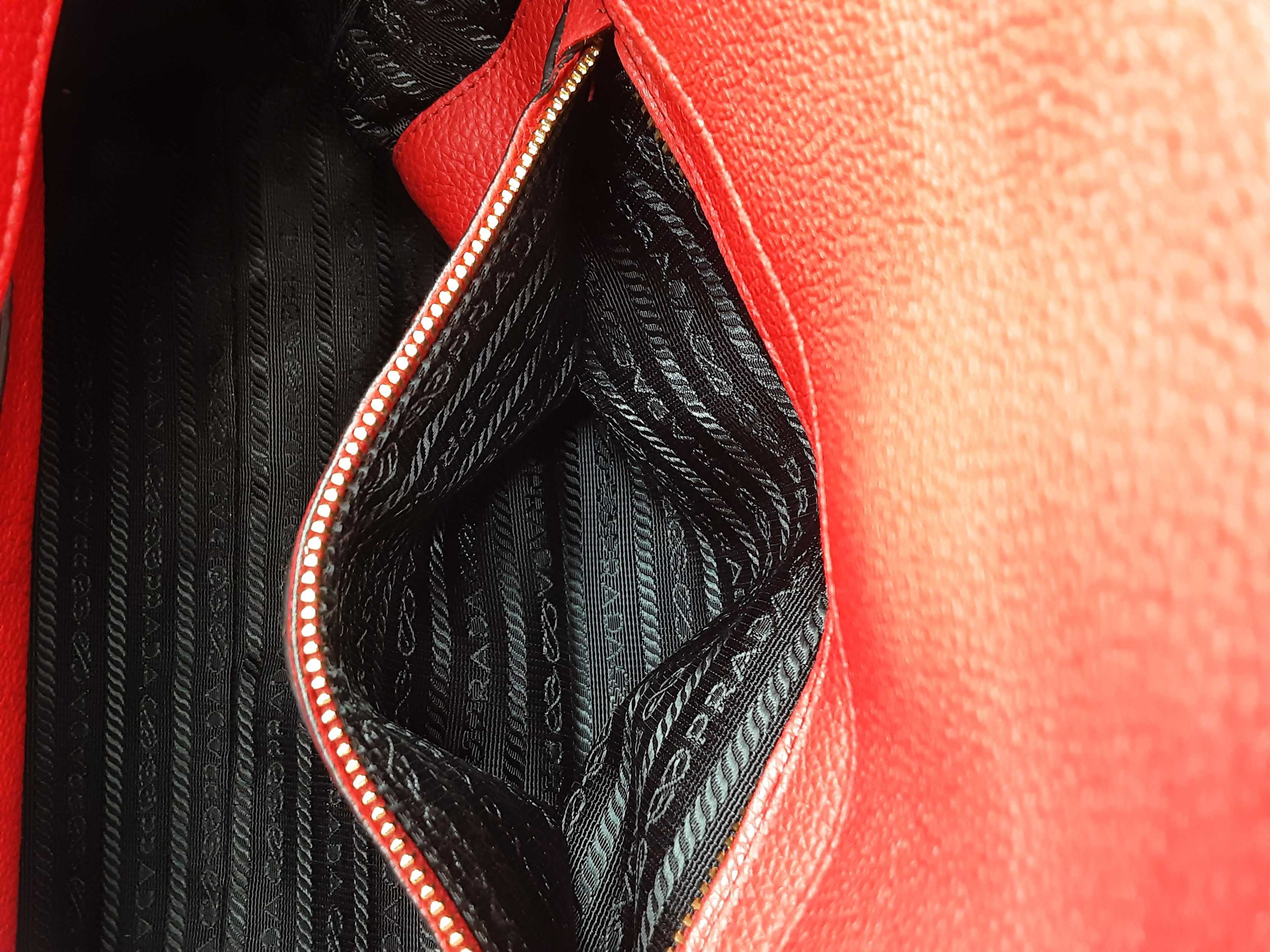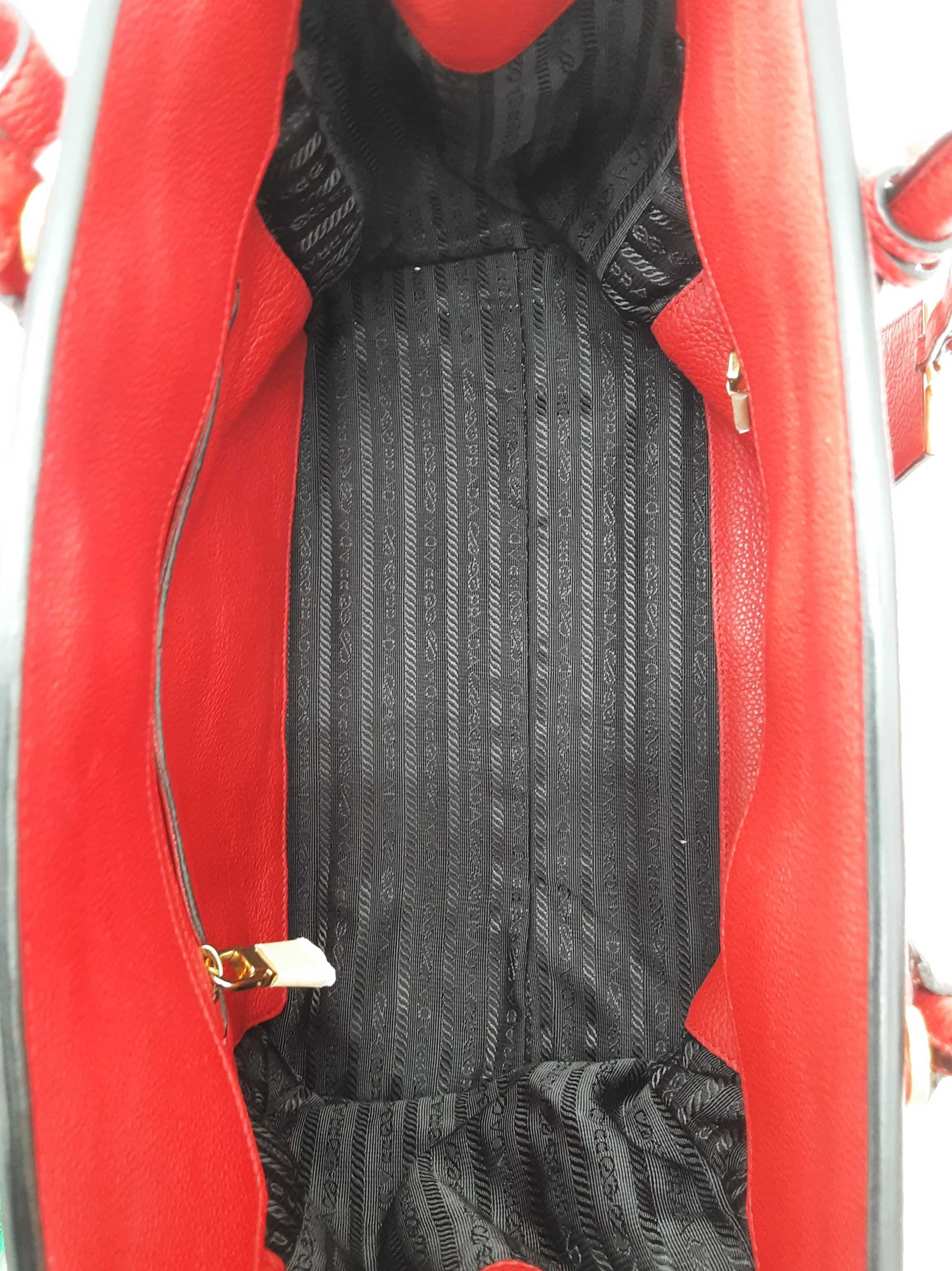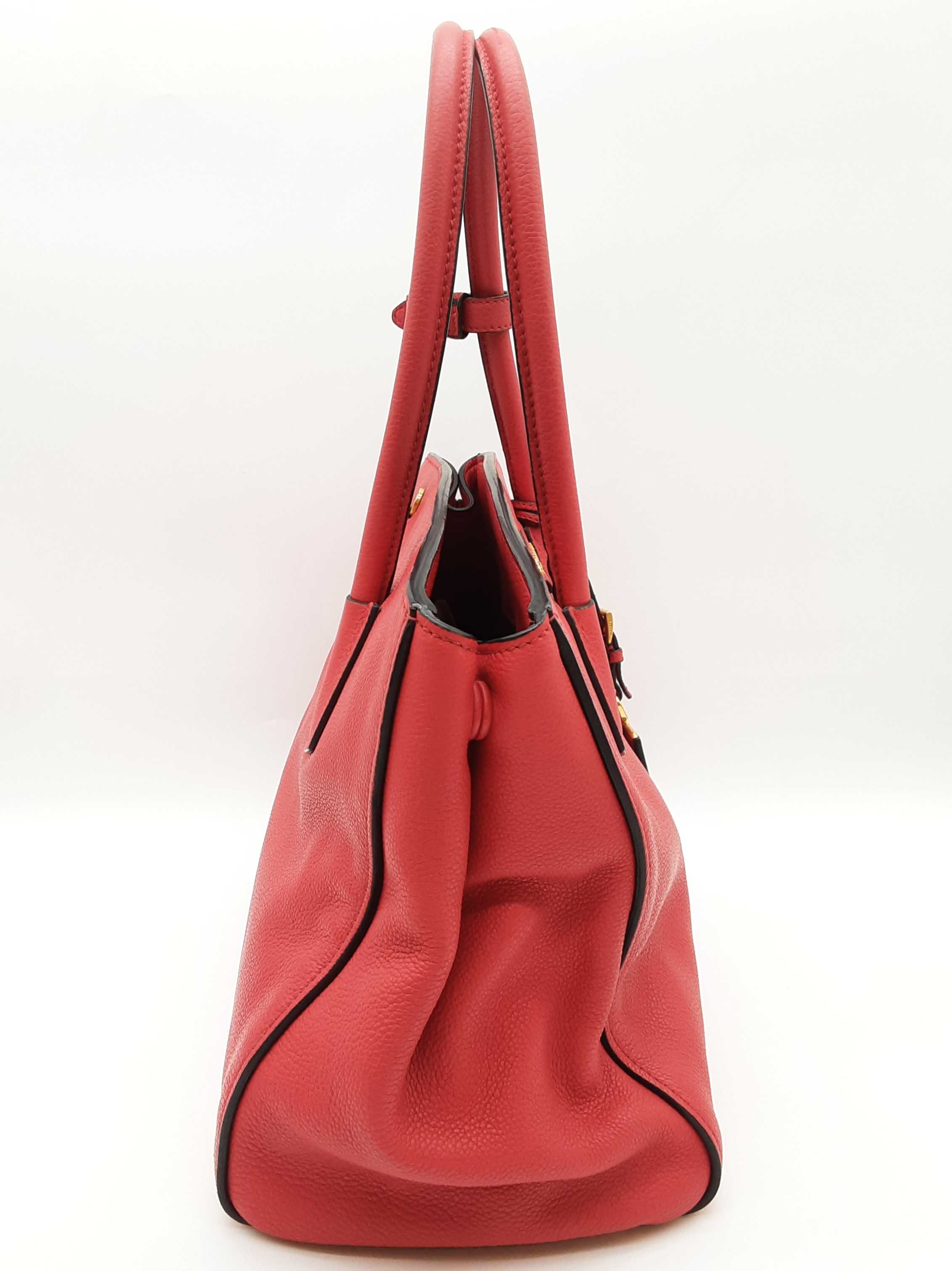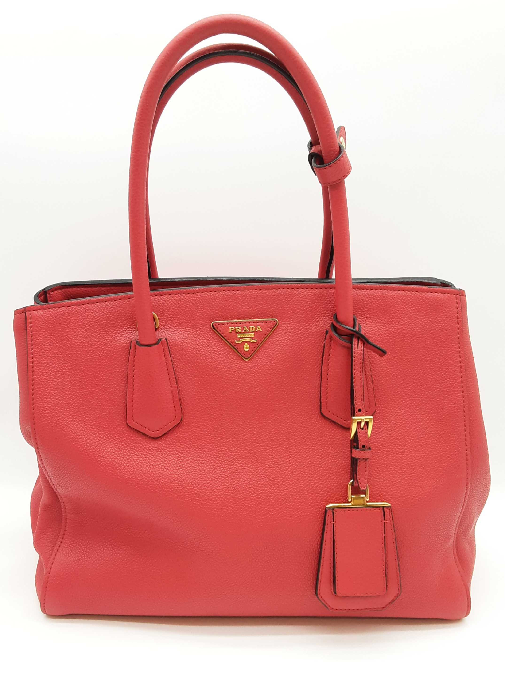 144020034281Prada 2 Way Red Vitello Daino Leather Tote Bag. Length 13 IN X Height 10 IN X Width 6 IN X Handle Drop 6.5 IN. Strap Drop 20 to 22 IN. Style #BN2829. Entrupy Certificate #H4D278Y. Pre-Owned - Good Condition with creases, bag misshappen, scratches and wear on metal hardware, and scratches on exterior.
