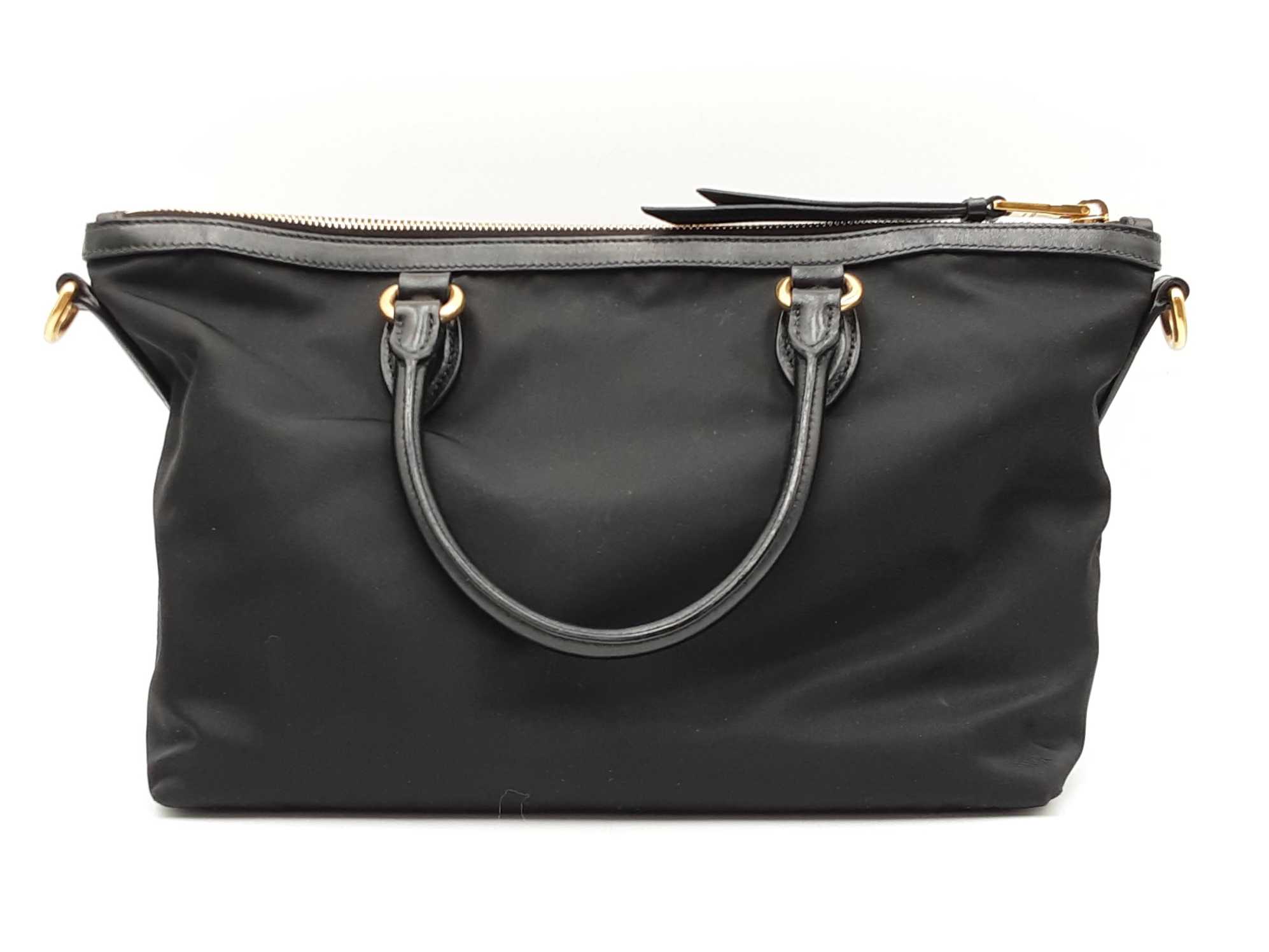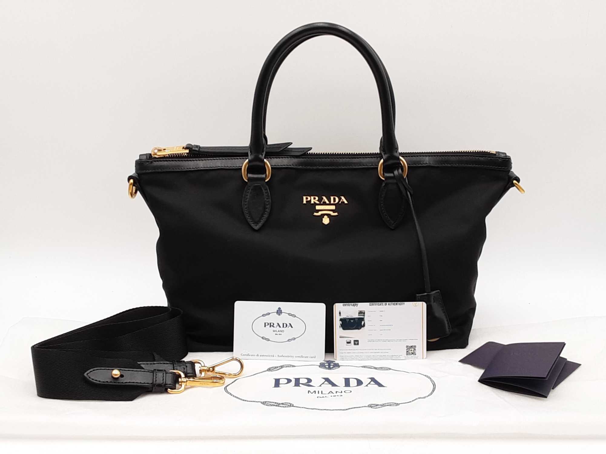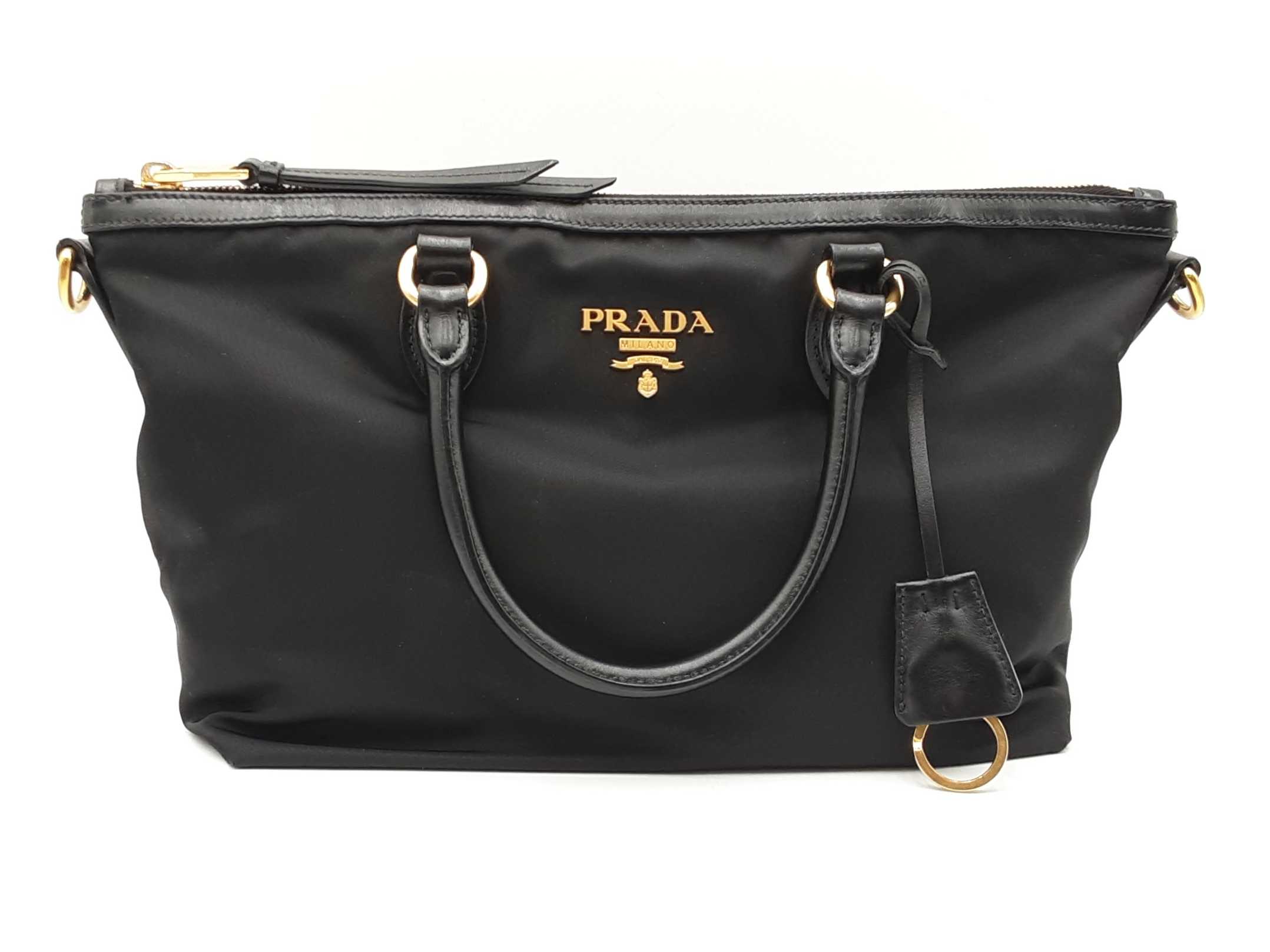 144030028295Prada 2-Way Satchel In Satchel In Black Tessuto Nylon & Leather. Gold-Tone Hardware. Base Length 11 IN X Height 7.25 IN X Base Width 5.5 IN X Handle Drop 4.5 IN X Strap Drop 18 IN, approximately. Excellent Pre-Owned Condition. Scratches on hardware. Discolorations on dust bag. Entrupy Certificate # GCVM7H4