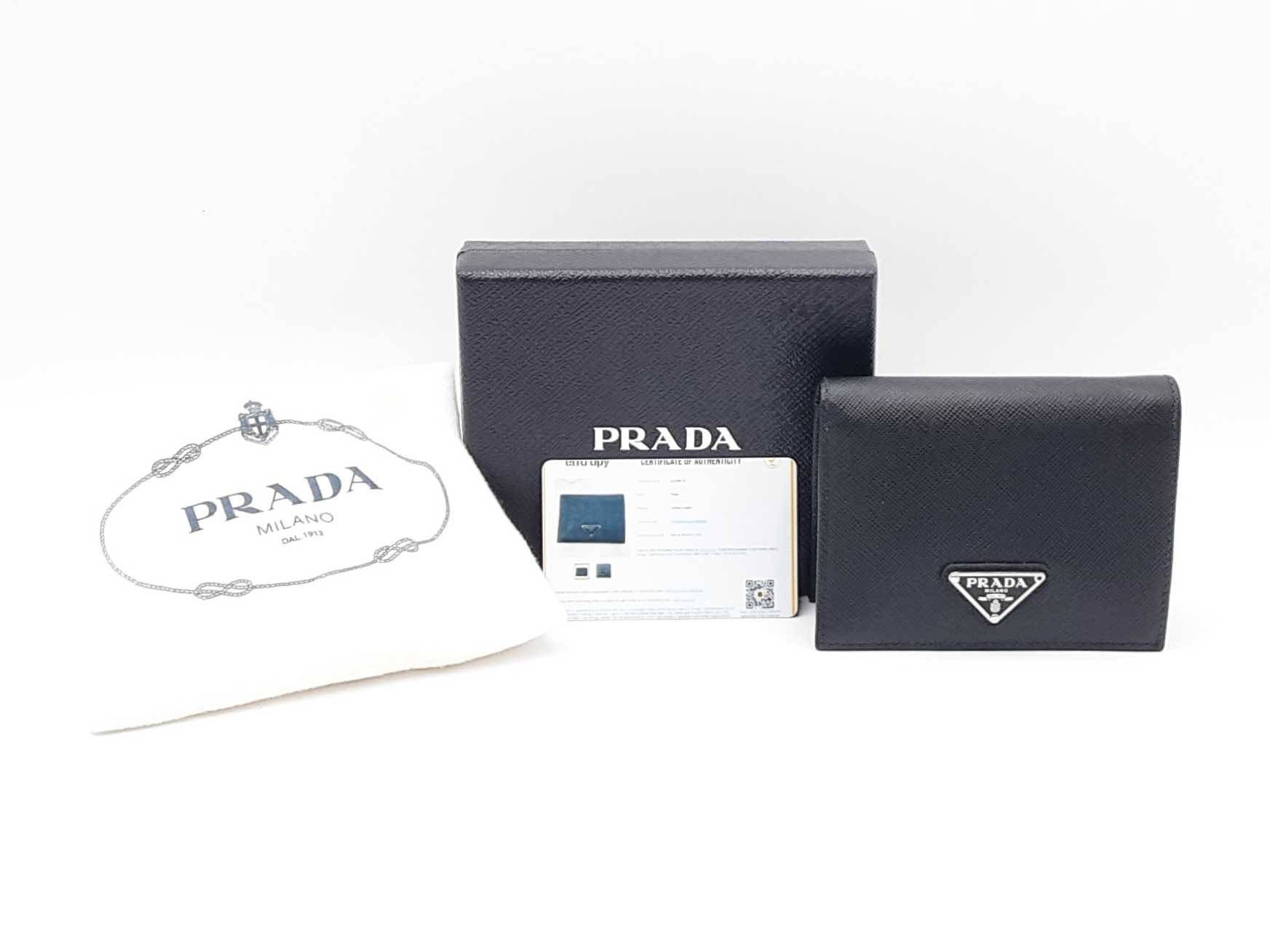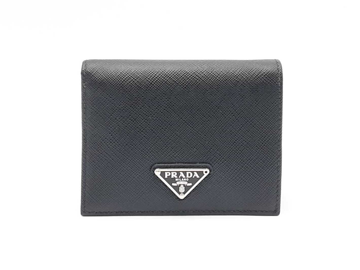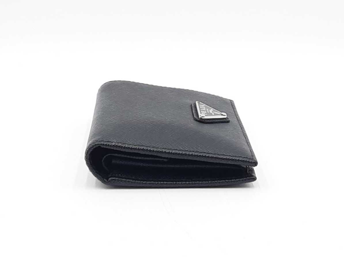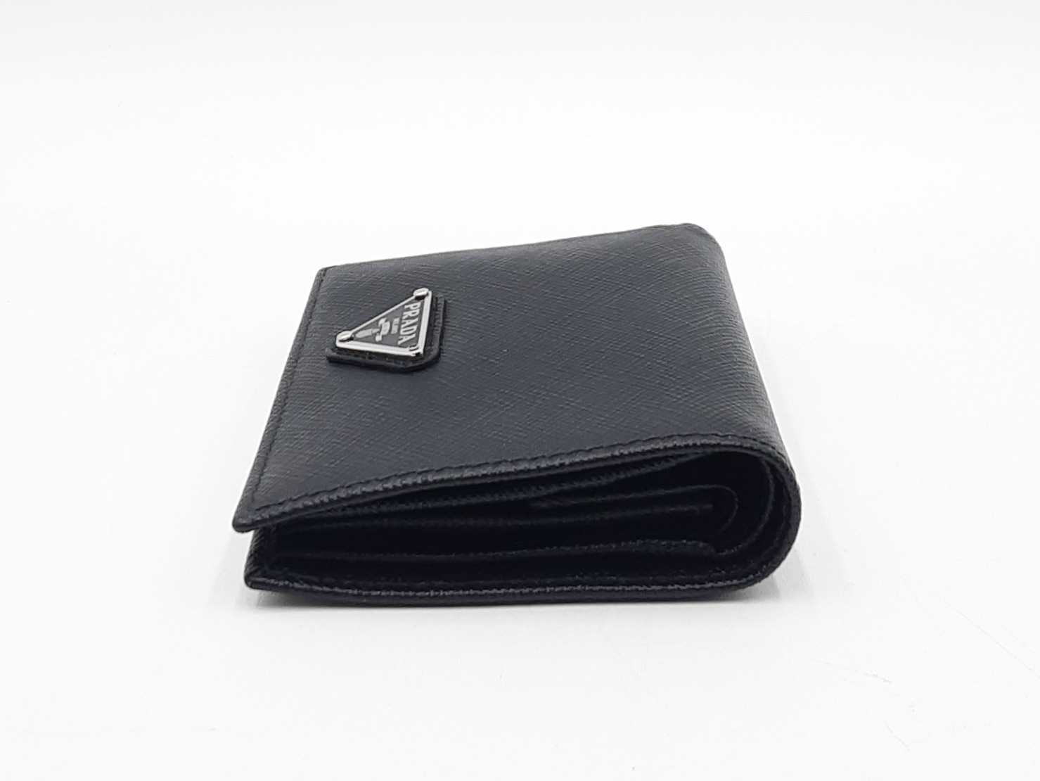 144030017692Prada Black Saffiano Leather Compact Bifold Wallet. Silver-Tone Hardware. Height 3.5 x Length 4.5 x Width 1 inches, approximately. Great Pre-Owned Condition. Scratches on hardware. Small discoloration in coin pocket. Entrupy Certificate # KV4G86V