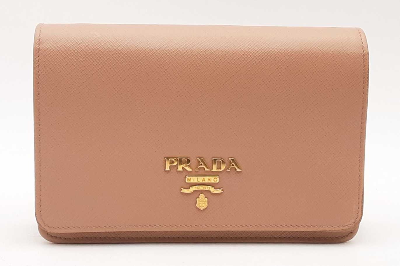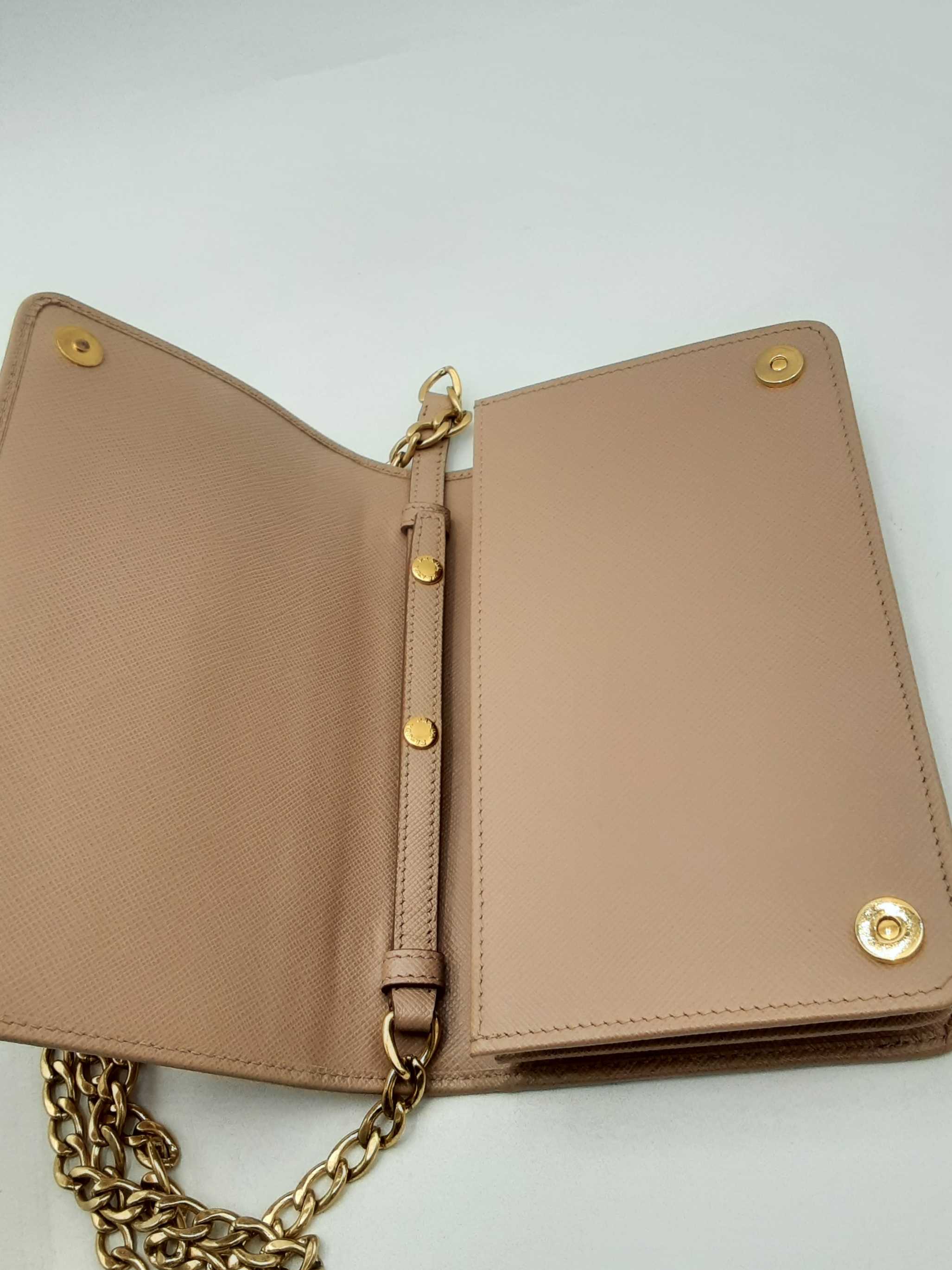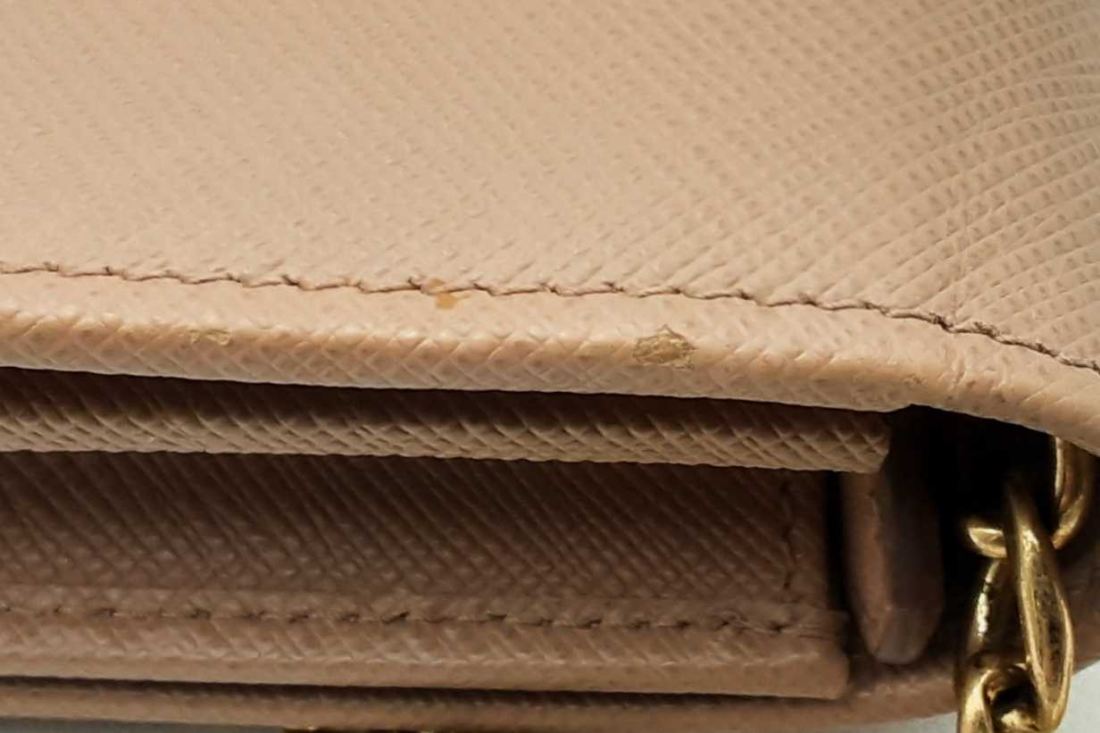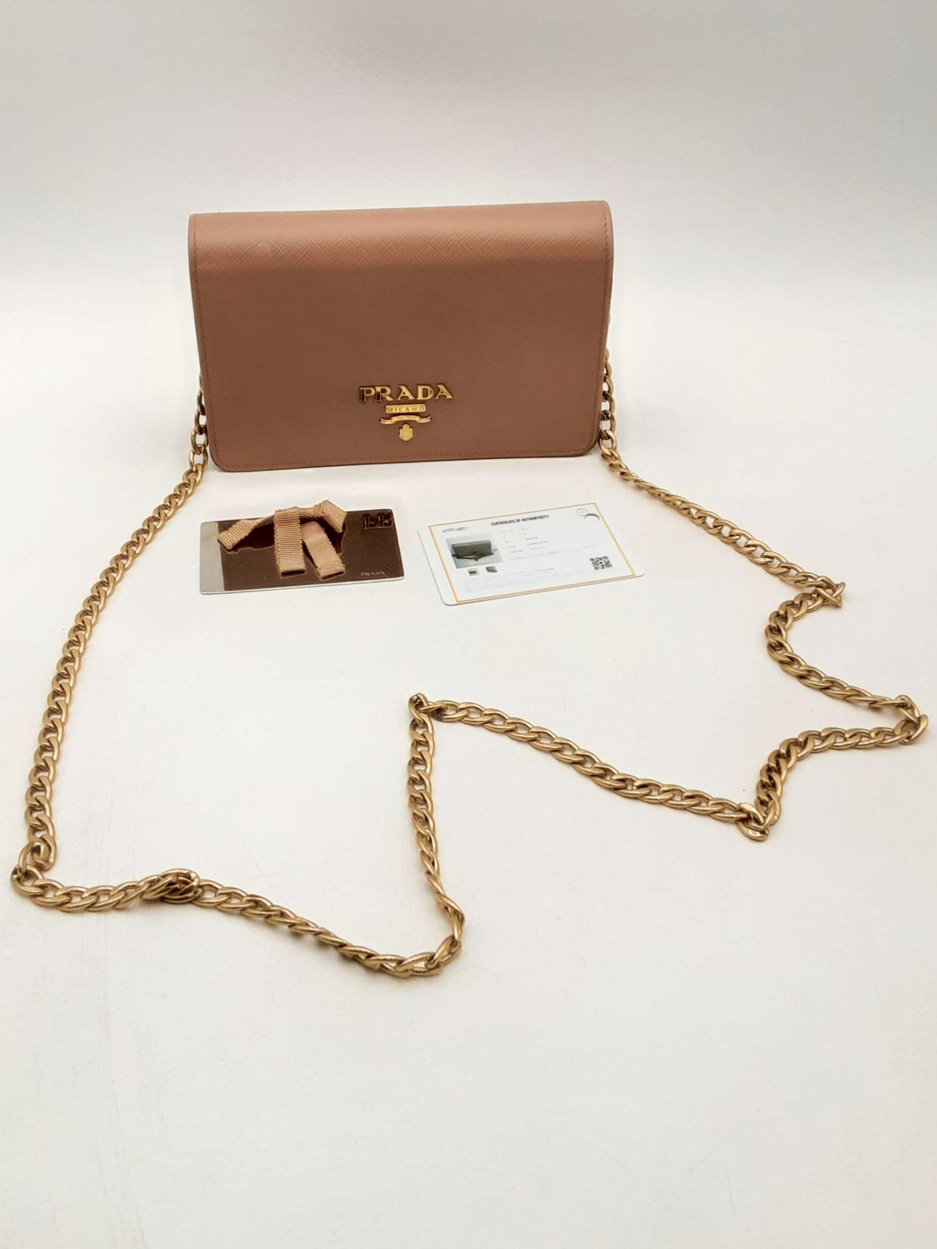 144010054720Prada Saffiano Leather Wallet On Chain Crossbody. Gold-Tone Hardware. Approximate measurements: Height 4.5 IN X Length 7 IN X Width 1.5 IN X Drop 23 IN. Good Pre-Owned Condition. Heavy and deep scratches on hardware with discoloration as well especially on the logo hardware. Damage on the corners as shown in photos. Discoloration spots on the exterior. Wear on the interior zipper pull. Dark marks inside the bag. Entrupy Certificate #3JDY3GX