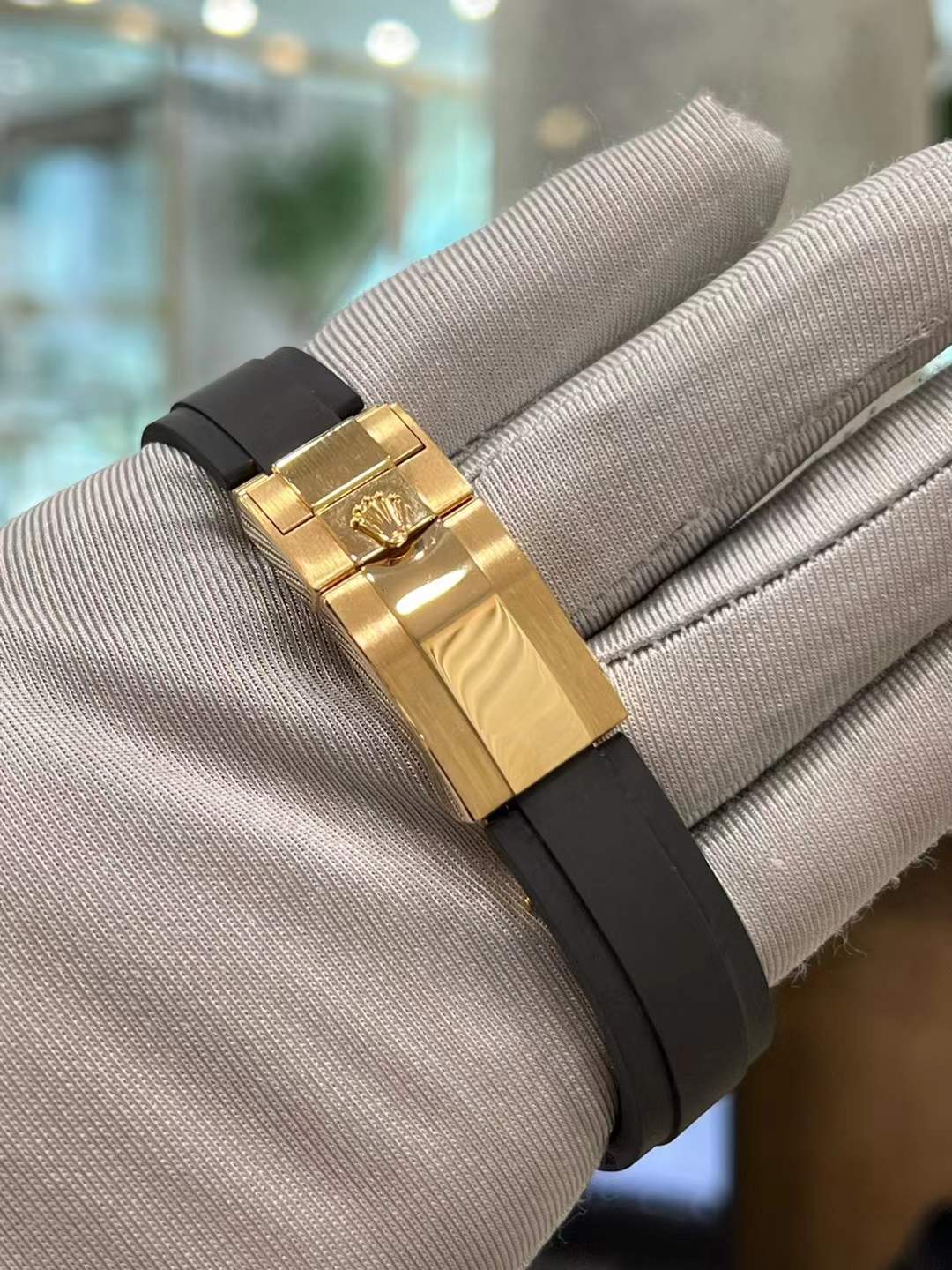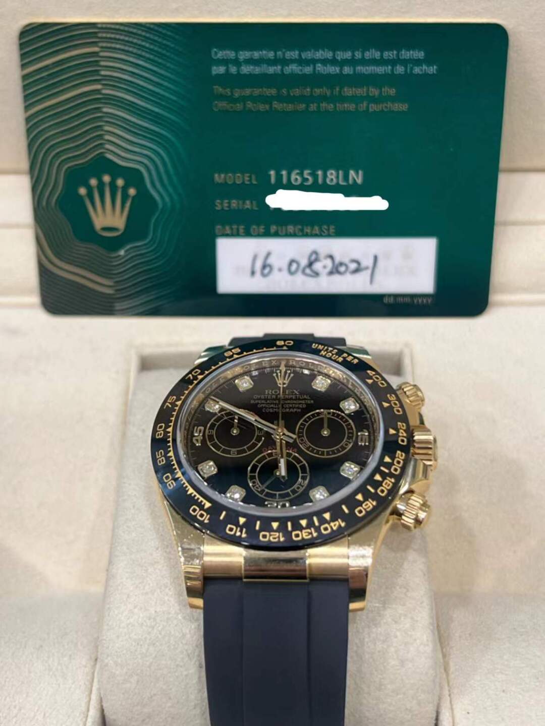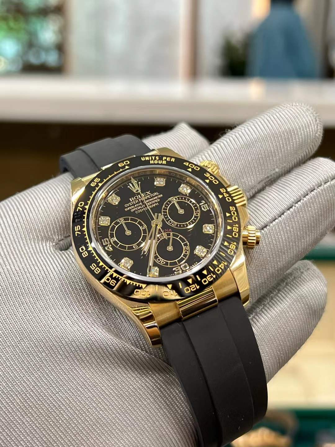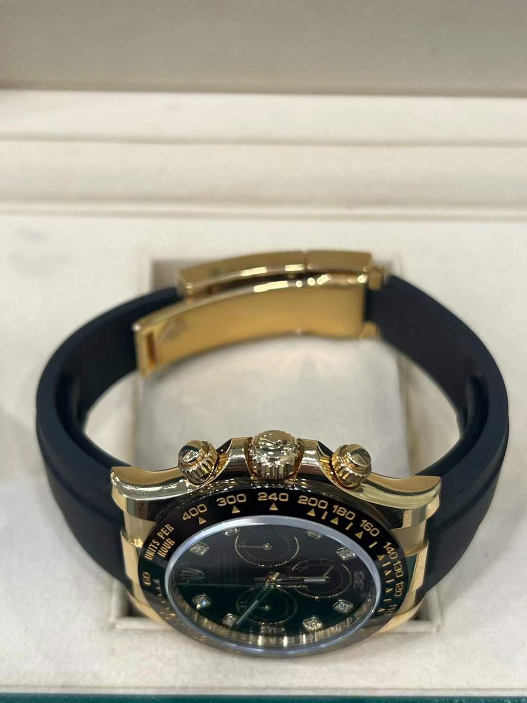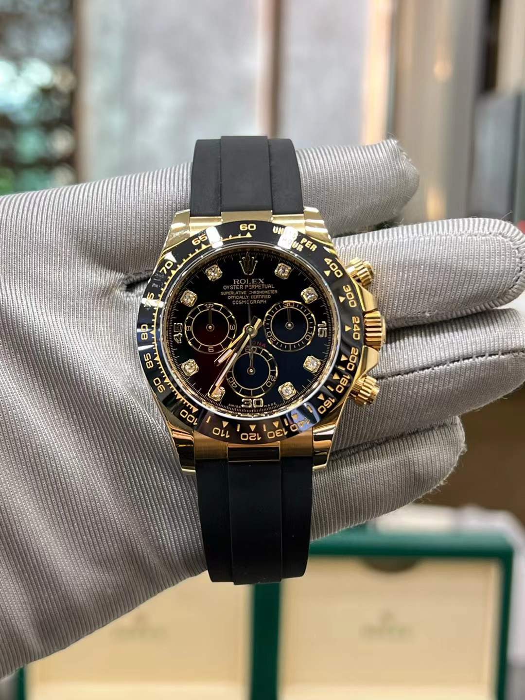 Rolex Cosmograph Daytona 116518LN men’s watch. Features a polished with brushed solid 18k yellow gold case and black elastomer Oysterflex bracelet. Black Cerachrom insert ceramic fixed bezel with engraved 60 minute scale and graduations. Black dial with luminescent hands and diamond hour markers. Chronograph with large central chronograph seconds hand, 30 minute counter sub-dial at 3 o’clock and 12 hour counter sub-dial at 9 o’clock. Small seconds sub-dial at 6 o’clock. Stop-seconds feature for precise time setting. Powered by the Rolex Caliber 4130 self-winding automatic COSC Superlative Chronometer certified movement which boasts a 72 hour power reserve. A scratch resistant sapphire crystal protects the dial. The case is round and 40mm in diameter. Solid case back. Screw down crown with Triplock triple waterproofness system. Screw down case back. Folding Oysterclasp deployment buckle with Easylink 5mm comfort extension link. Waterproof to 100 meters / 330 feet. Functions: hours, minutes, small seconds, chronograph. Luxury watch style. Swiss made.