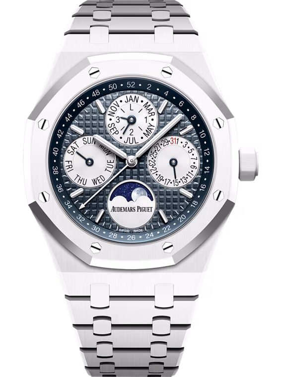 Brand new Audemars Piguet Royal Oak Perpetual Calendar, Reference # 26579CB.OO.1225CB.01, 41 mm White ceramic watch with all original accessories, original Audemars Piguet box and Audemars Piguet Warranty Card.