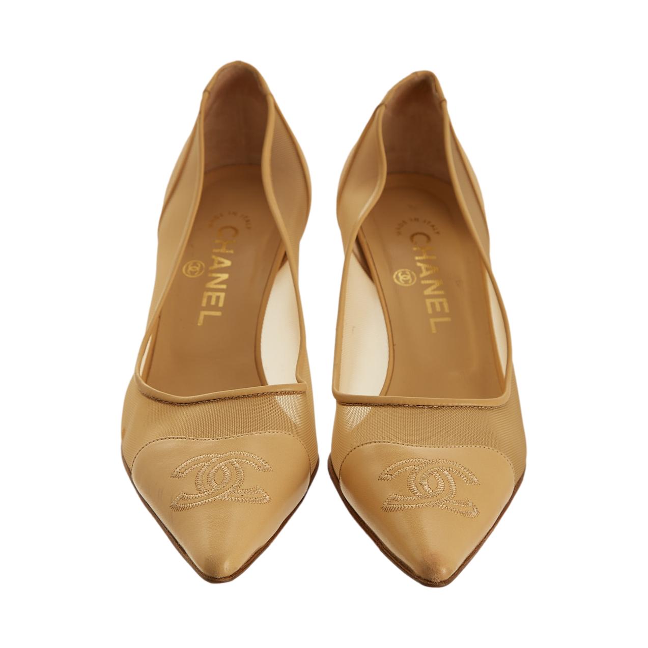 Chanel Tan Mesh Logo Heels
